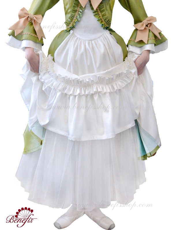 Нижний слой - подкладка на основе модели T0003. По низу, обработано рюшей, тесьмой, кружевом. Верхняя часть из полуэлостичной ткани (тафта) закрывающая часть нижней юбки.