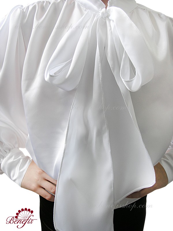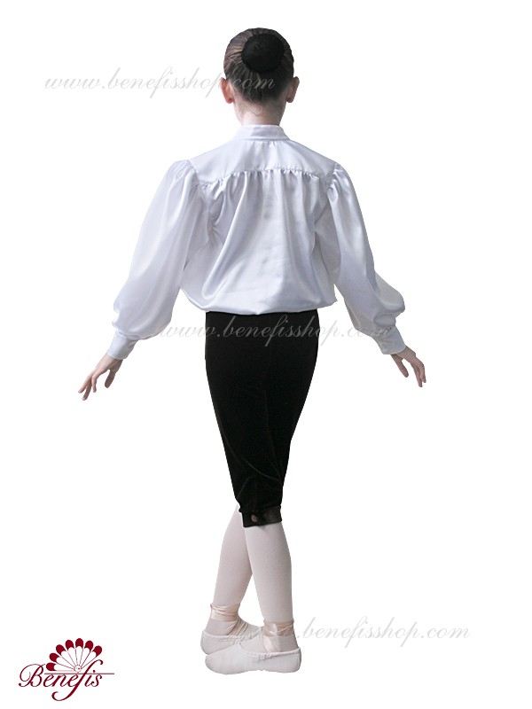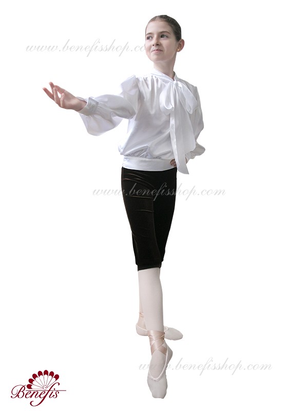 Концертный костюм выполнен из атласа в виде широкой свободной рубашки, на талии пояс, на рукавах манжеты,воротник выполнен в виде стойки переходящий в бант. Бриджи выполнены из бархата.