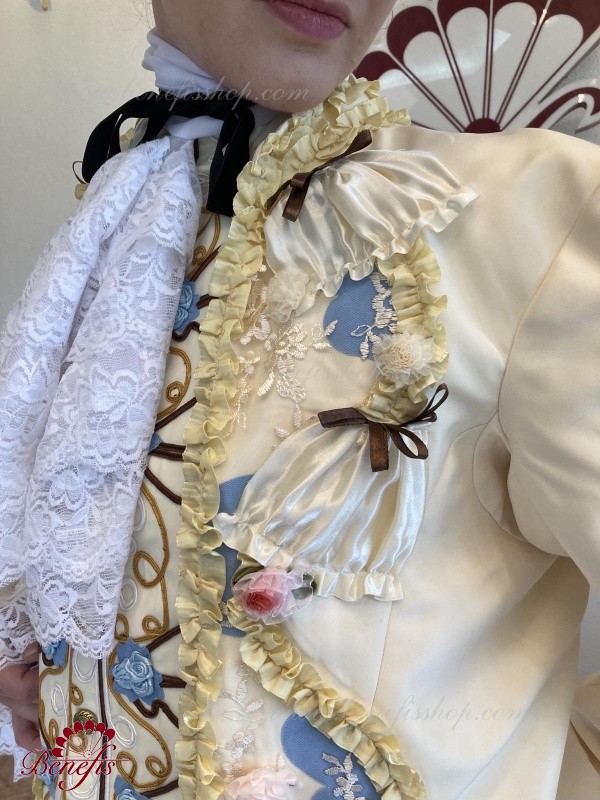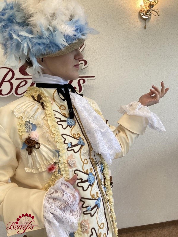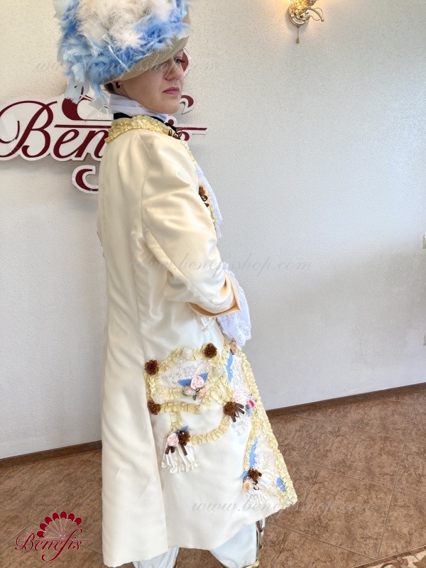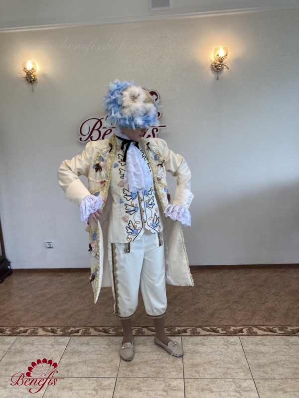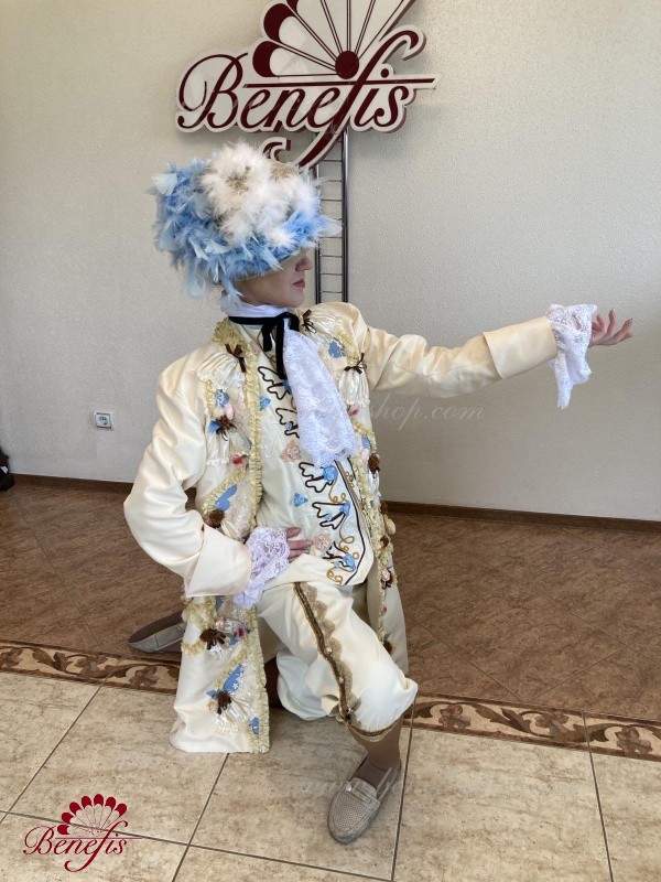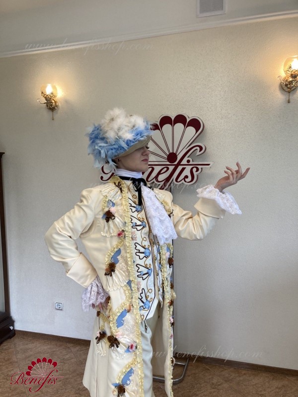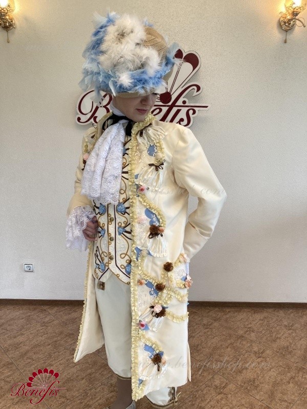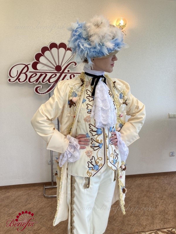 Детали: камзол, жилет, бриджи. Без шляпы. Камзол изготовлен из атласа, бриджи из габардина, жилет из габардина и бифлекса, манишка с кружевным жабо из шифона.