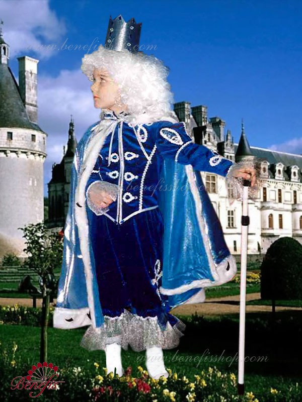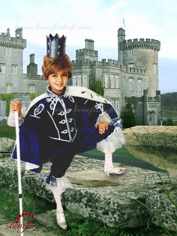 Костюм выполнен из мягкой полустрейчевой ткани. Камзол застегивается впереди на фермуар. Костюм украшен тесьмой, стразами. Рукава выполнены в виде буфов со вставками из сетчатых тканей. Манжеты на рукавах и на штанах пошиты из легкой прозрачной ткани. Пелерина на подкладке выполнена из блестящей ткани, оторочена мехом. Корона сделана из картона, обклеенного блестящей бумагой.