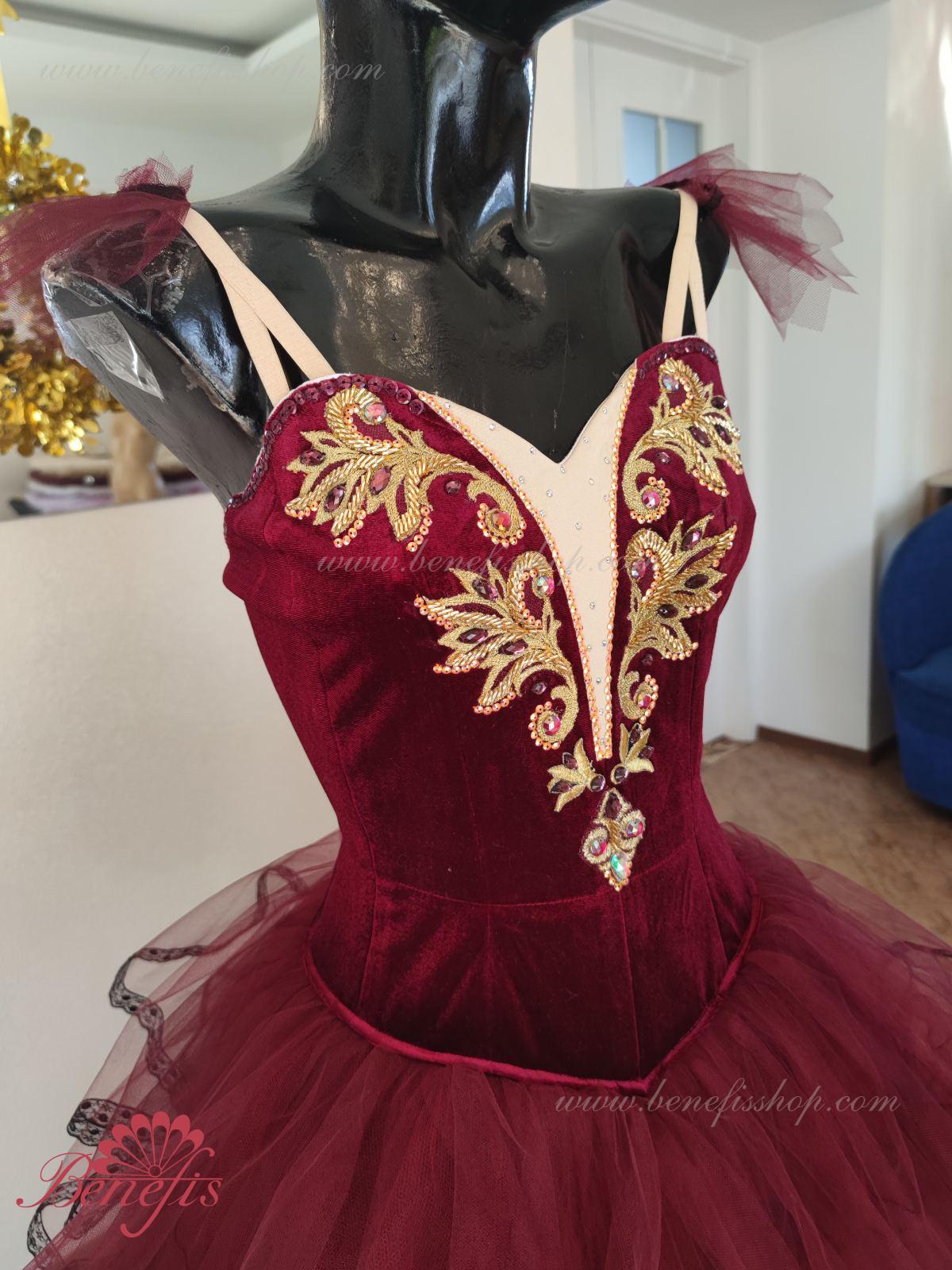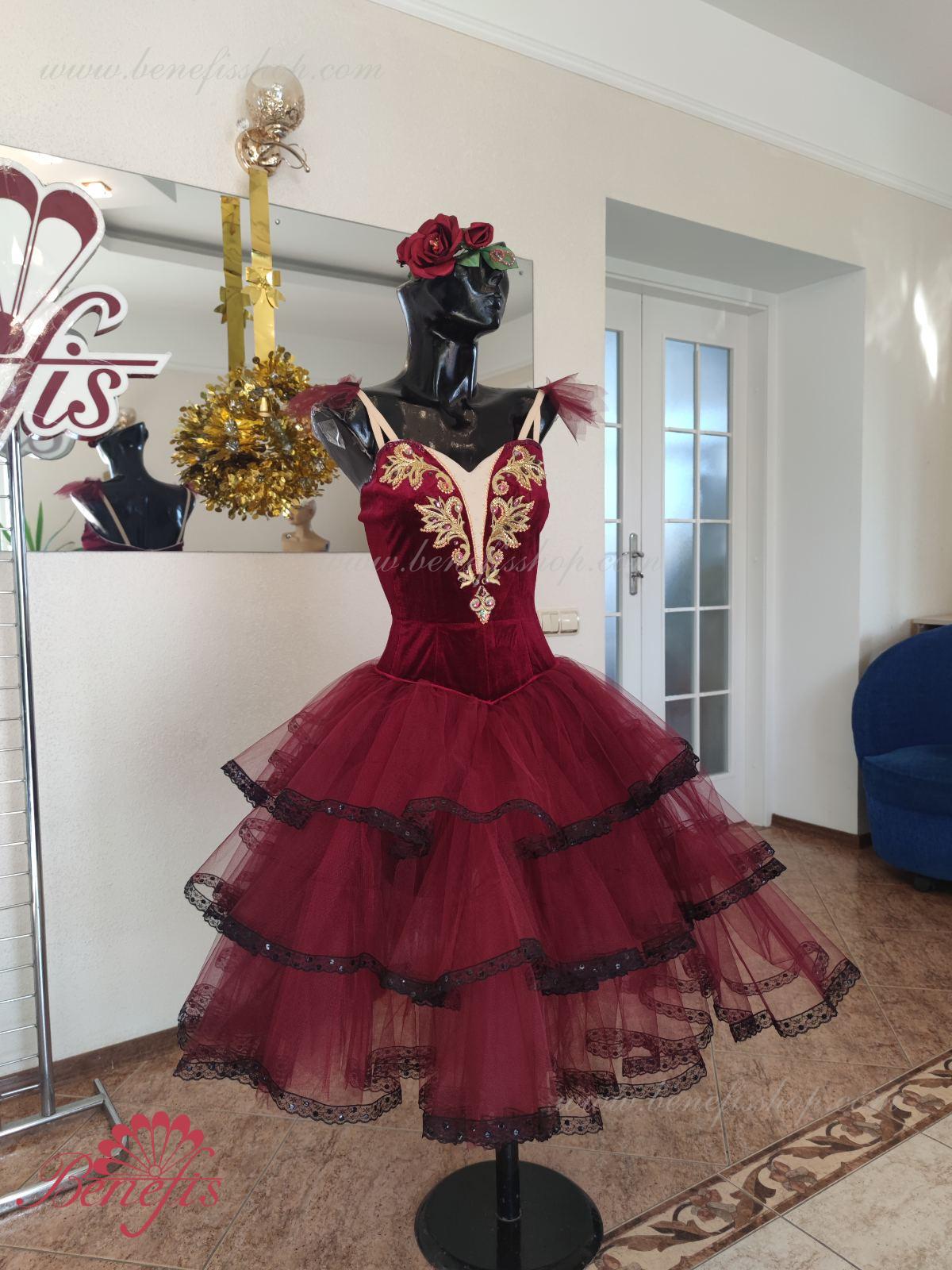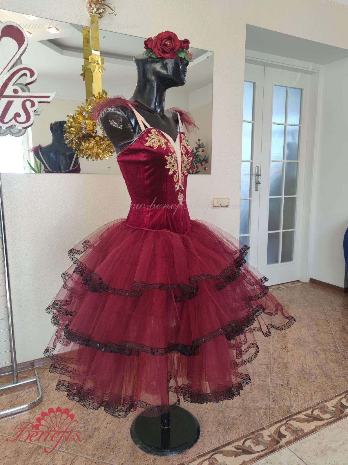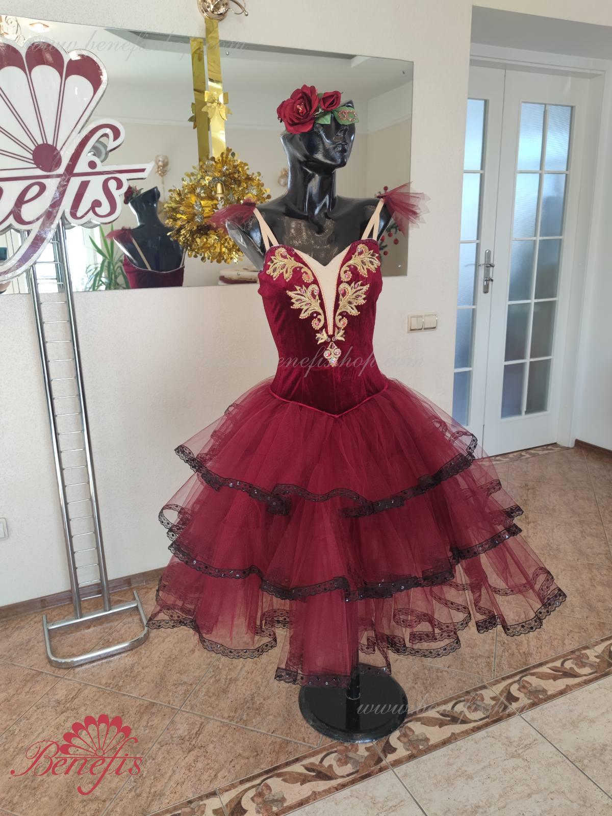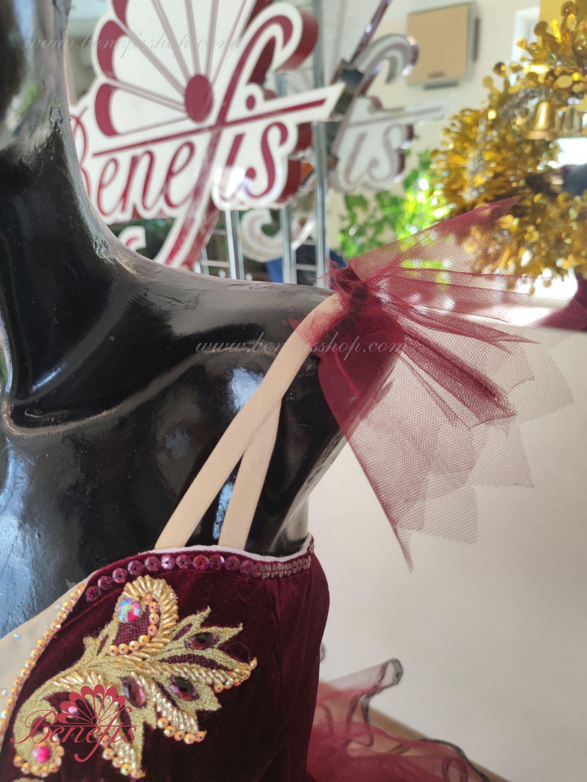 Профессиональный сценический костюм основан на базовом лифе Т 0009 из полу эластичного бархата. Застегиваются сзади на два ряда крючков и петель. Для удобства лиф регулируется шнурком в области груди. Юбка выполнена из мягкого и жесткого фатина.