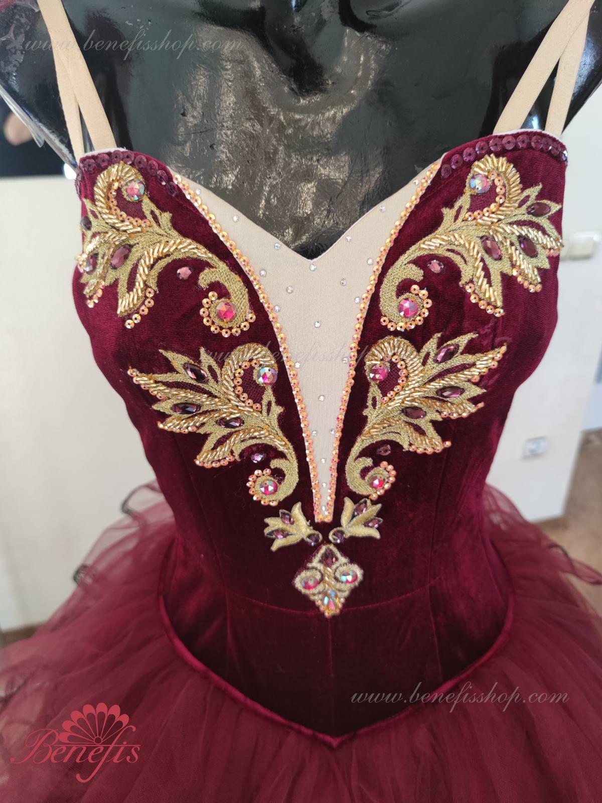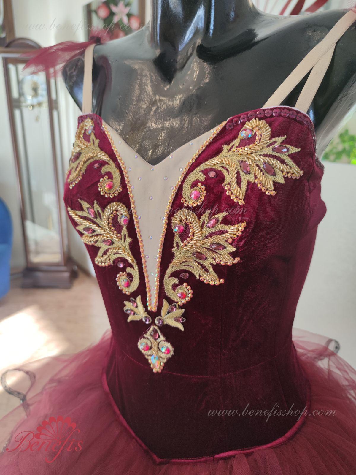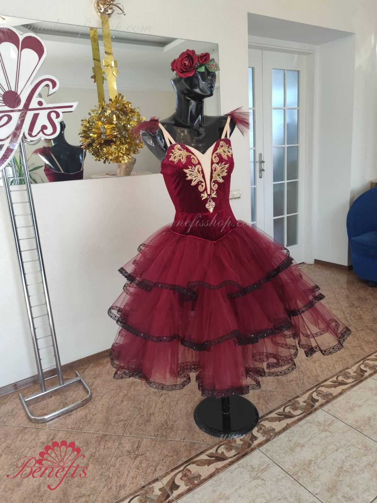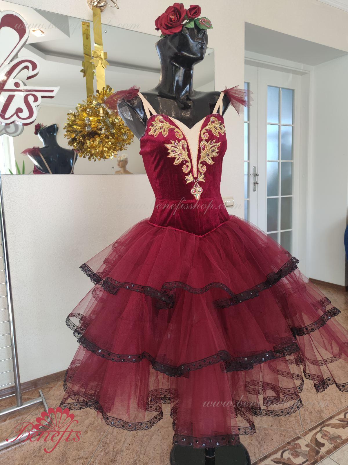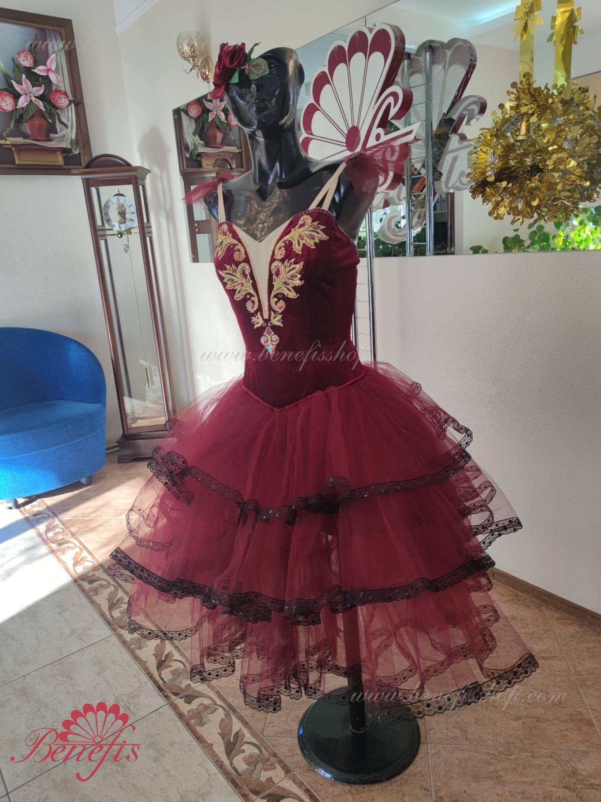 Профессиональный сценический костюм основан на базовом лифе Т 0009 из полу эластичного бархата. Застегиваются сзади на два ряда крючков и петель. Для удобства лиф регулируется шнурком в области груди. Юбка выполнена из мягкого и жесткого фатина.