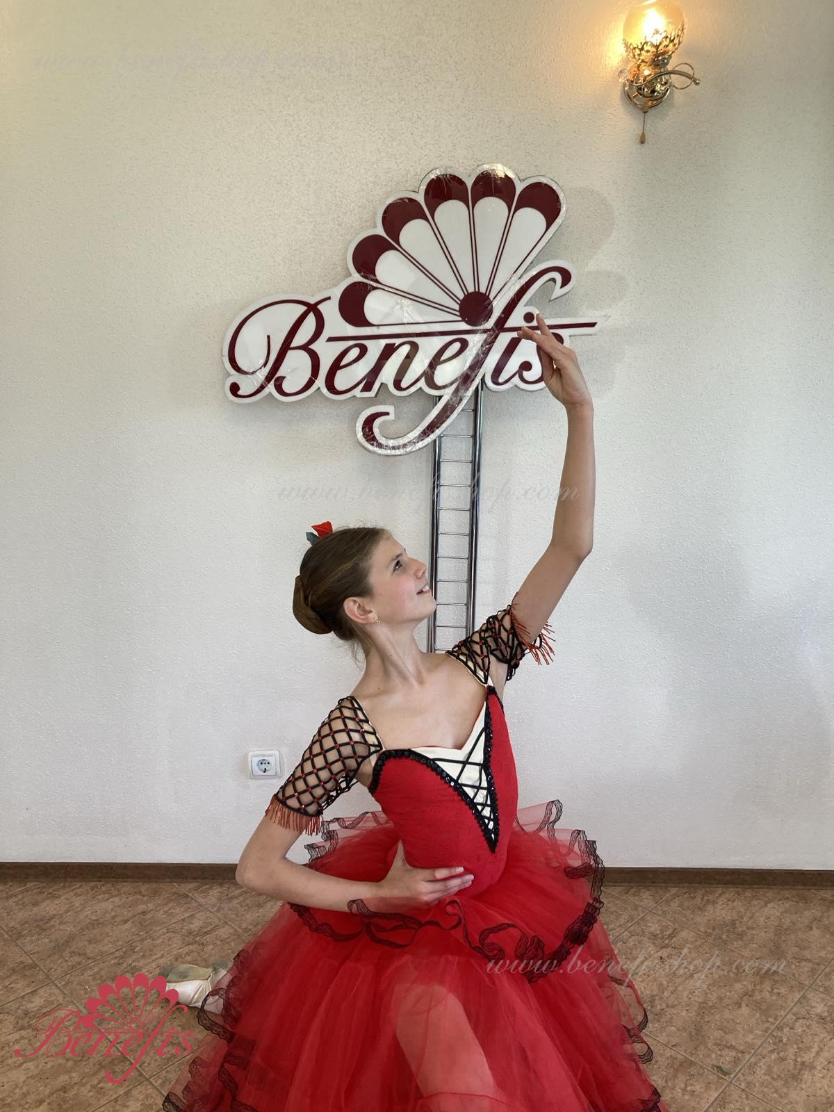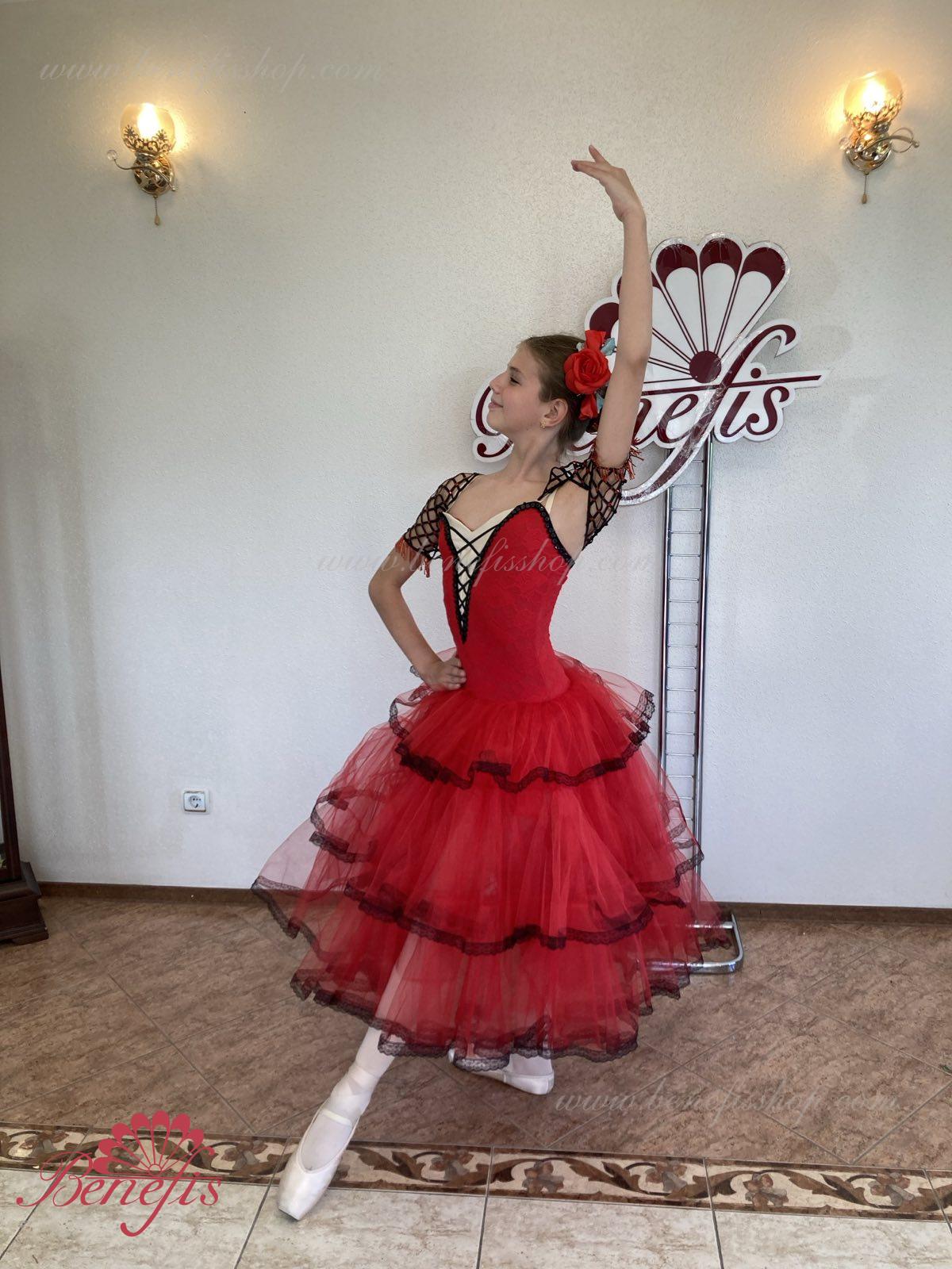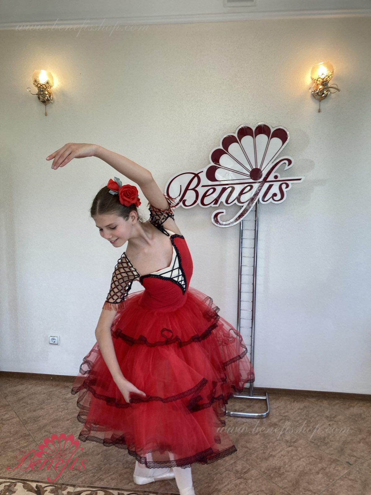Профессиональный сценический костюм выполнен на основе купальника. Купальник выполнен из эластичной ткани с V –образным мысиком. Юбка выполнена из мягкого и жесткого фатина. Верхний слой выполнен из трех оборок обработаны по краю тесьмой. В качестве декора используется аппликации, блестки, стразы.