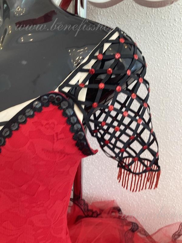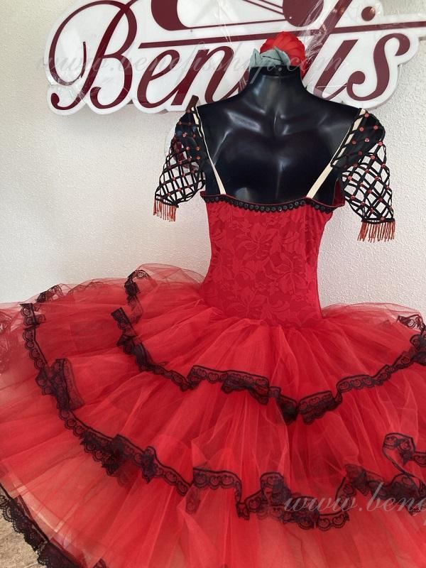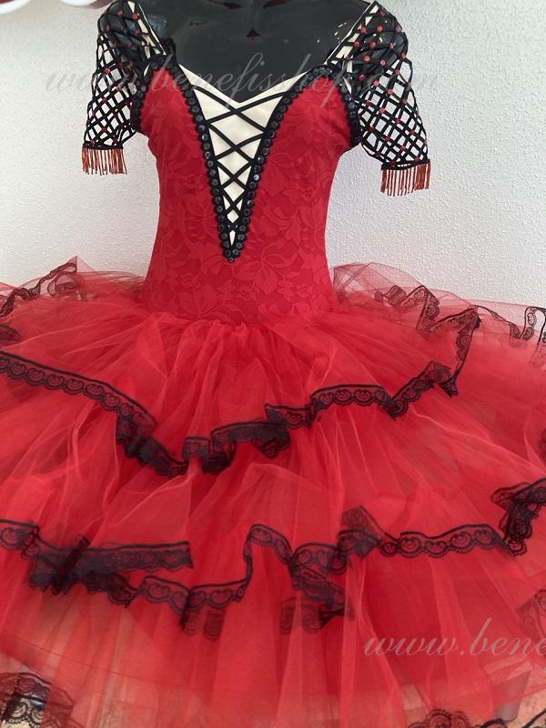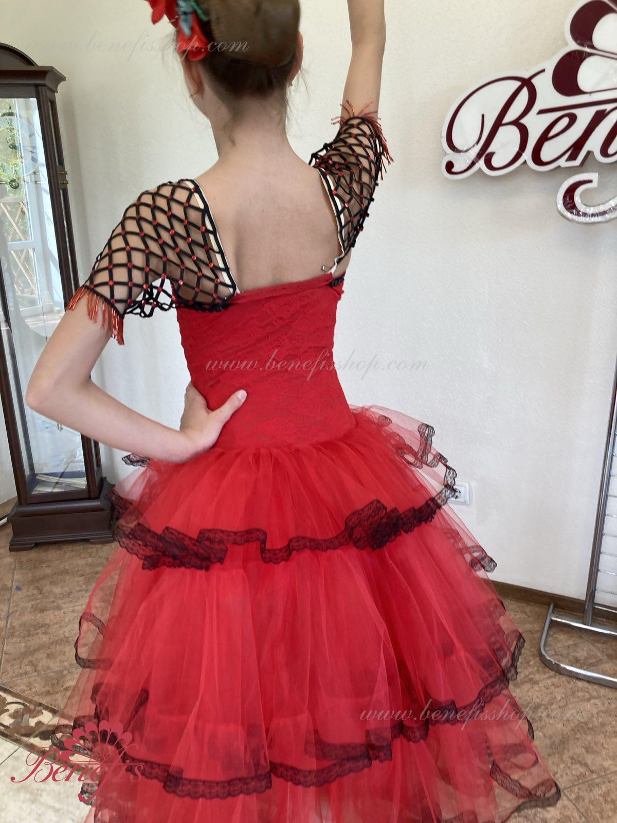 Профессиональный сценический костюм выполнен на основе купальника. Купальник выполнен из эластичной ткани с V –образным мысиком. Юбка выполнена из мягкого и жесткого фатина. Верхний слой выполнен из трех оборок обработаны по краю тесьмой. В качестве декора используется аппликации, блестки, стразы.