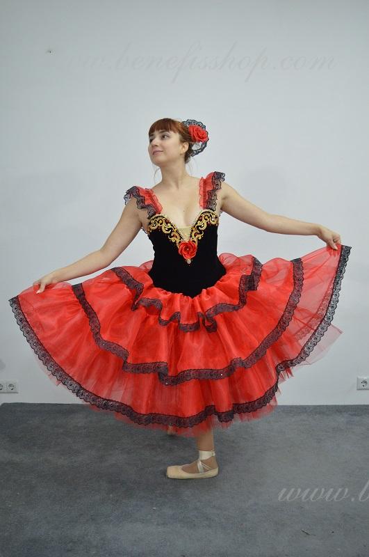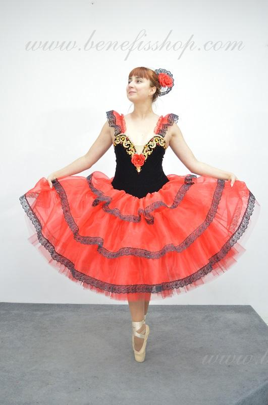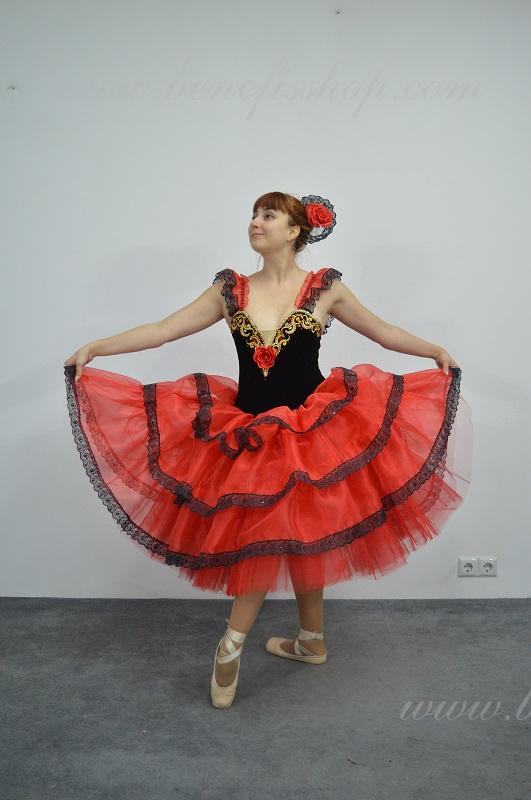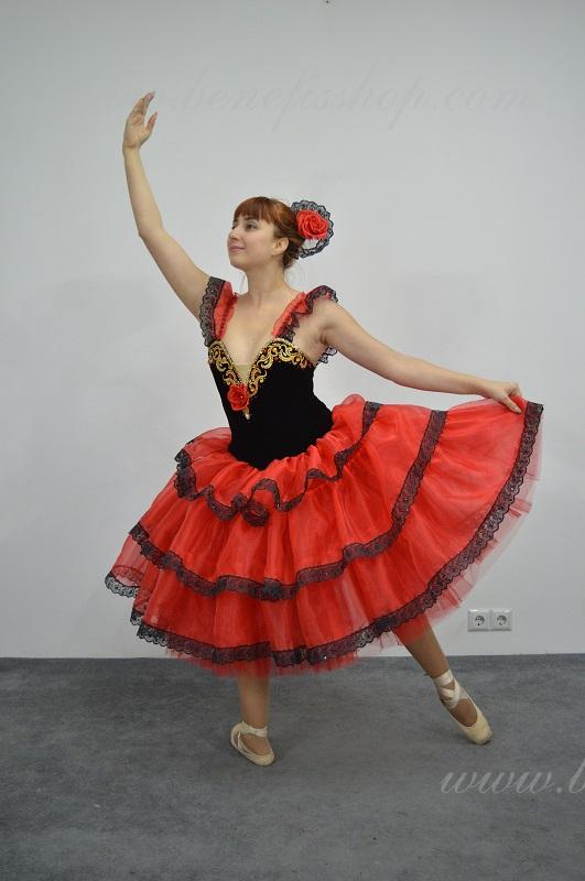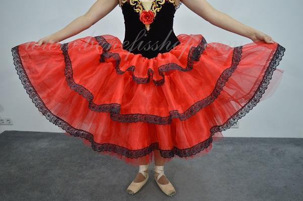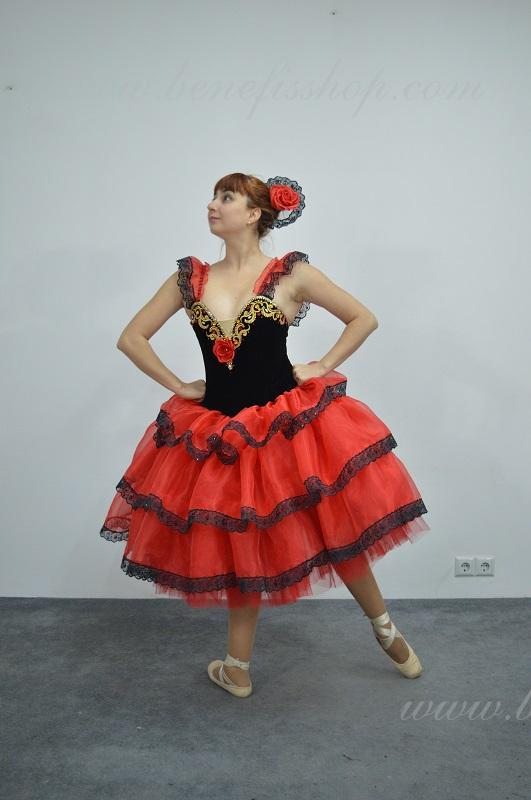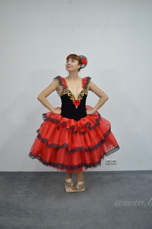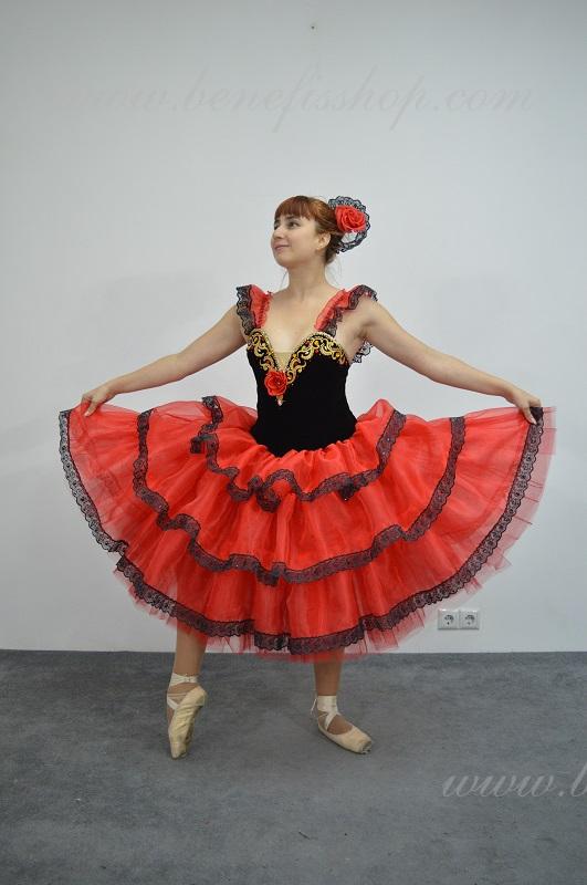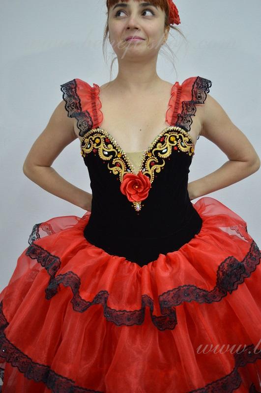 Это профессиональный сценический балетный костюм. Выполнен из полу эластичного бархата. Базовая модель лифа Т 0009 с мысиком телесного цвета. Верхний слой юбки оторочен тремя рюшами. Юбка от декорирована черной тесьмой, которая расшита черными пайетками. Лиф от декорирован блестящими аппликациями, блестками и стразами. Для удобного регулирования лиф застегивается на два ряда крючков и петель. В области груди лиф можно затянуть шнурком. Изящные рукава оторочены рюшей и покрывают плечи.