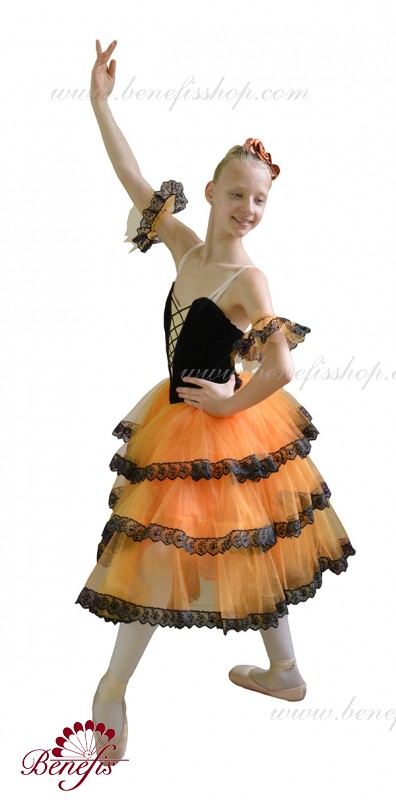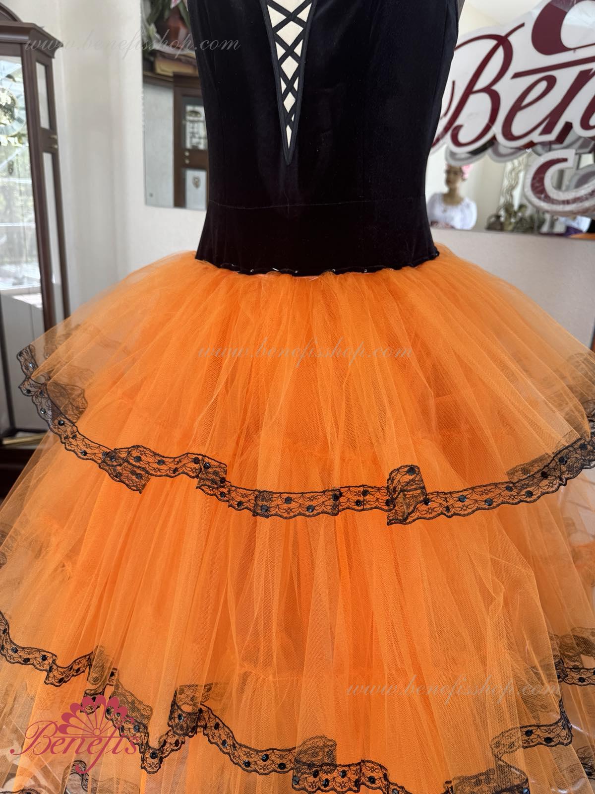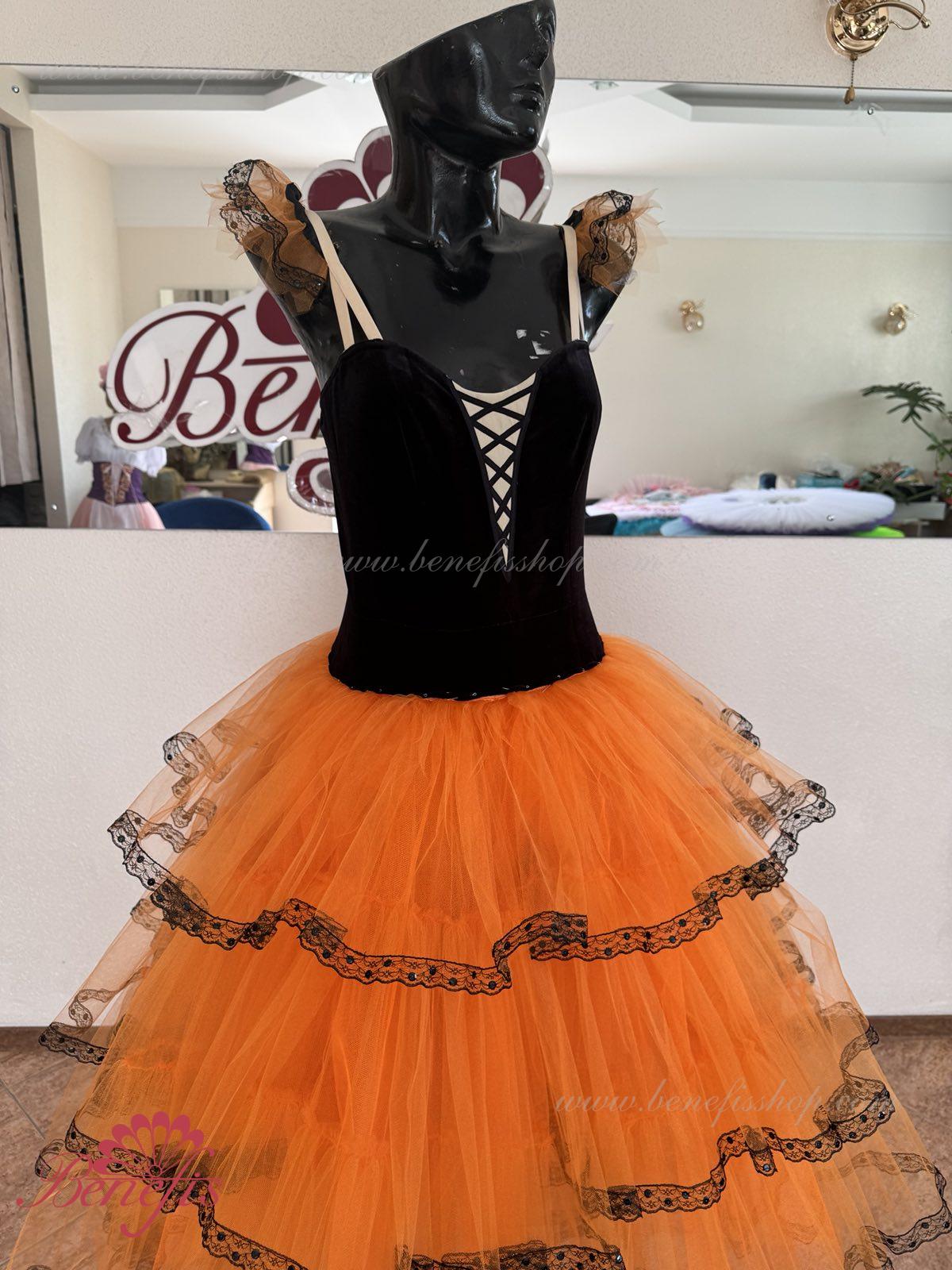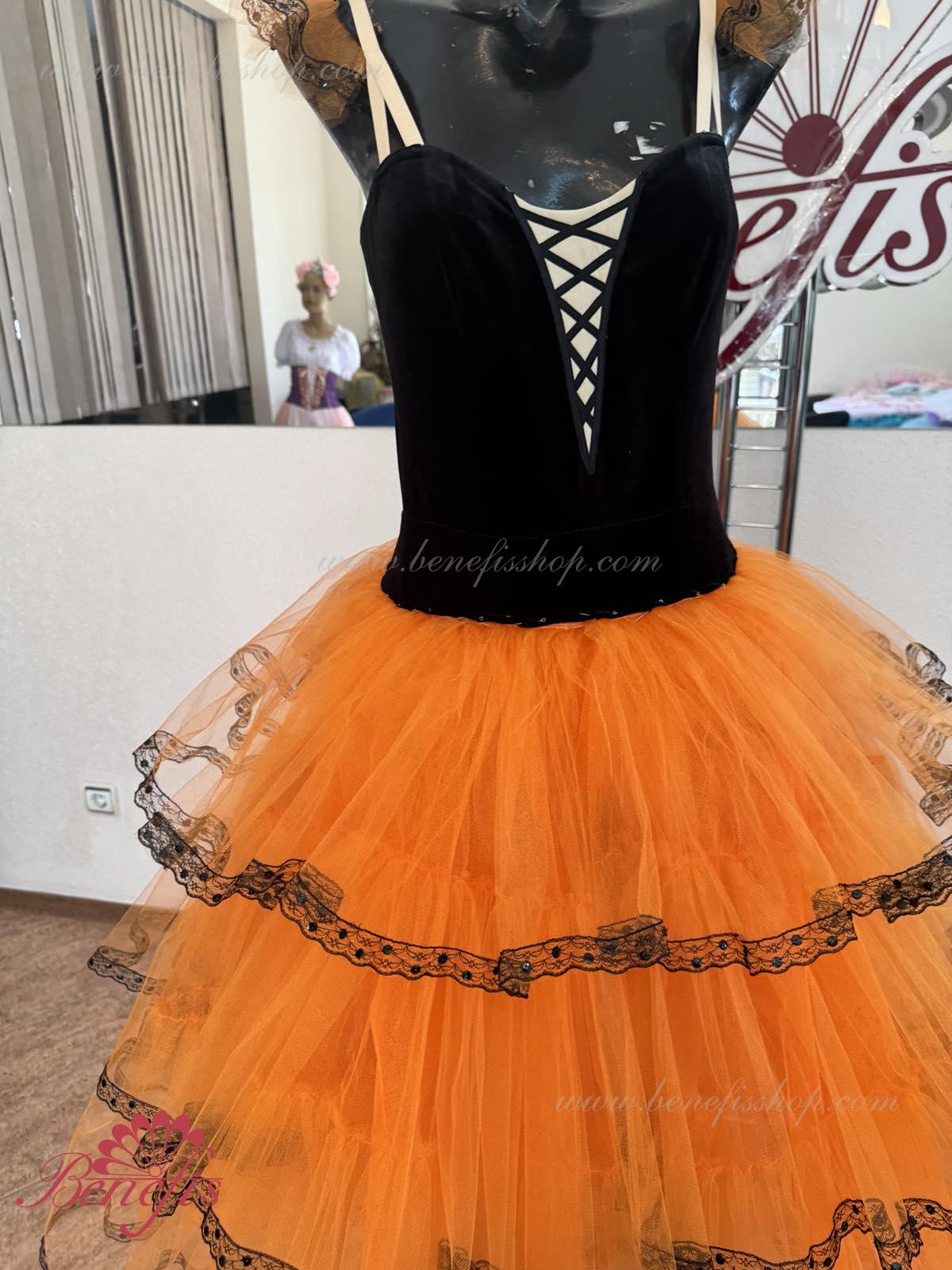 Юбка выполнен в испанском стиле. Изготовлена из жесткого и мягкого фатина. Верхний слой состоит из 3-х слоев оборок. Обработана по краю кружевом. Рукава выполнены из мягкого фатина и обработаны кружевом.