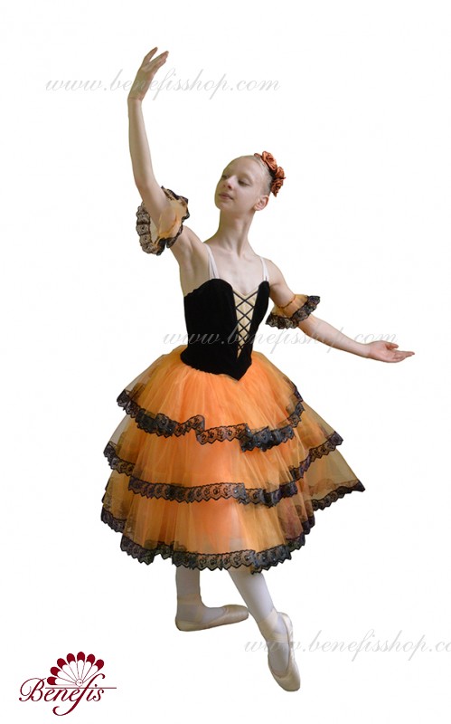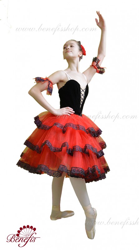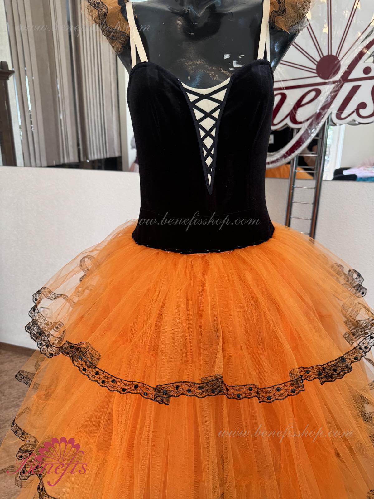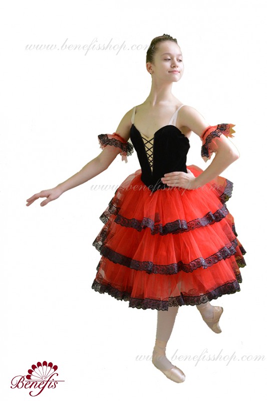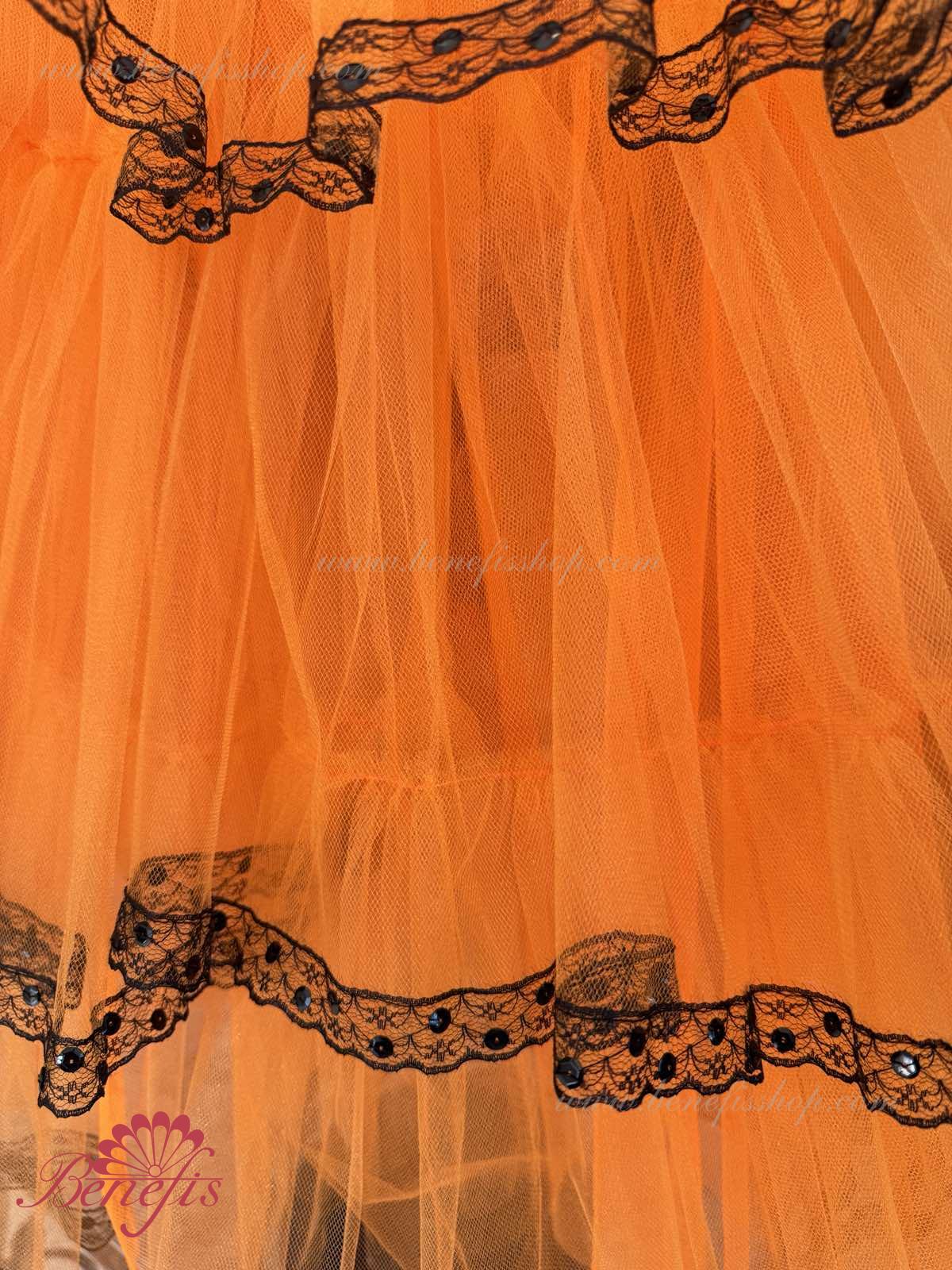 Юбка выполнен в испанском стиле. Изготовлена из жесткого и мягкого фатина. Верхний слой состоит из 3-х слоев оборок. Обработана по краю кружевом. Рукава выполнены из мягкого фатина и обработаны кружевом.