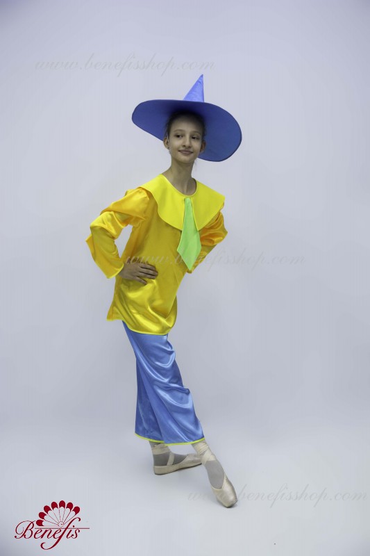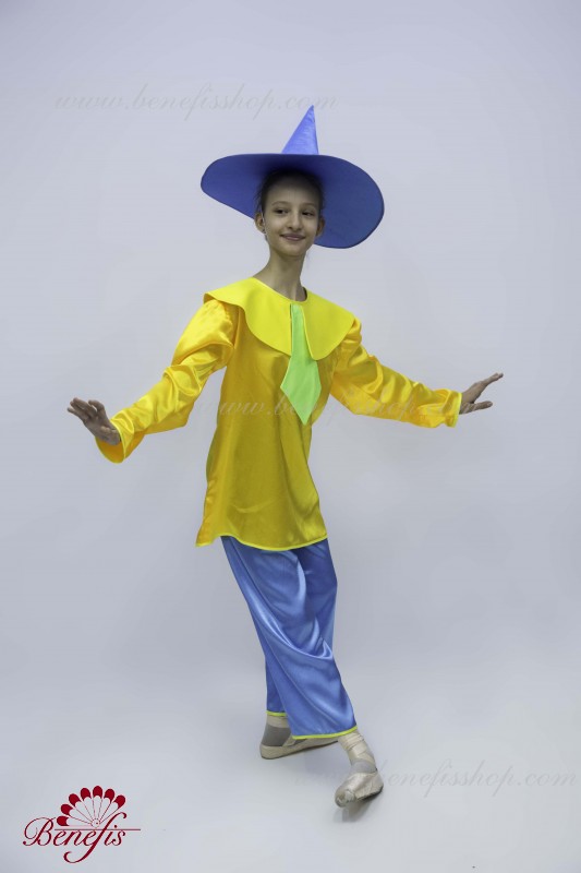 Костюм Незнайки состоит из: брюк , шляпы, рубашки. Выполнен из атласной ткани, обработан косой бейкой.