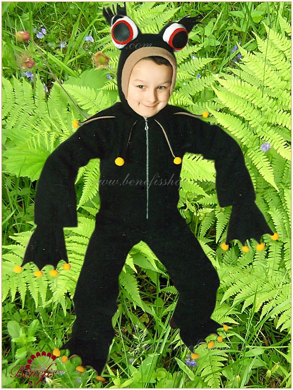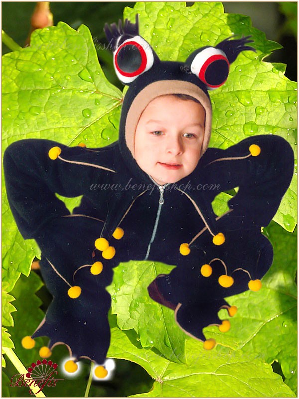 Комбинезон пошит из мягкой ткани и застегивается молнией впереди. Головной убор выполнен с большими глазами характерными для лягушки. На руках и на ногах – лягушиные лапки с перепонками и коготками (в виде помпонов). Воротник выдержан в том же стиле.