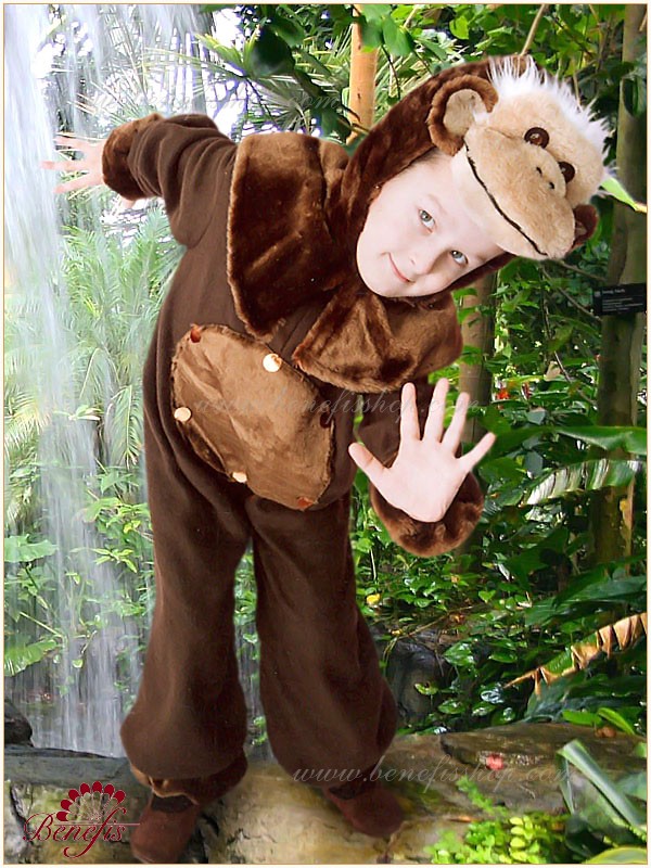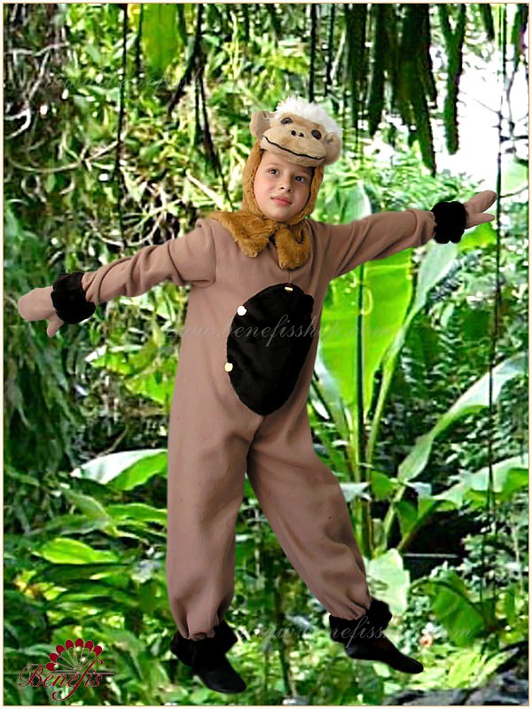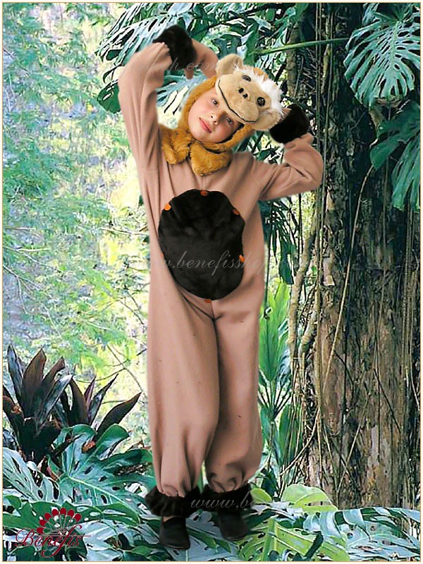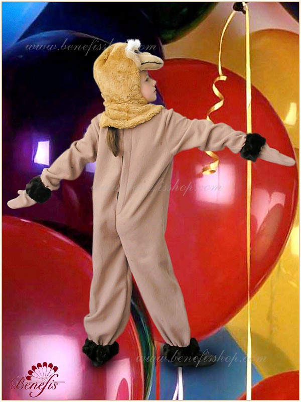 Комбинезон пошит из мягкой ткани с меховой вставкой впереди. Головной убор выполнен из меха с глазками, носиком и ушками. Рукава и штанины оторочены мехом. Застегивается сзади на липучках.