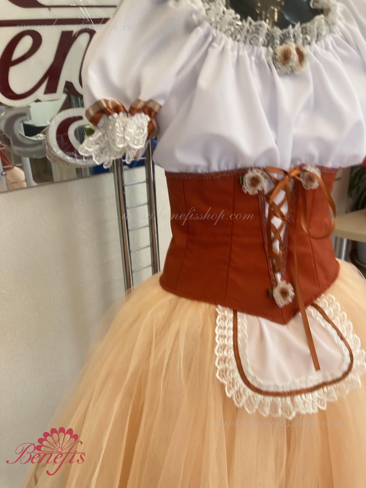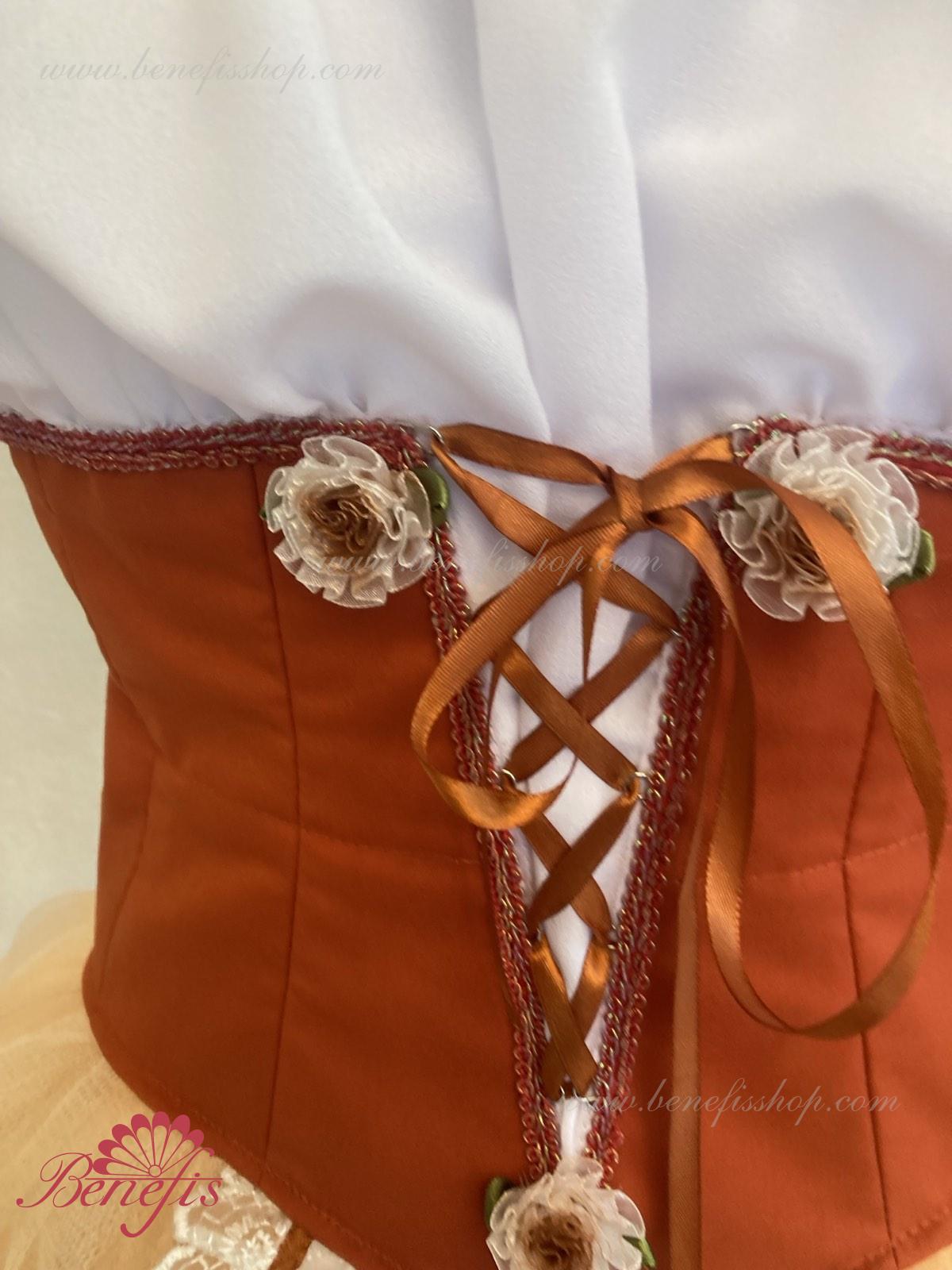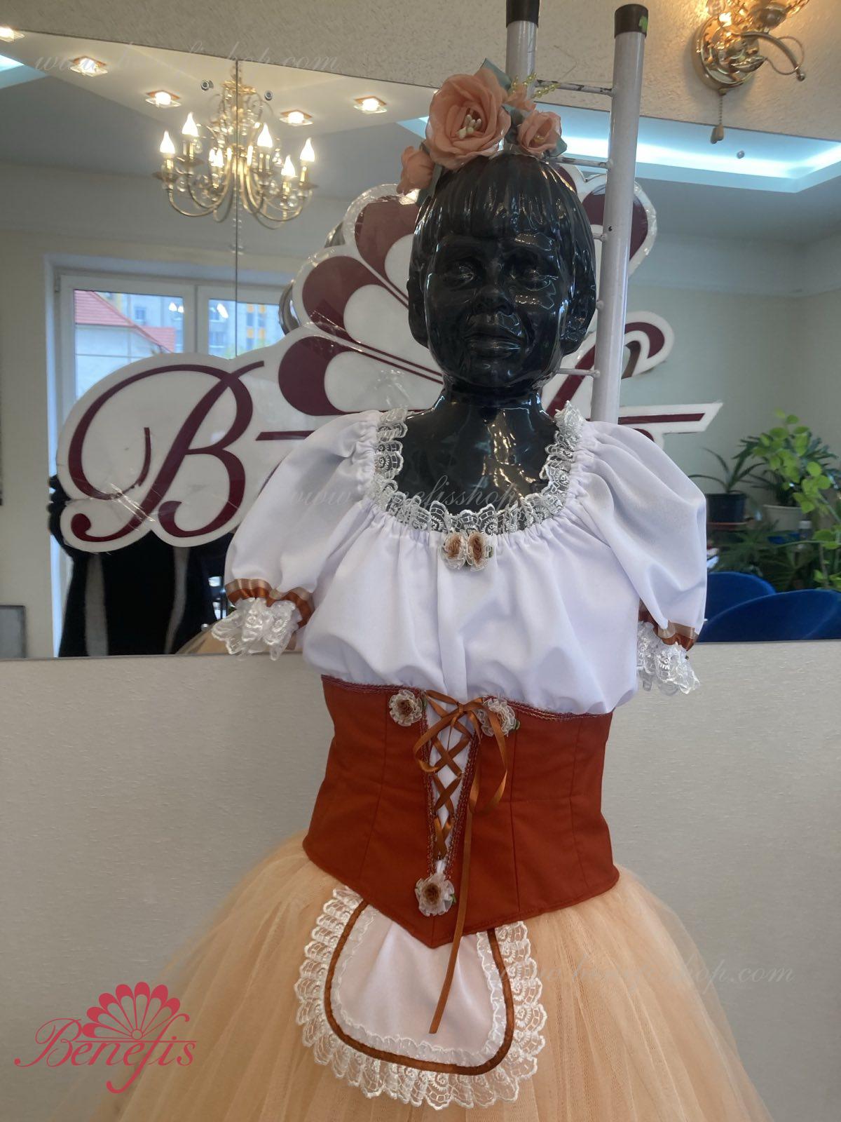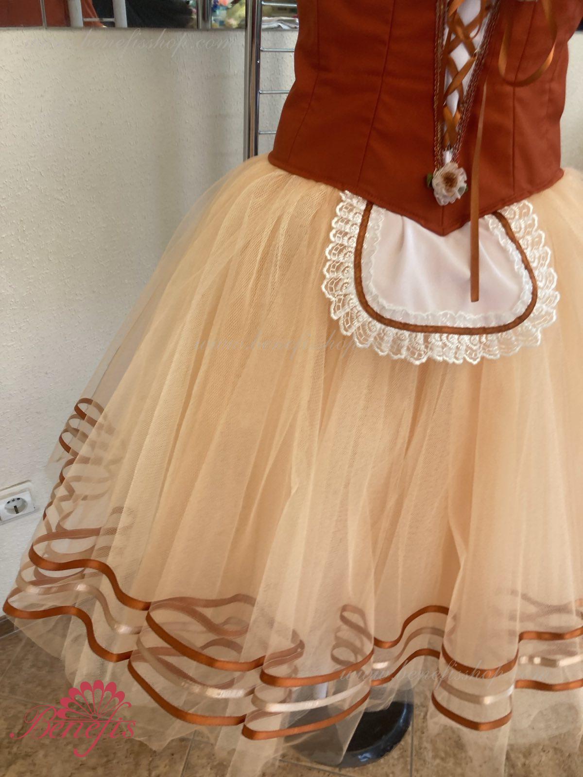Костюм выполняется в крестьянском стиле с маленьким фартуком спереди и атласной тесьмой в три ряда по нижней части верхнего слоя юбки.