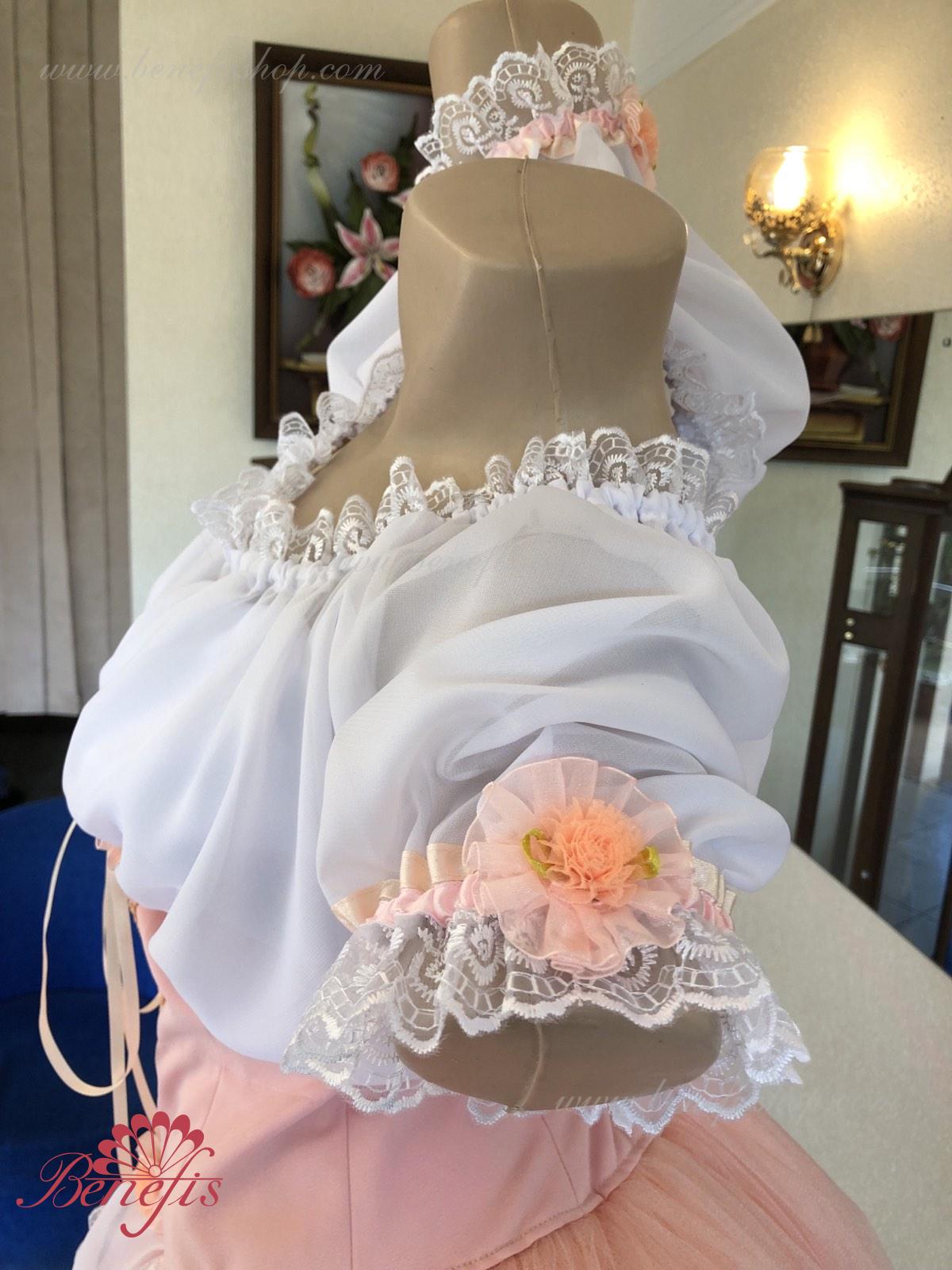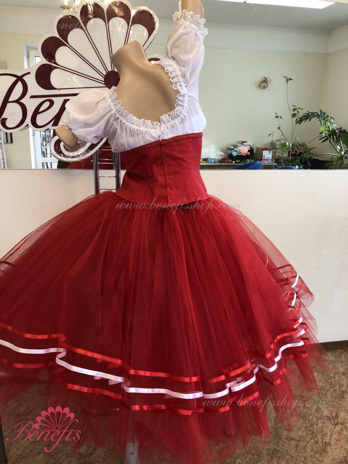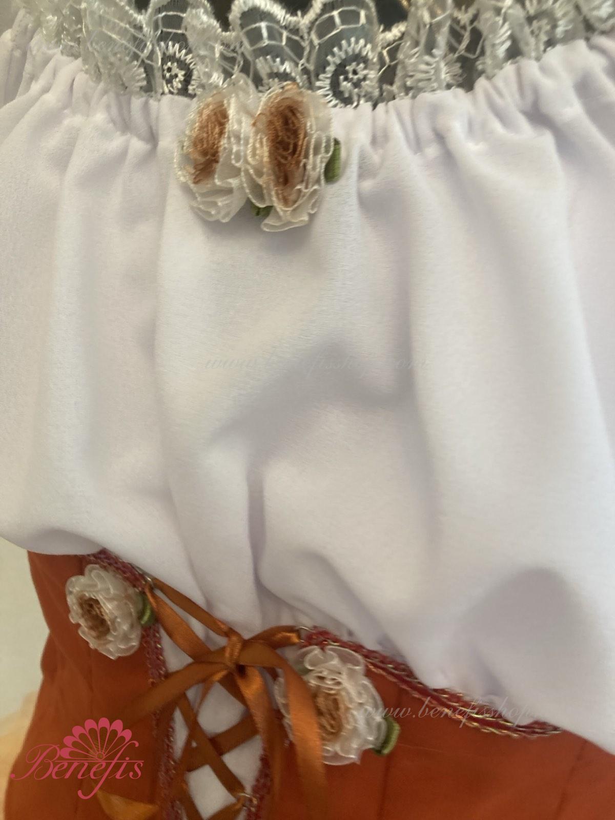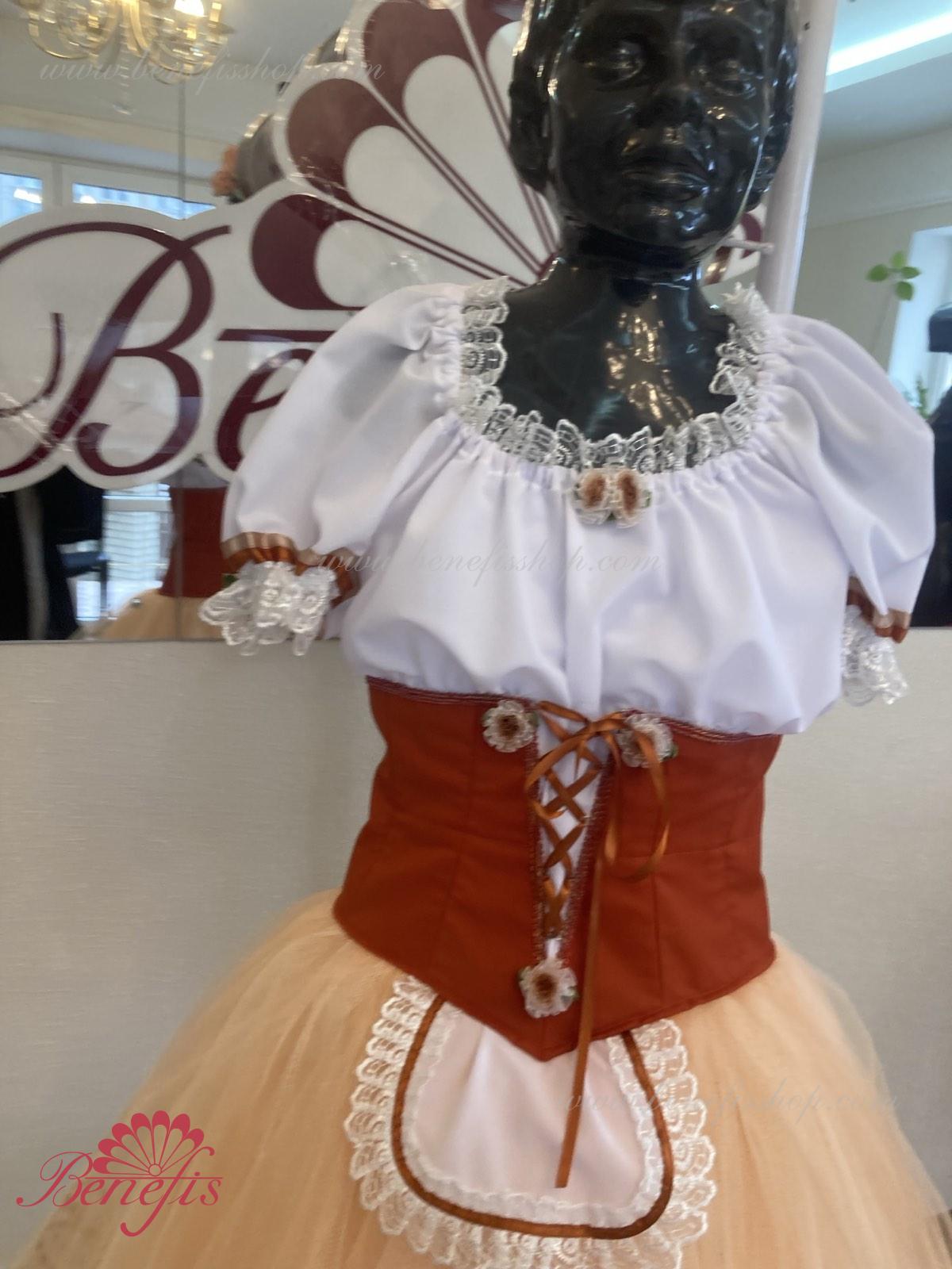 Костюм выполняется в крестьянском стиле с маленьким фартуком спереди и атласной тесьмой в три ряда по нижней части верхнего слоя юбки.