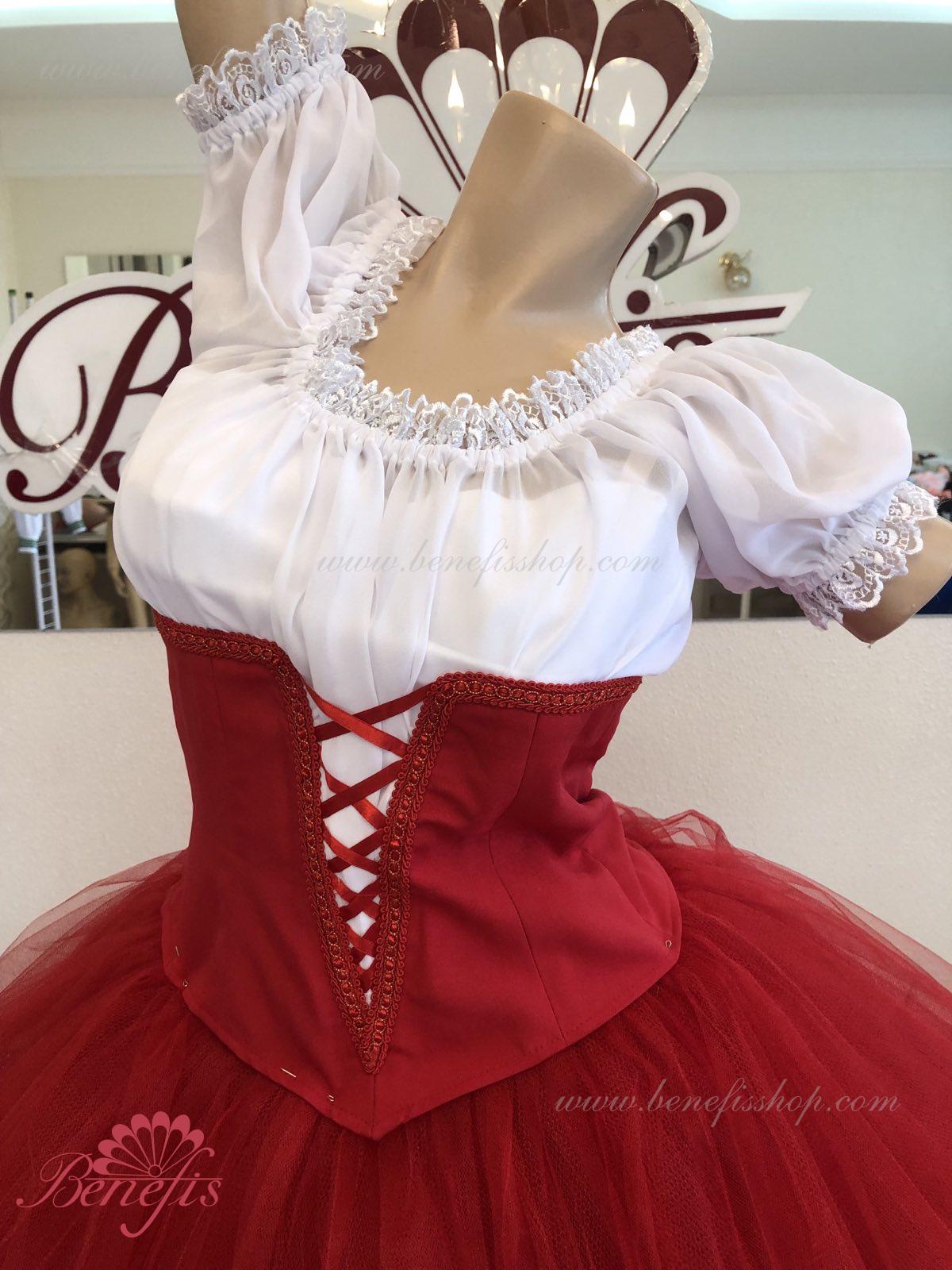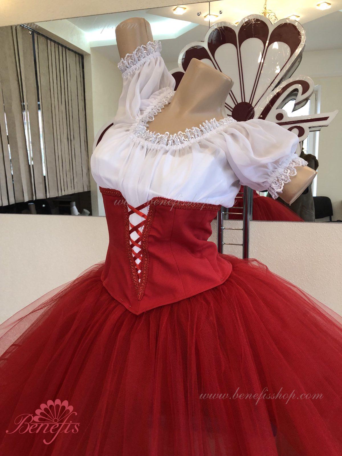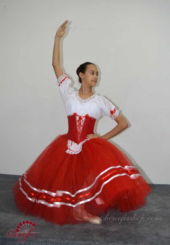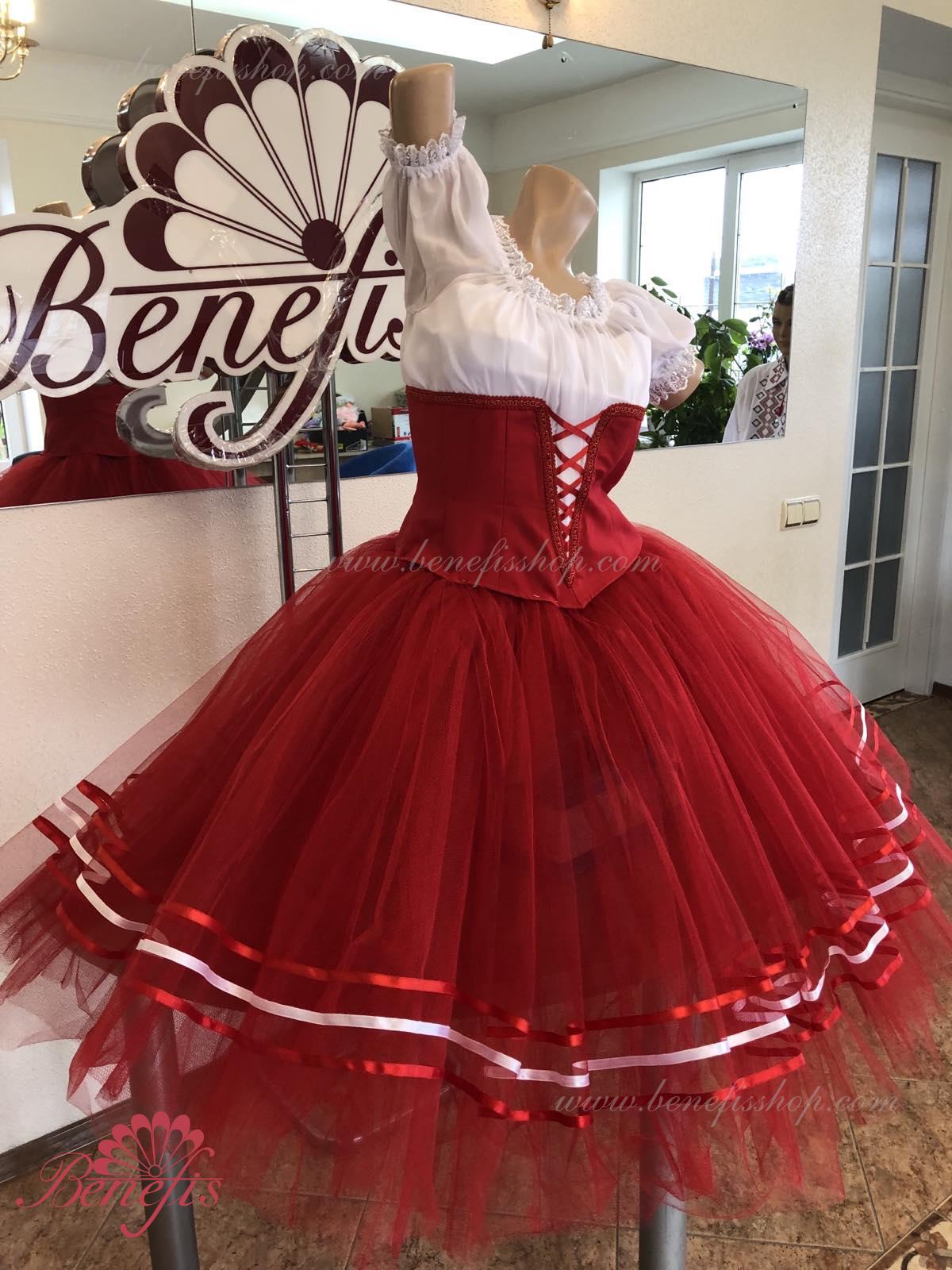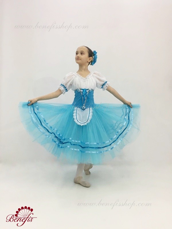 Костюм выполняется в крестьянском стиле с маленьким фартуком спереди и атласной тесьмой в три ряда по нижней части верхнего слоя юбки.