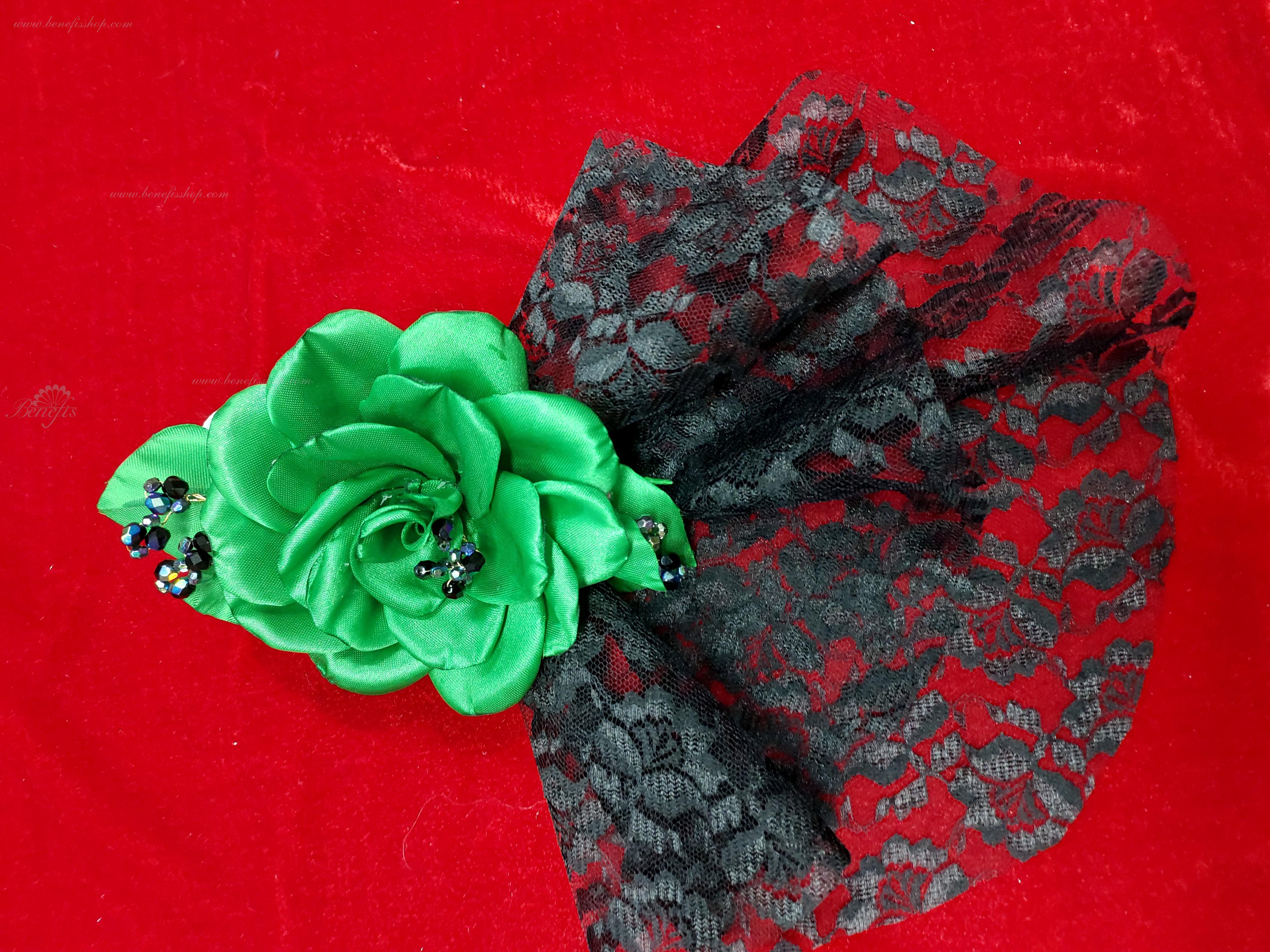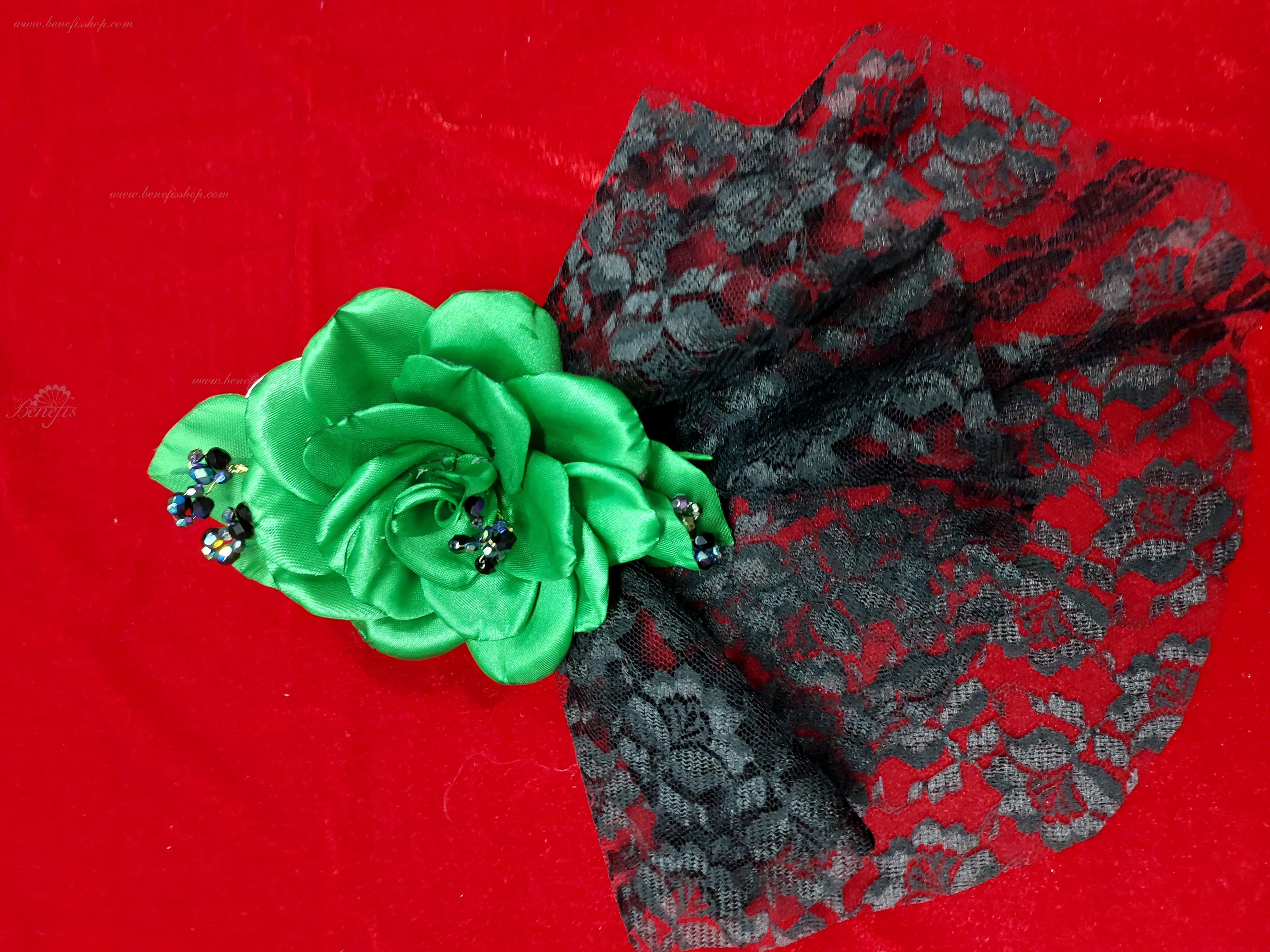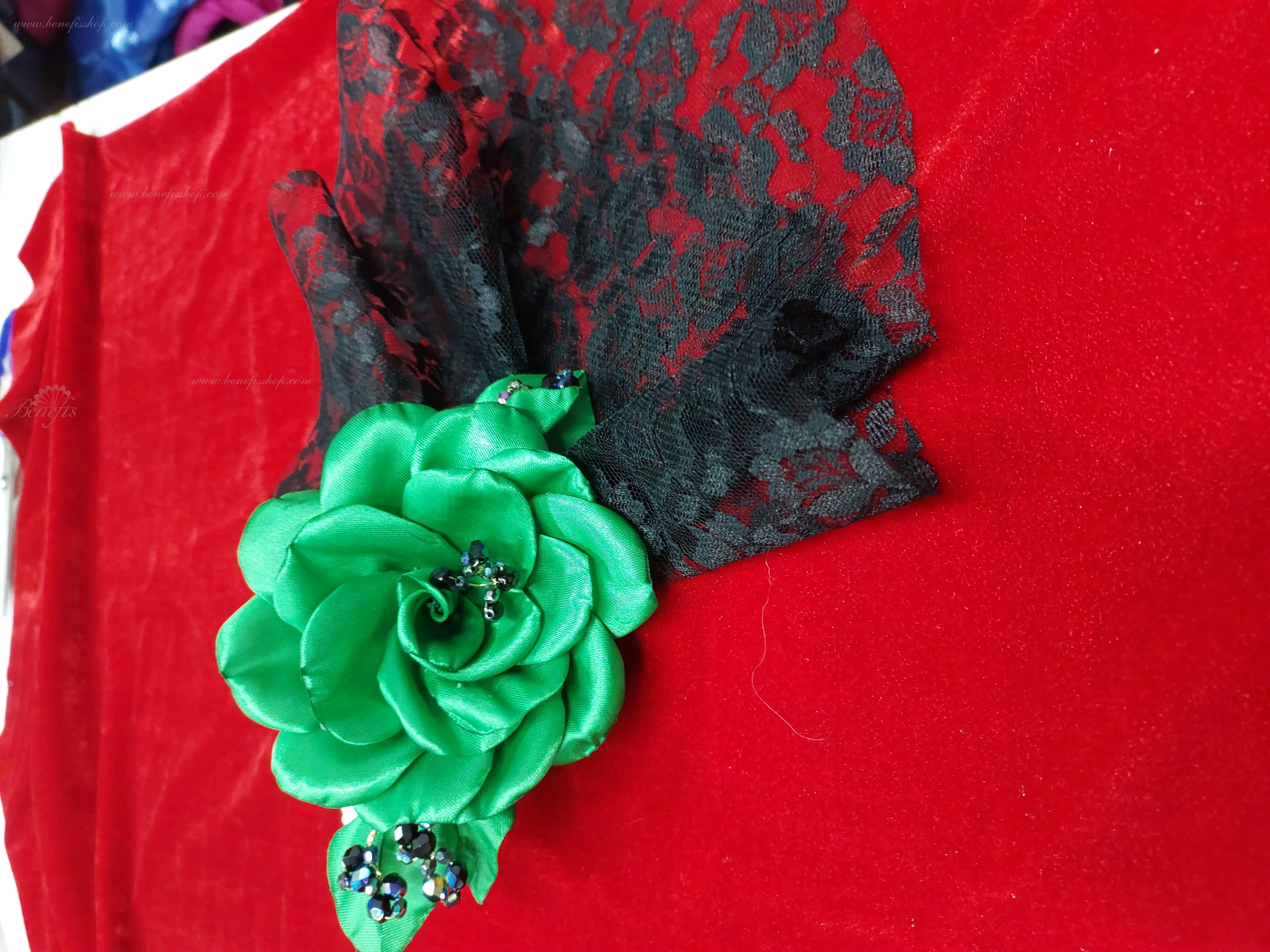 Цветок красного цвета украшен кружевом в испанском стиле. Может быть использован во многих балетных вариациях и для других целей, таких например, как дополнение к карнавальным костюмам.