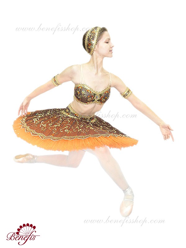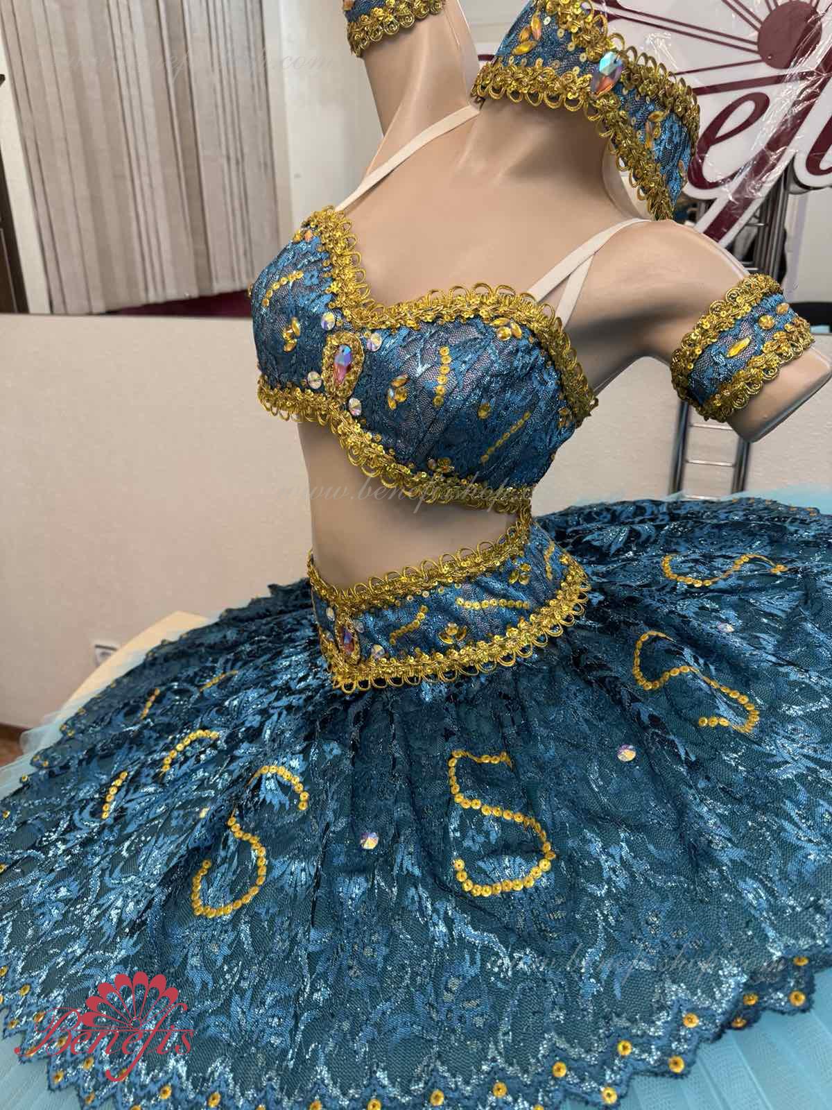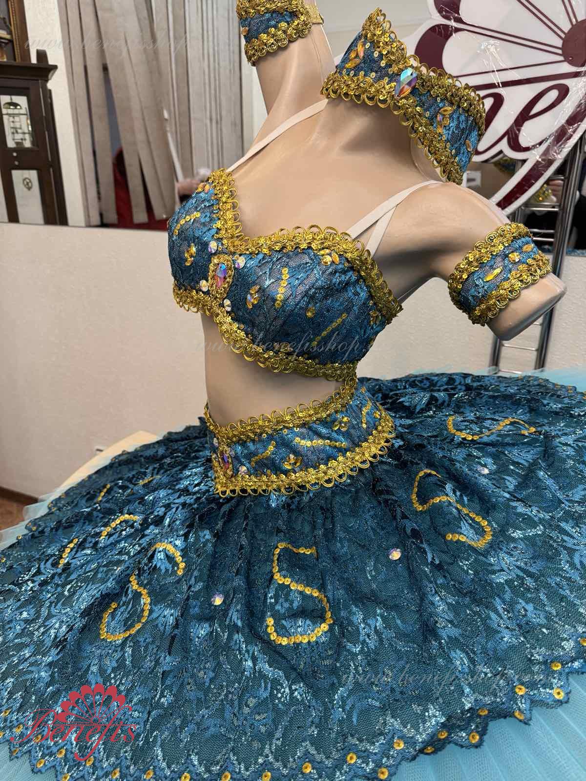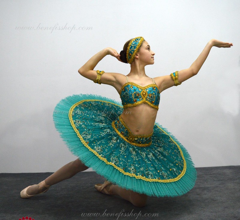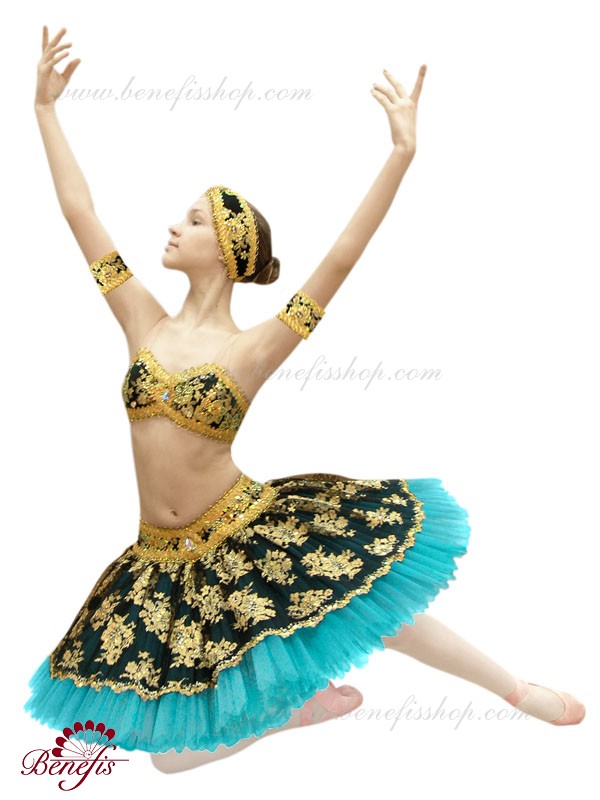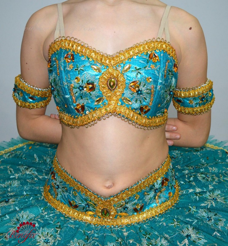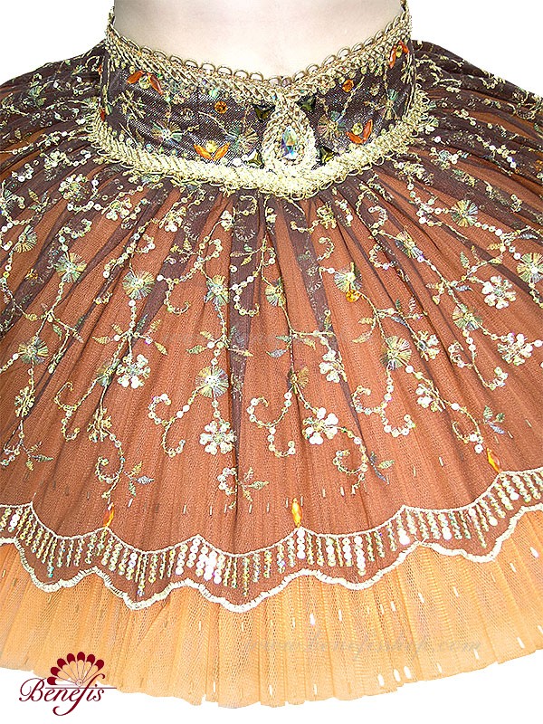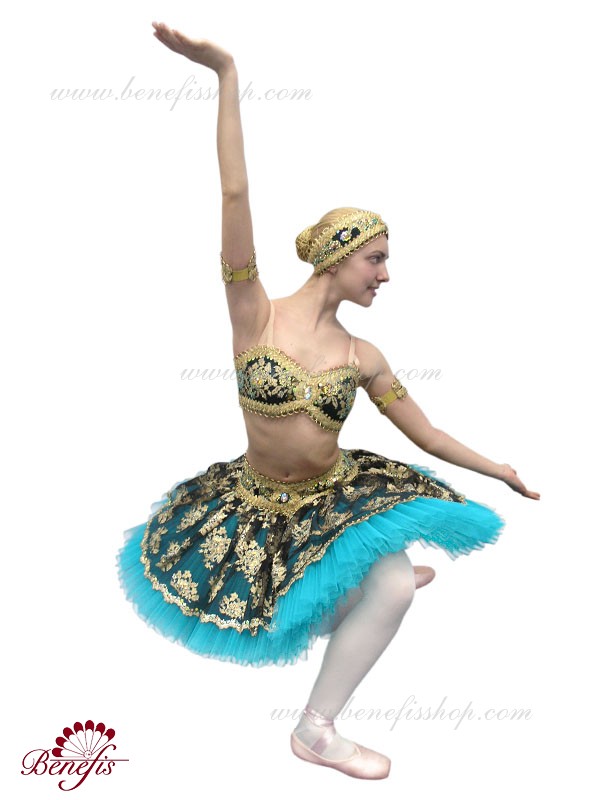 Роскошный балетный костюм выполнен в лучших восточных традициях. Укороченный лиф выполняется отдельно от юбки пачки, которая одевается на бёдра.