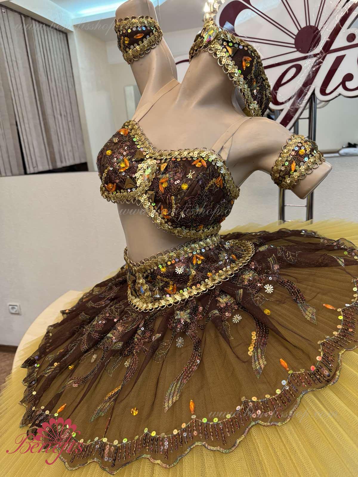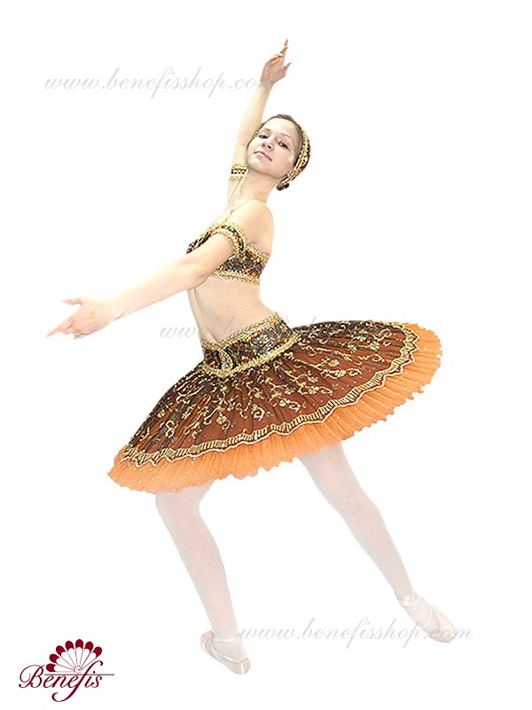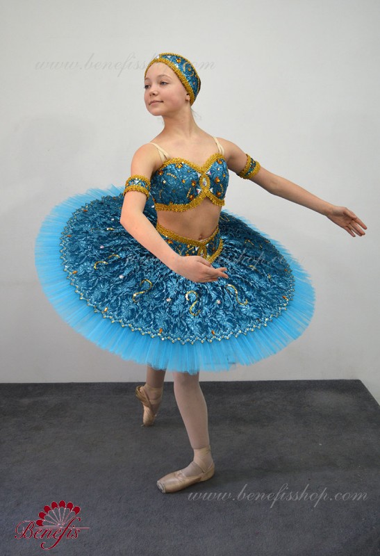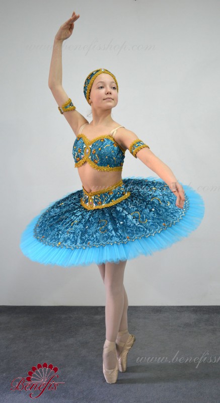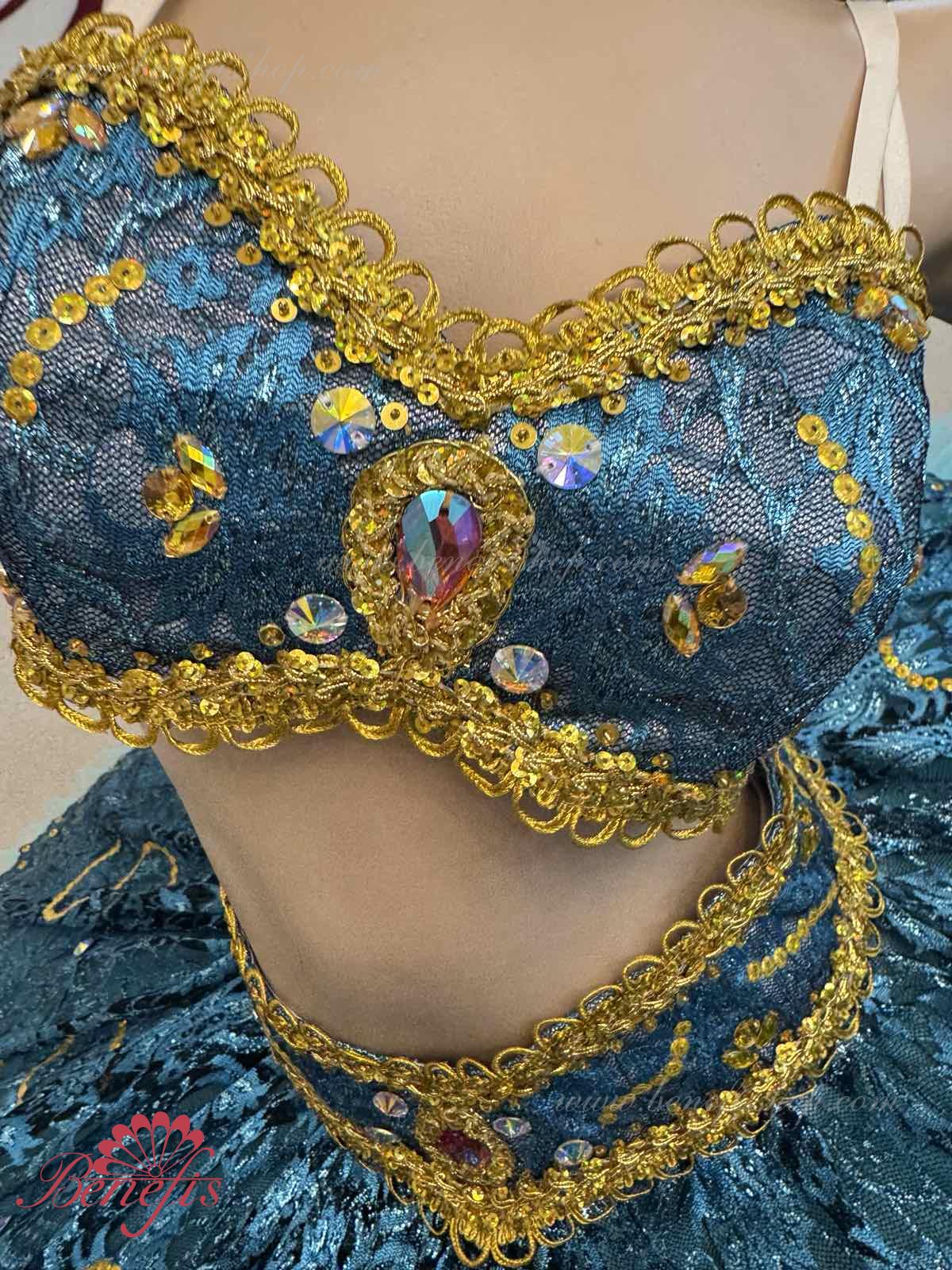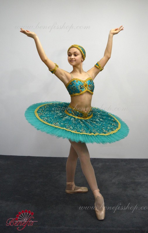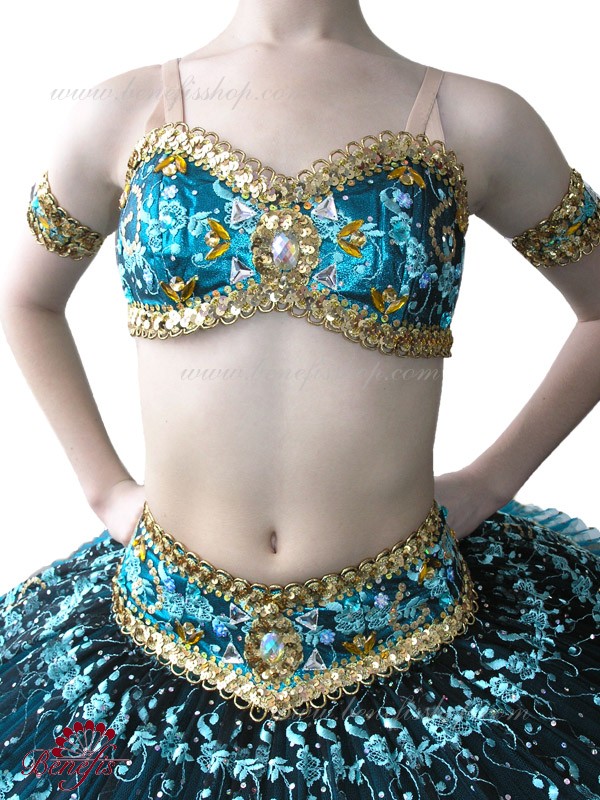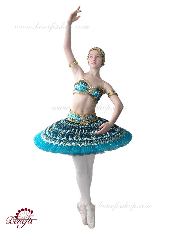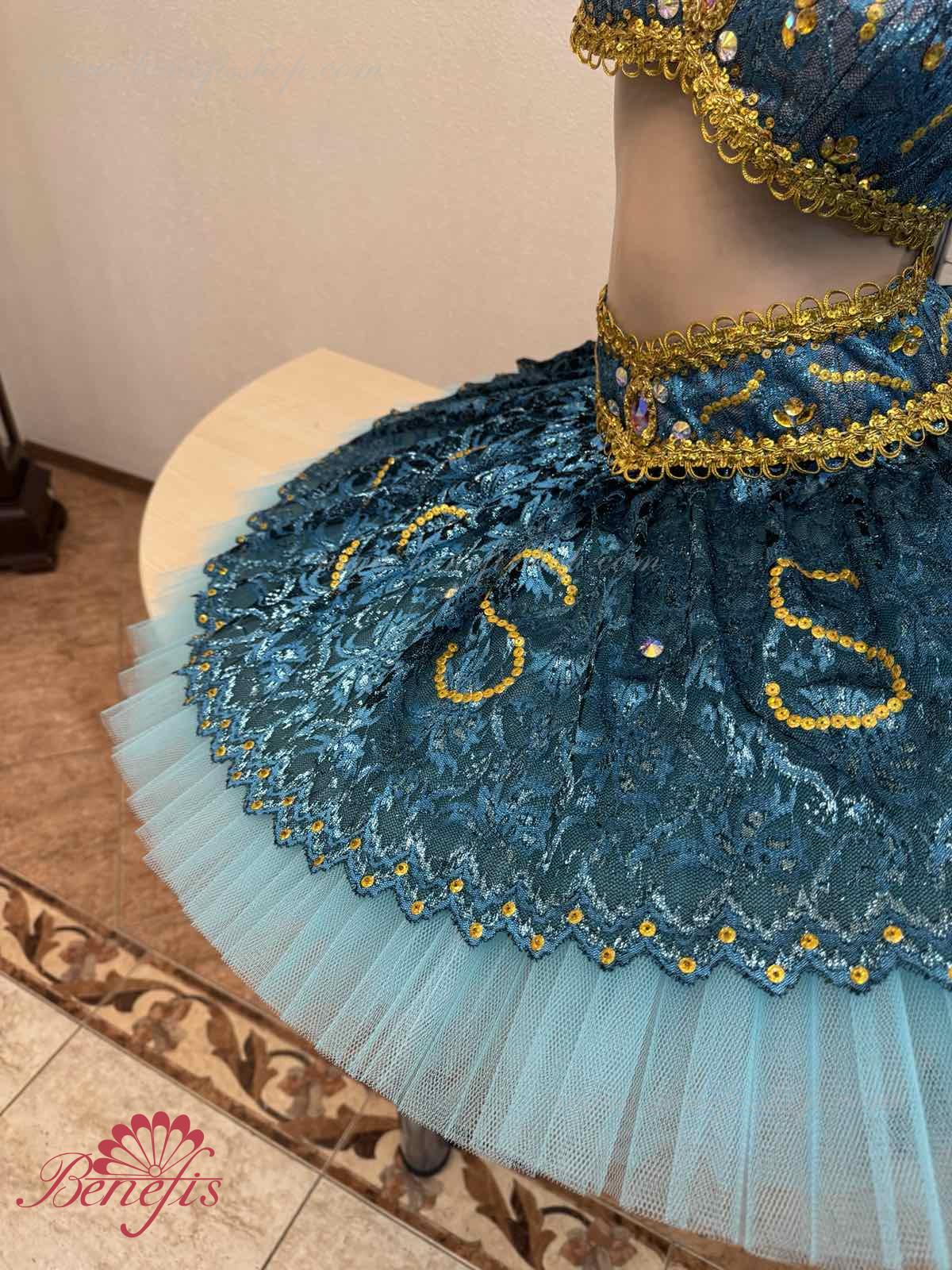 Роскошный балетный костюм выполнен в лучших восточных традициях. Укороченный лиф выполняется отдельно от юбки пачки, которая одевается на бёдра.