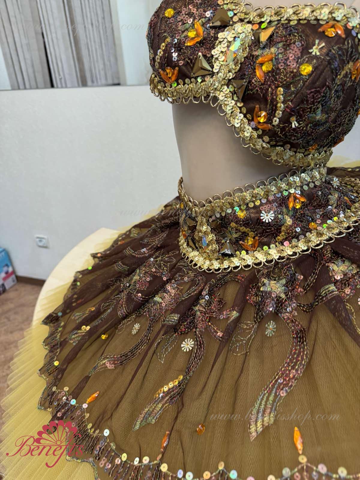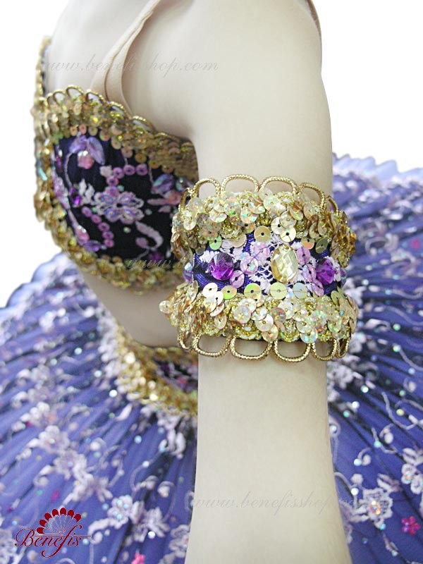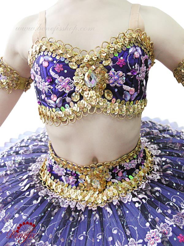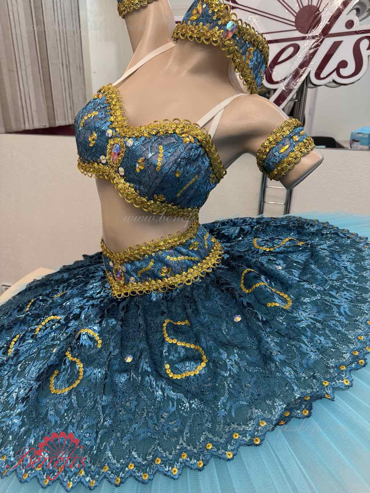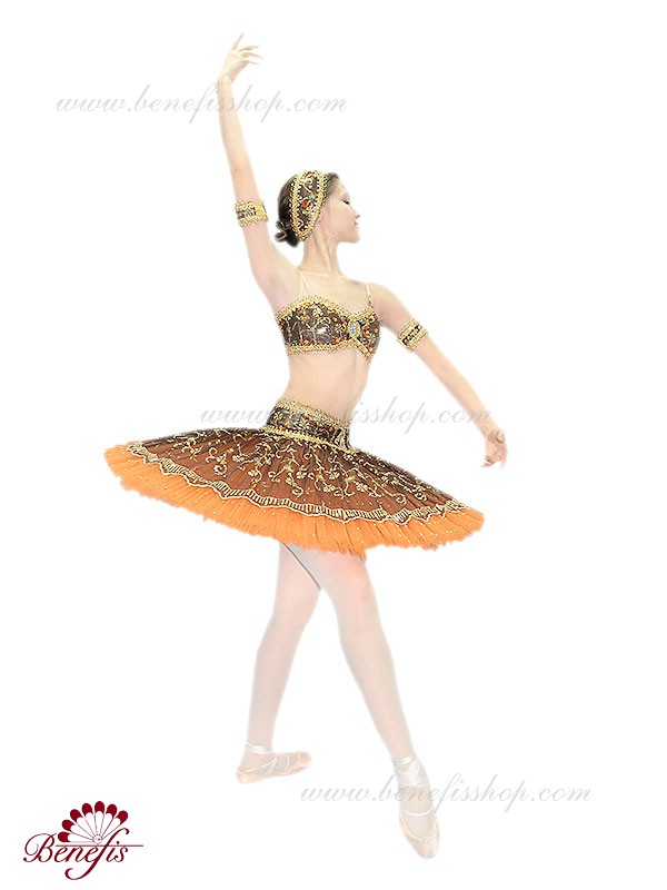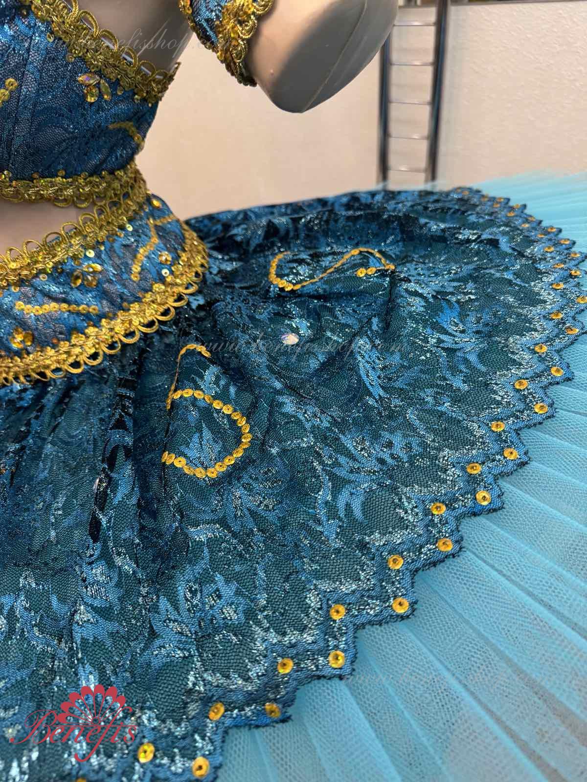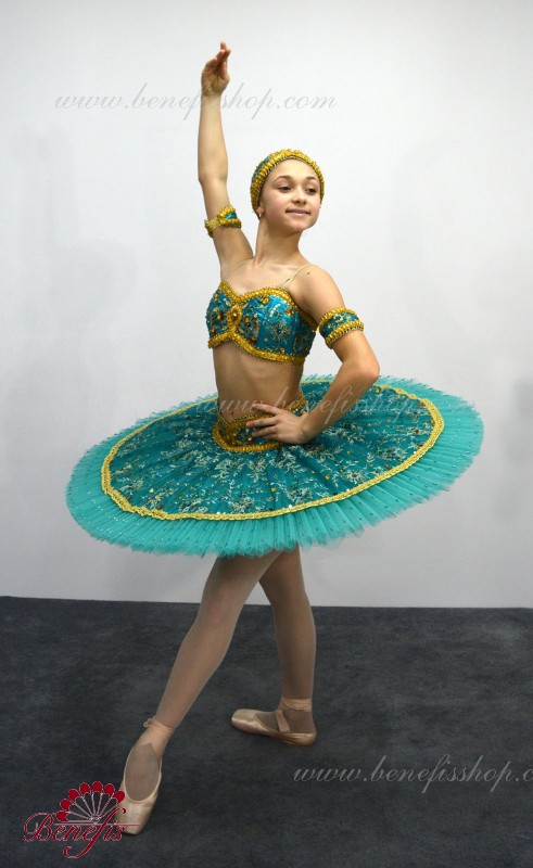 Роскошный балетный костюм выполнен в лучших восточных традициях. Укороченный лиф выполняется отдельно от юбки пачки, которая одевается на бёдра.
