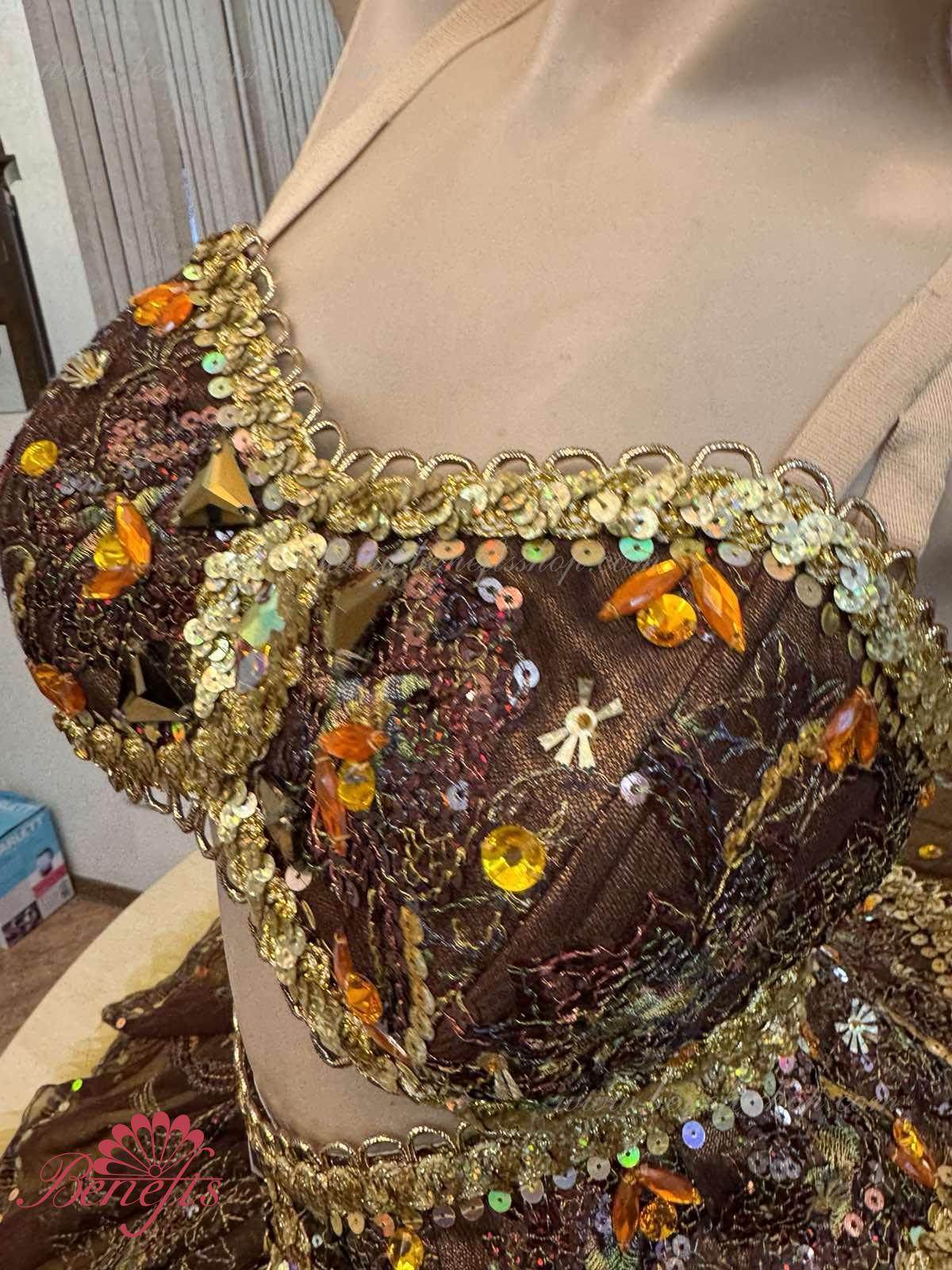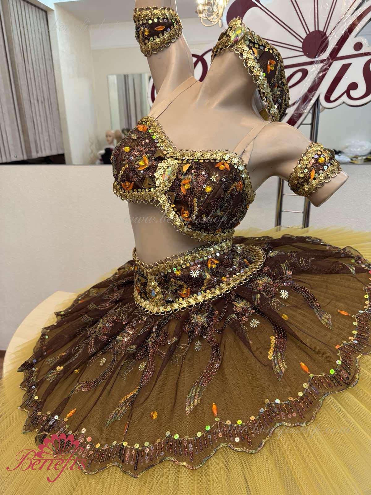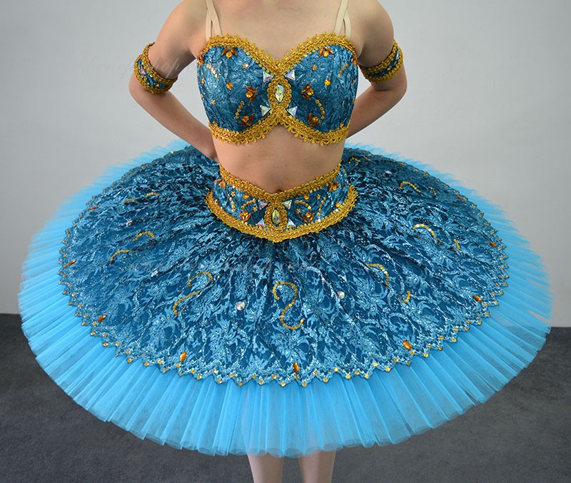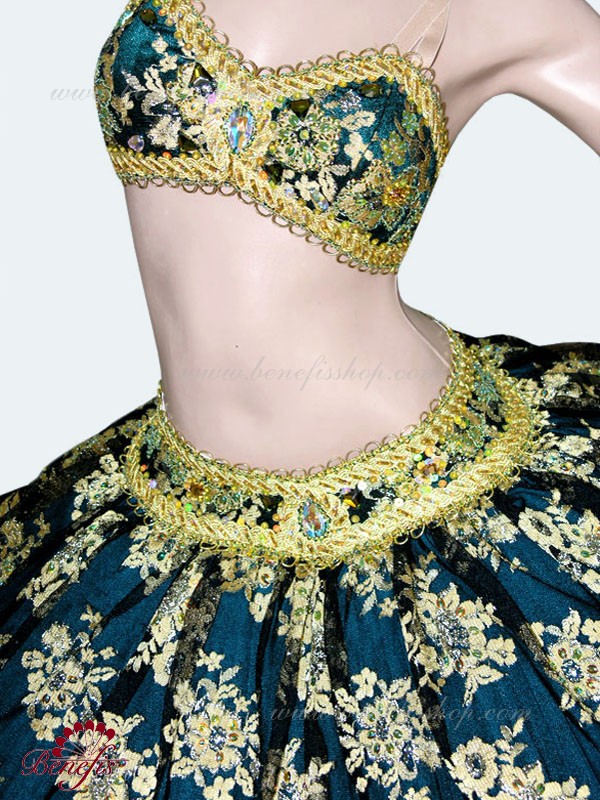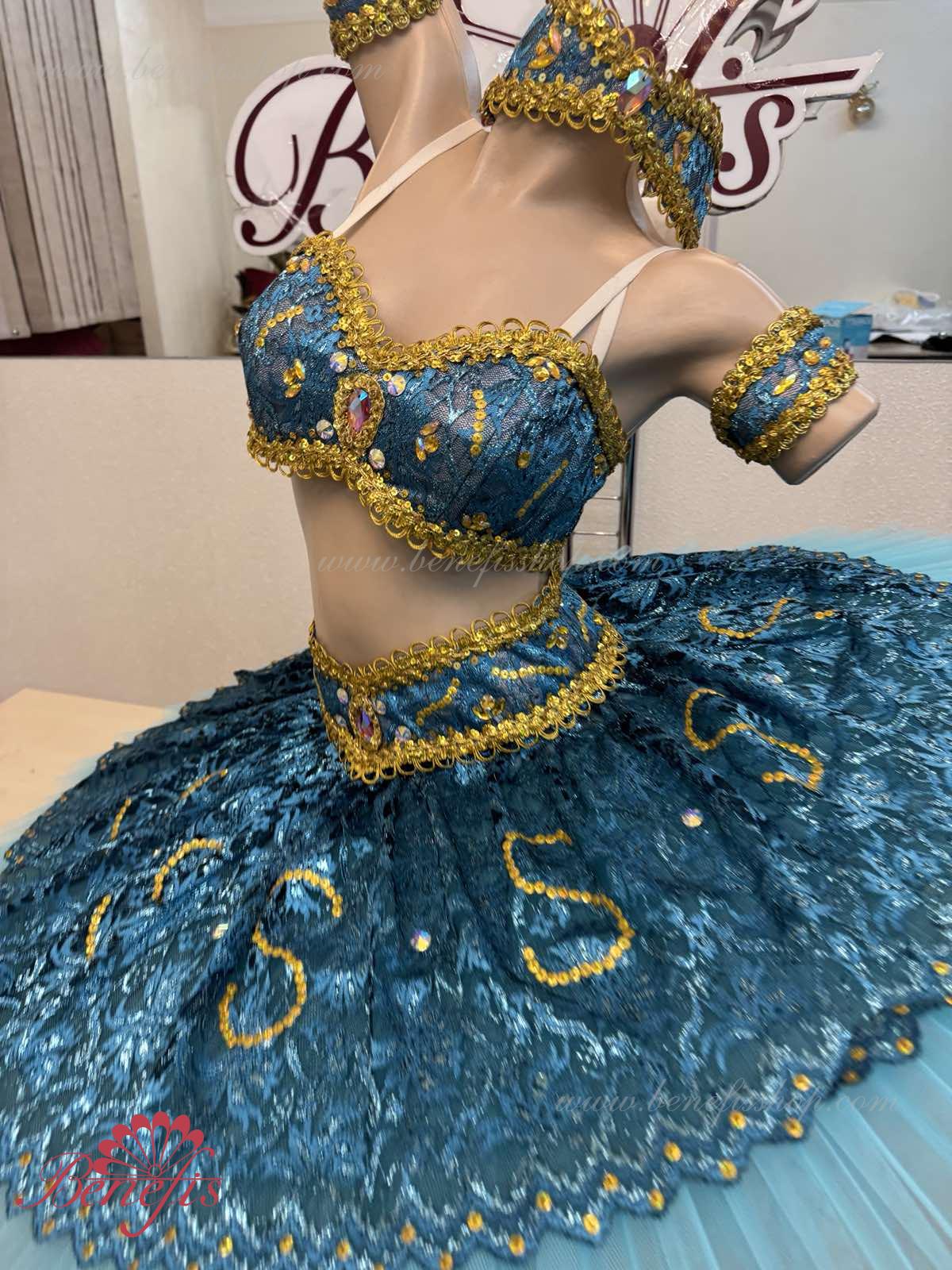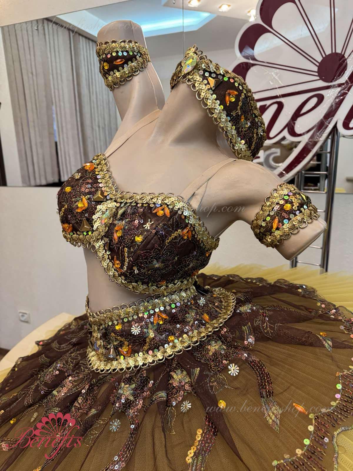 Роскошный балетный костюм выполнен в лучших восточных традициях. Укороченный лиф выполняется отдельно от юбки пачки, которая одевается на бёдра.