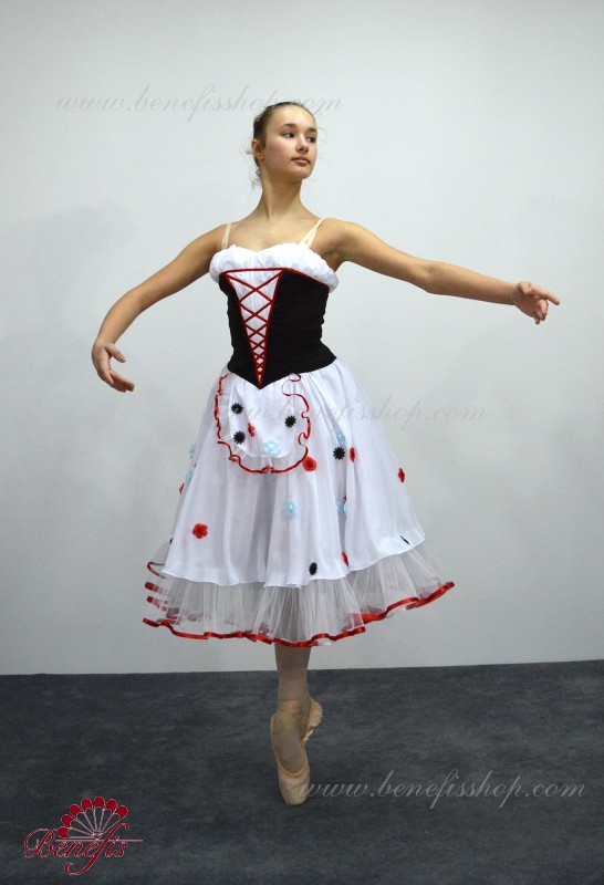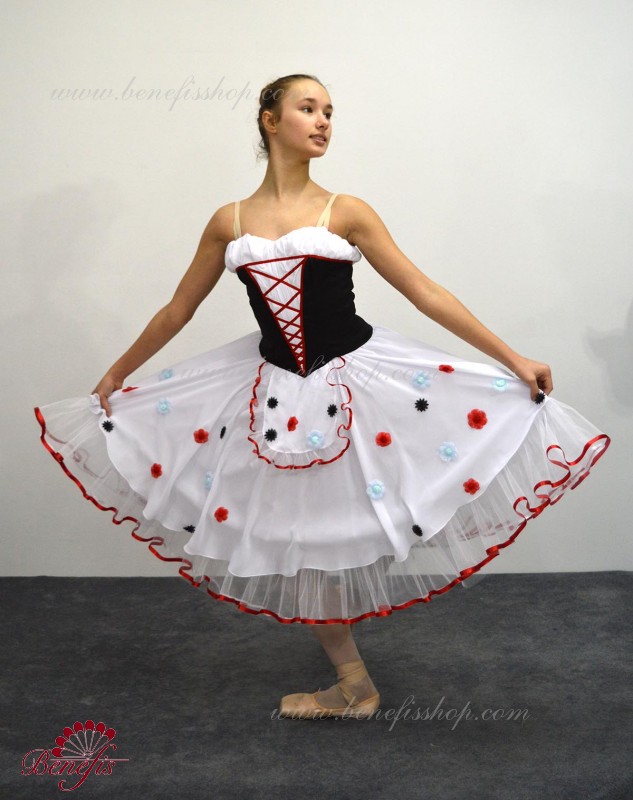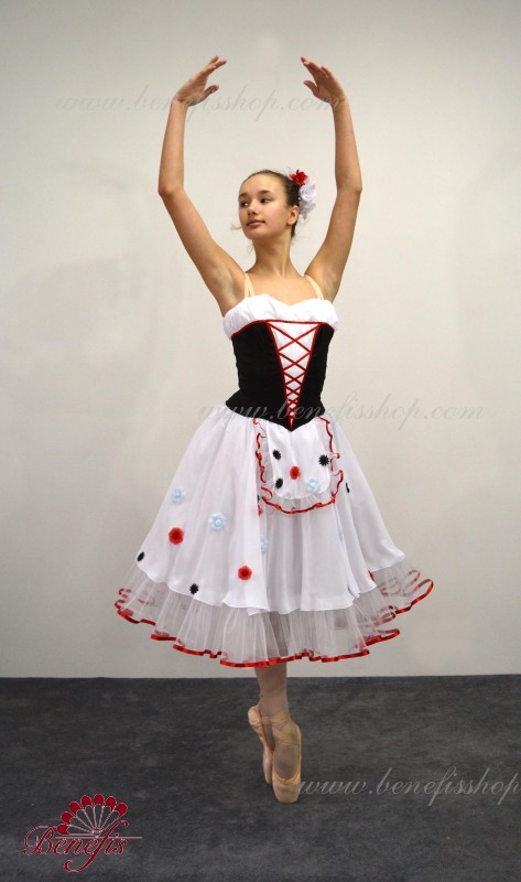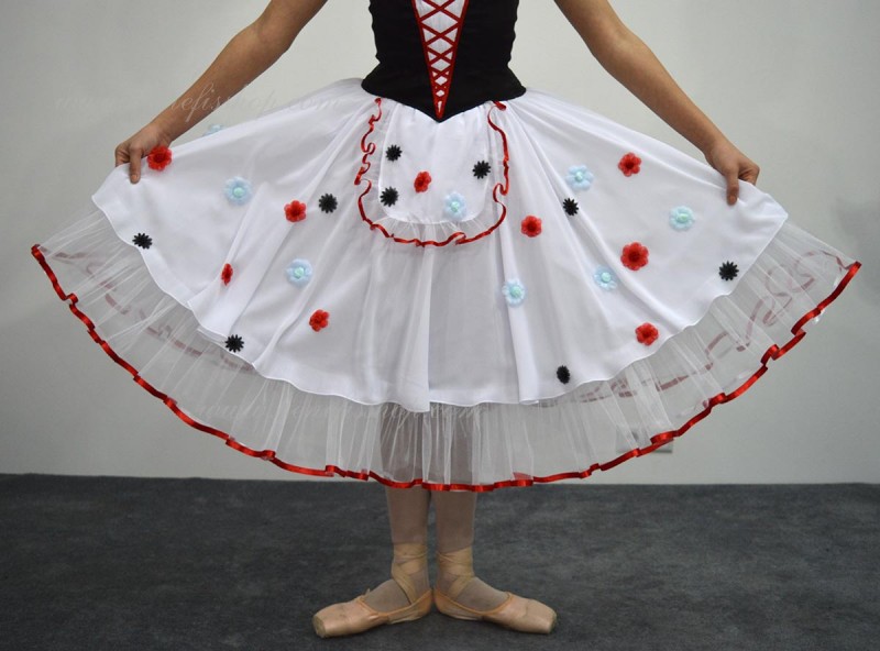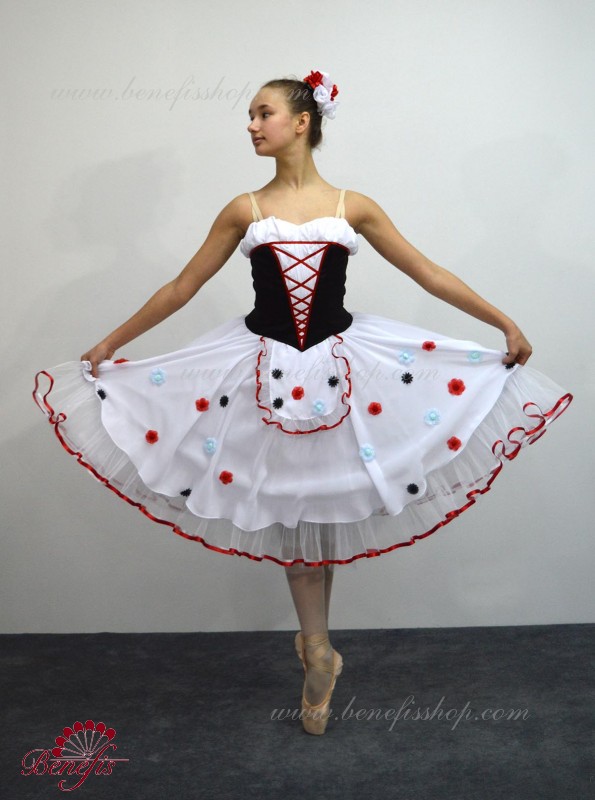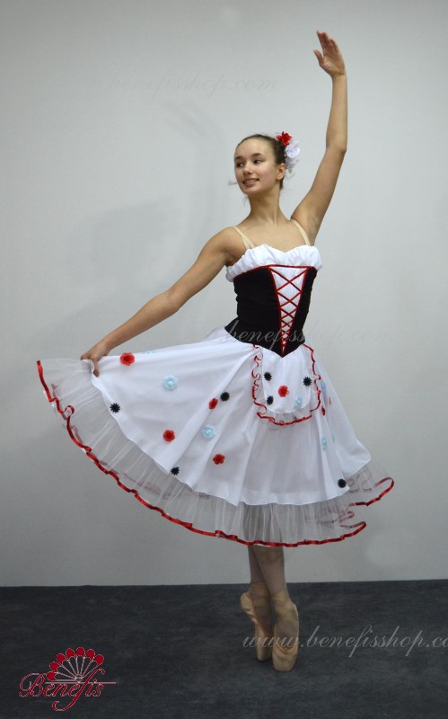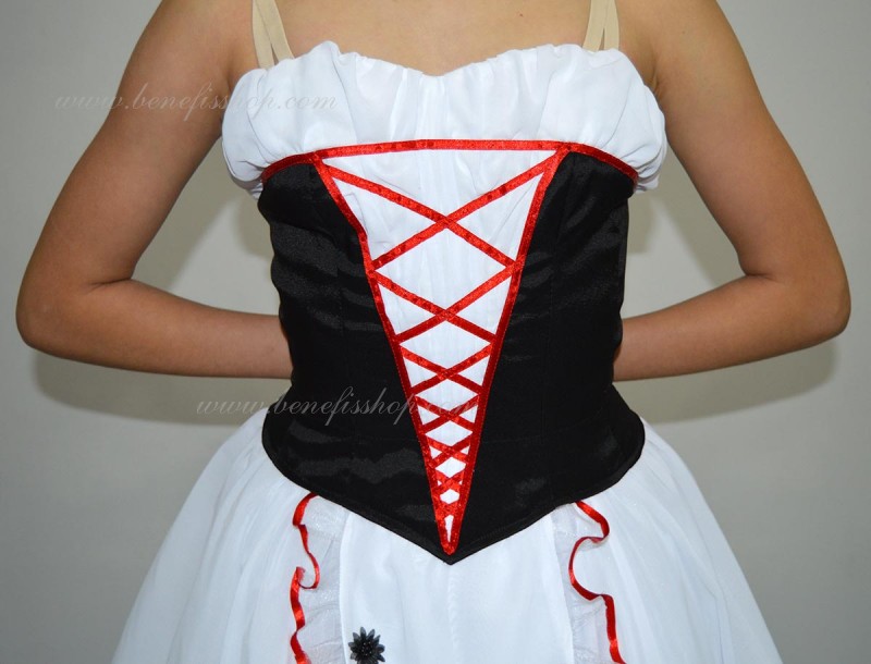 Этот профессиональный сценический костюм состоит из полустрейчивой ткани лифа с имитацией декоративной шнуровки спереди и с пышной юбкой.