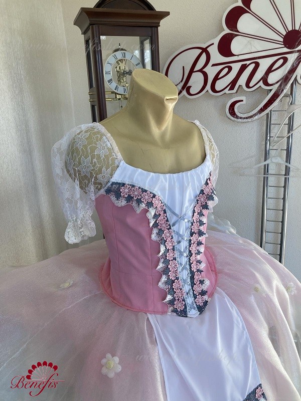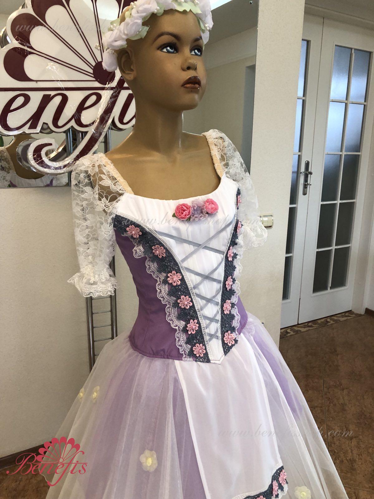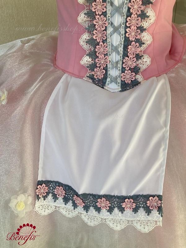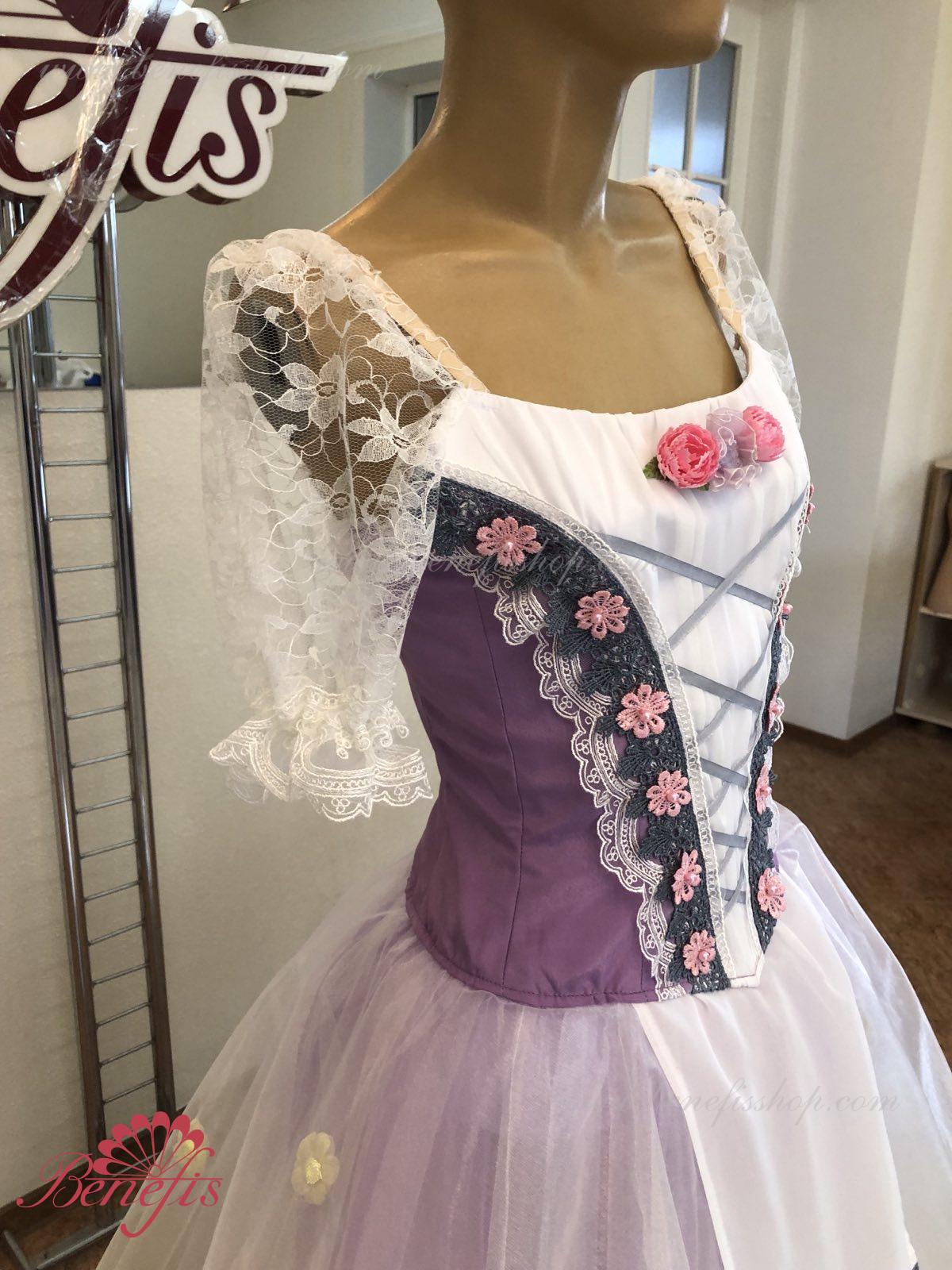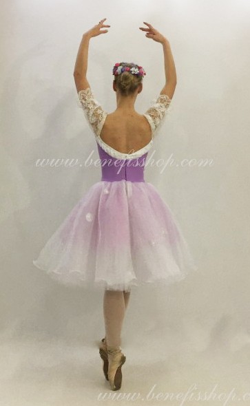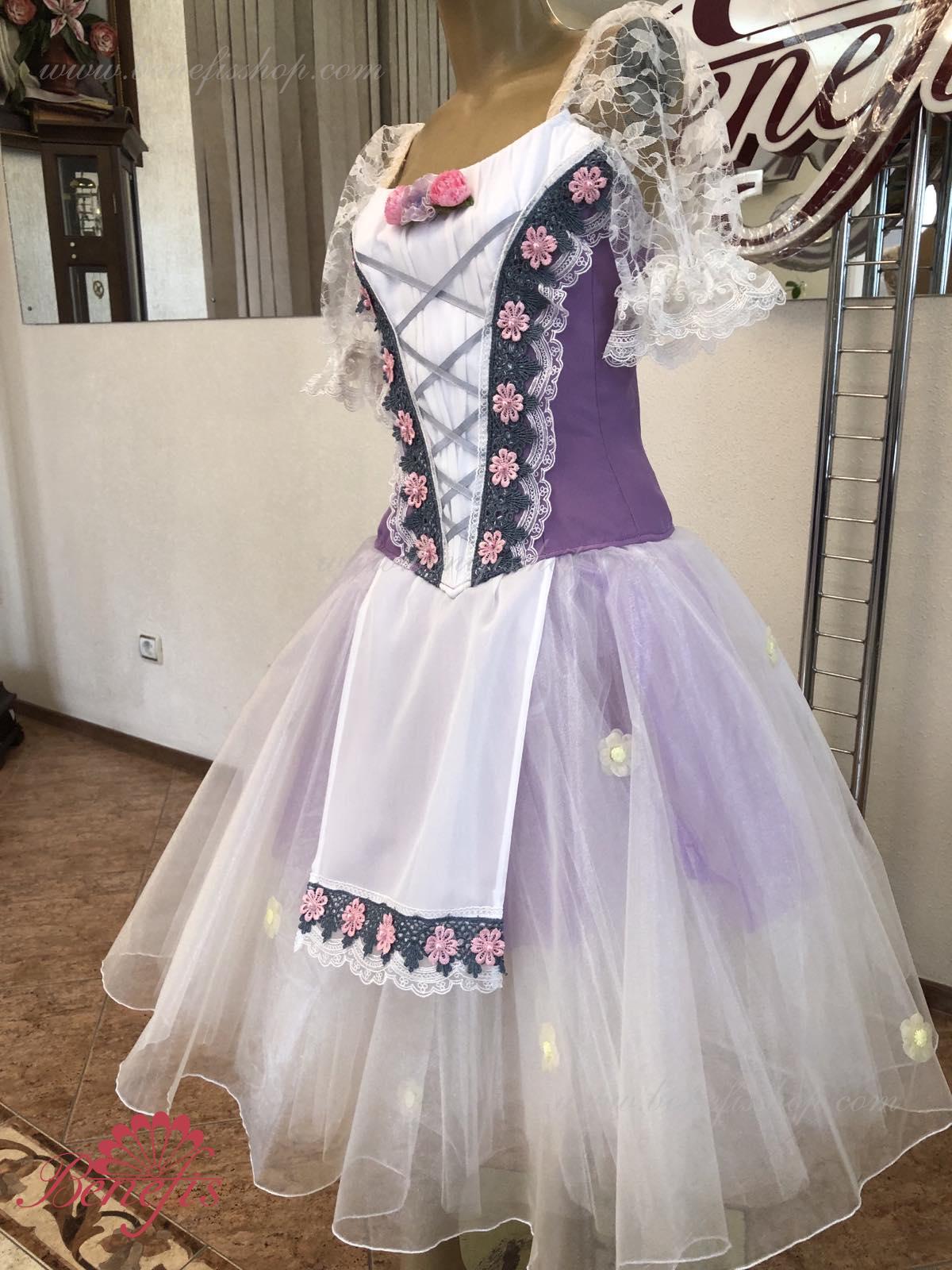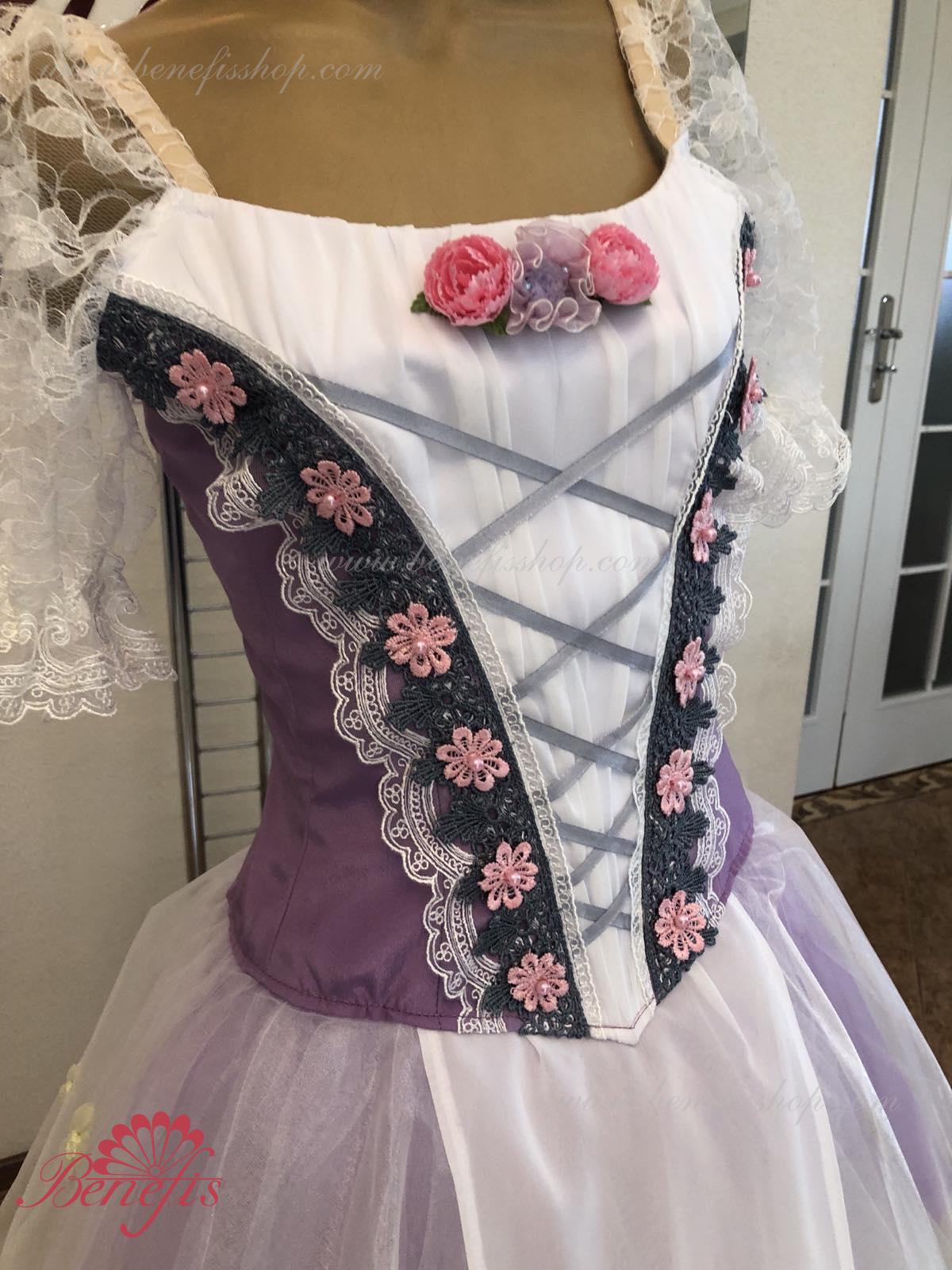 Сценический костюм выполнен на основе профессиональной романтической юбки состоящий из 3-х слоев фатина, которые покрываются легким шифоном с кружевом. Лиф выполняется из плотной ткани с декоративной шнуровкой спереди. Линия вставки по груди оторочена кружевом. Лиф застегивается на крючки в два ряда для удобного регулирования, а внутренний шнур служит для затягивания лифа в области груди. К телесным лямкам пришиты рукава-фонарики из шифона.