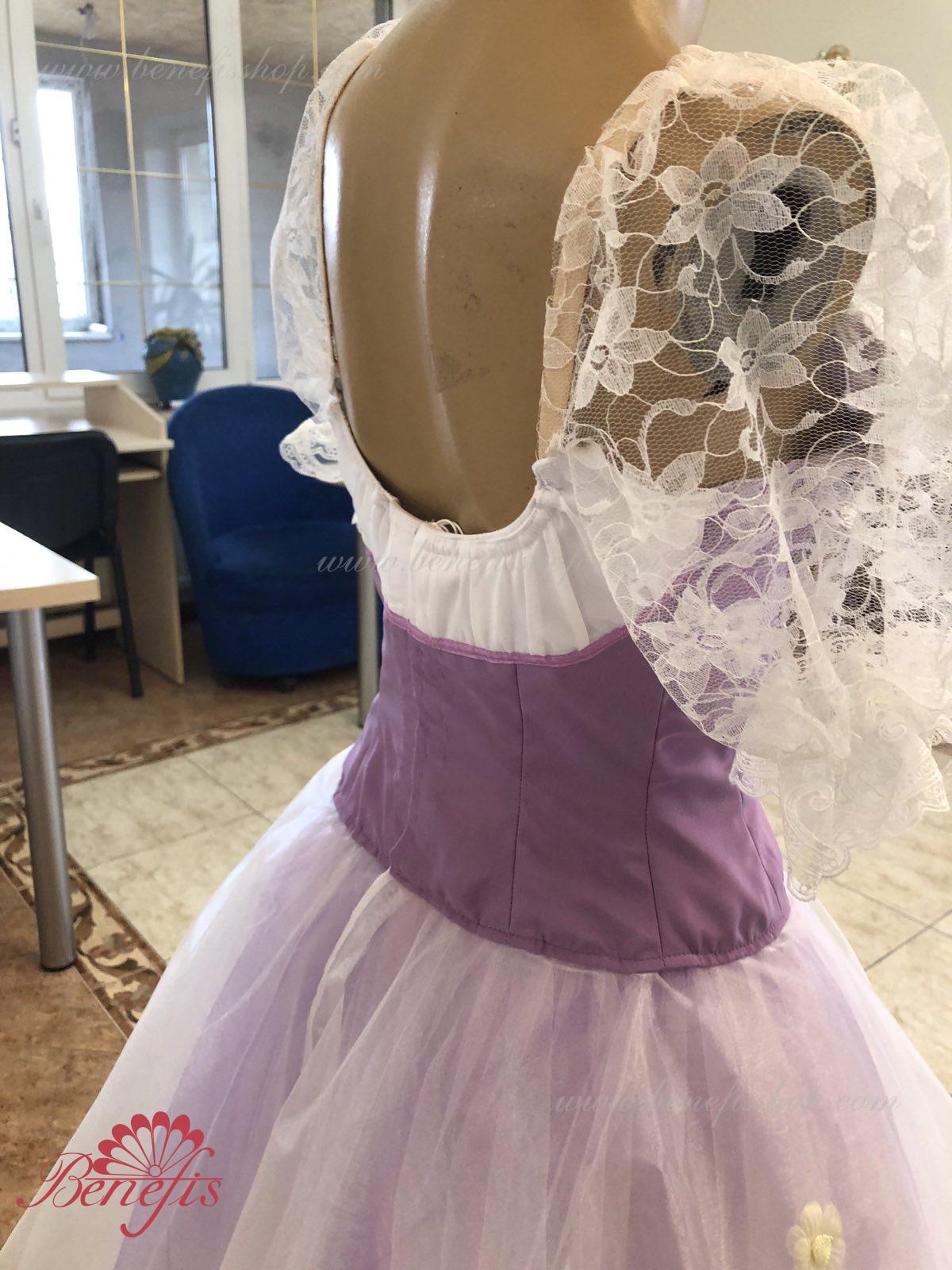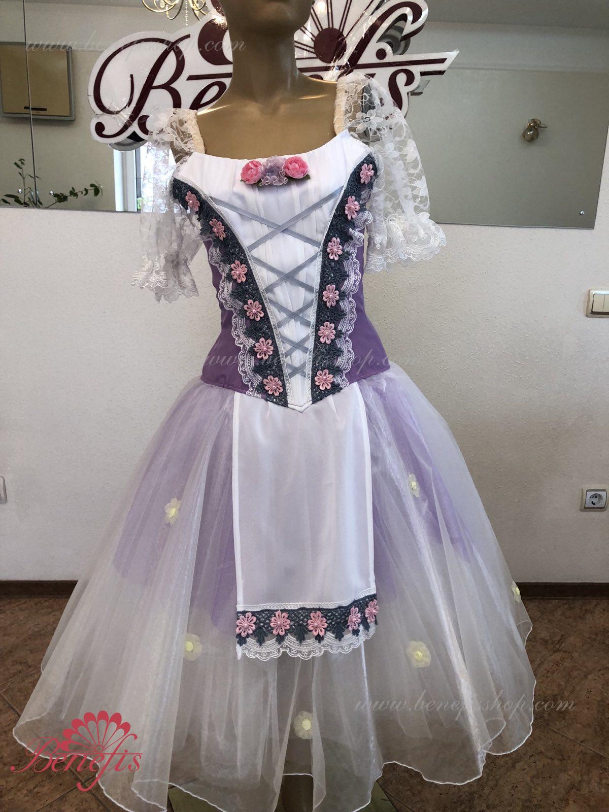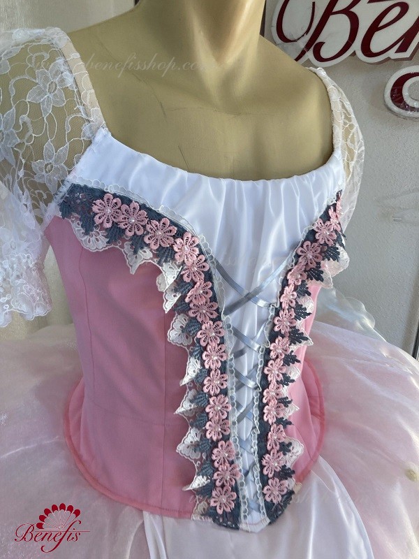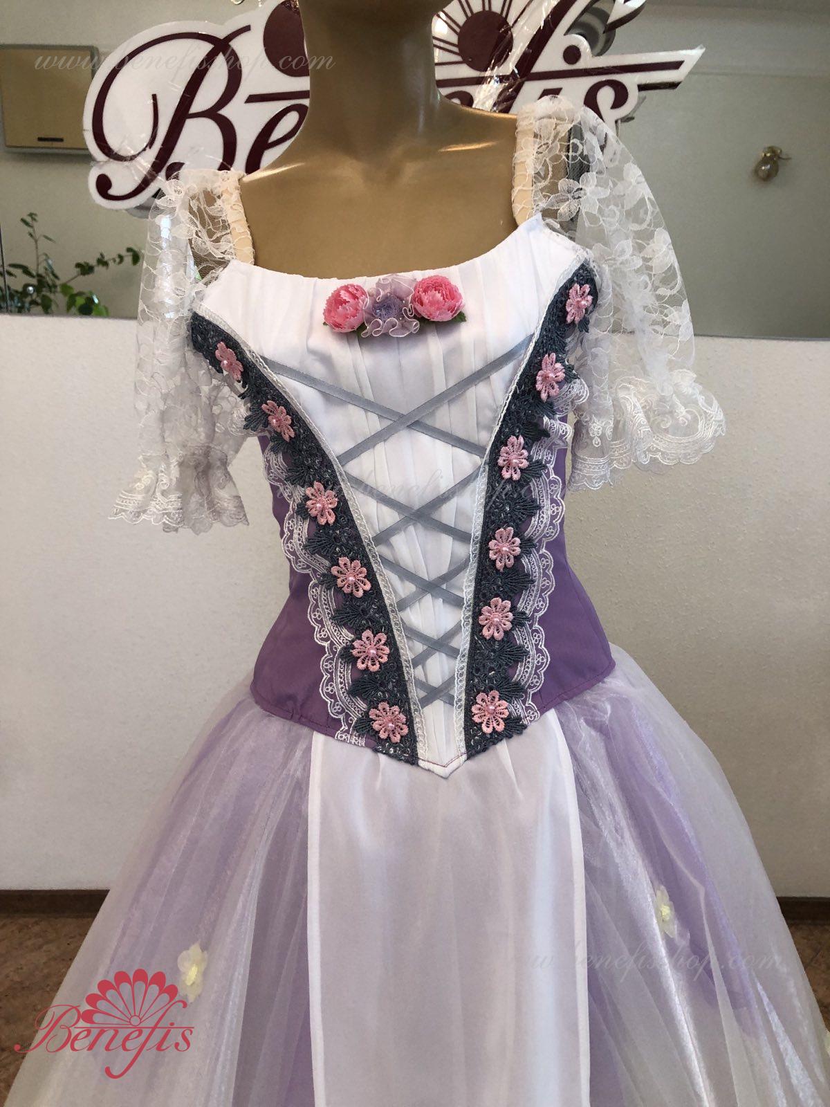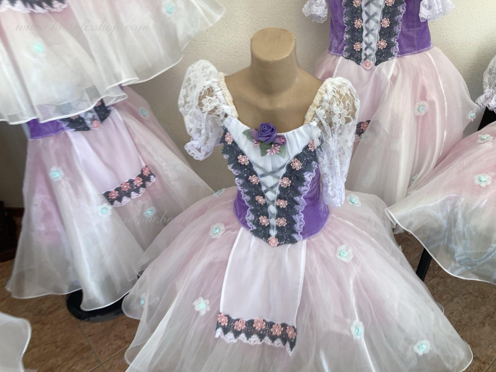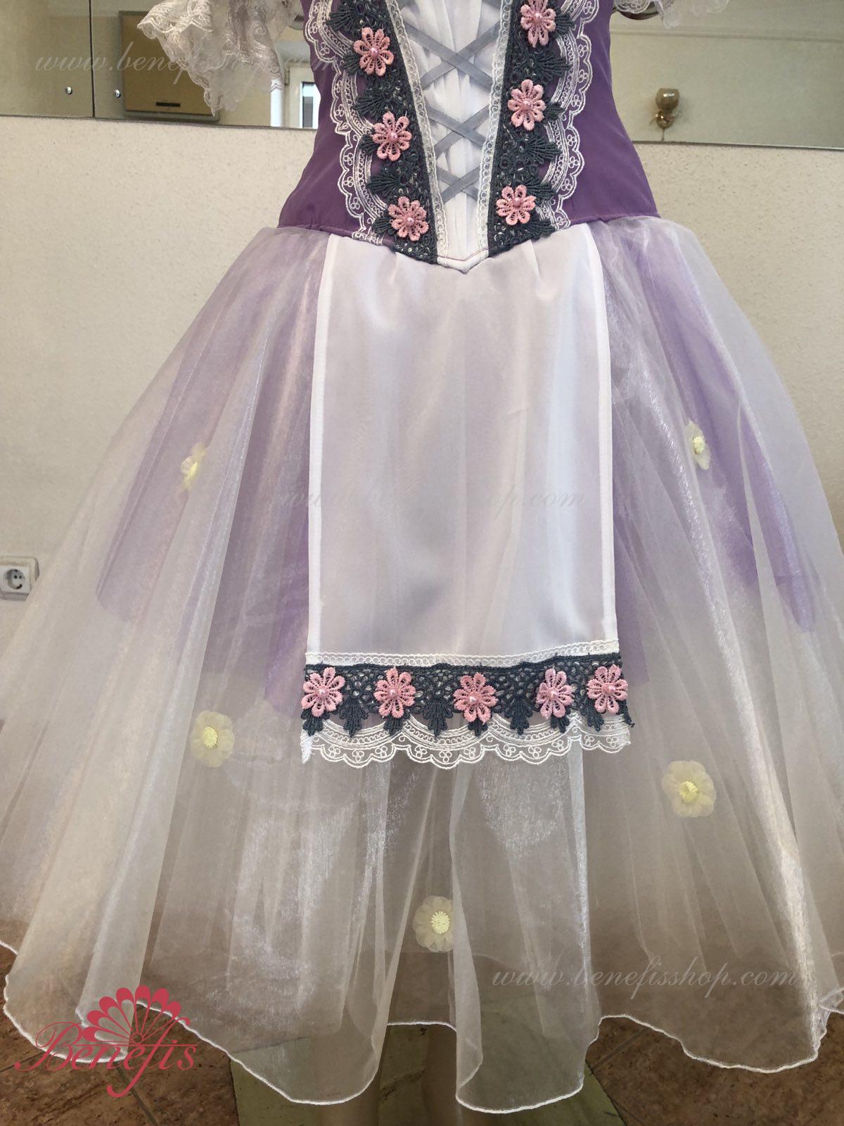 Сценический костюм выполнен на основе профессиональной романтической юбки состоящий из 3-х слоев фатина, которые покрываются легким шифоном с кружевом. Лиф выполняется из плотной ткани с декоративной шнуровкой спереди. Линия вставки по груди оторочена кружевом. Лиф застегивается на крючки в два ряда для удобного регулирования, а внутренний шнур служит для затягивания лифа в области груди. К телесным лямкам пришиты рукава-фонарики из шифона.