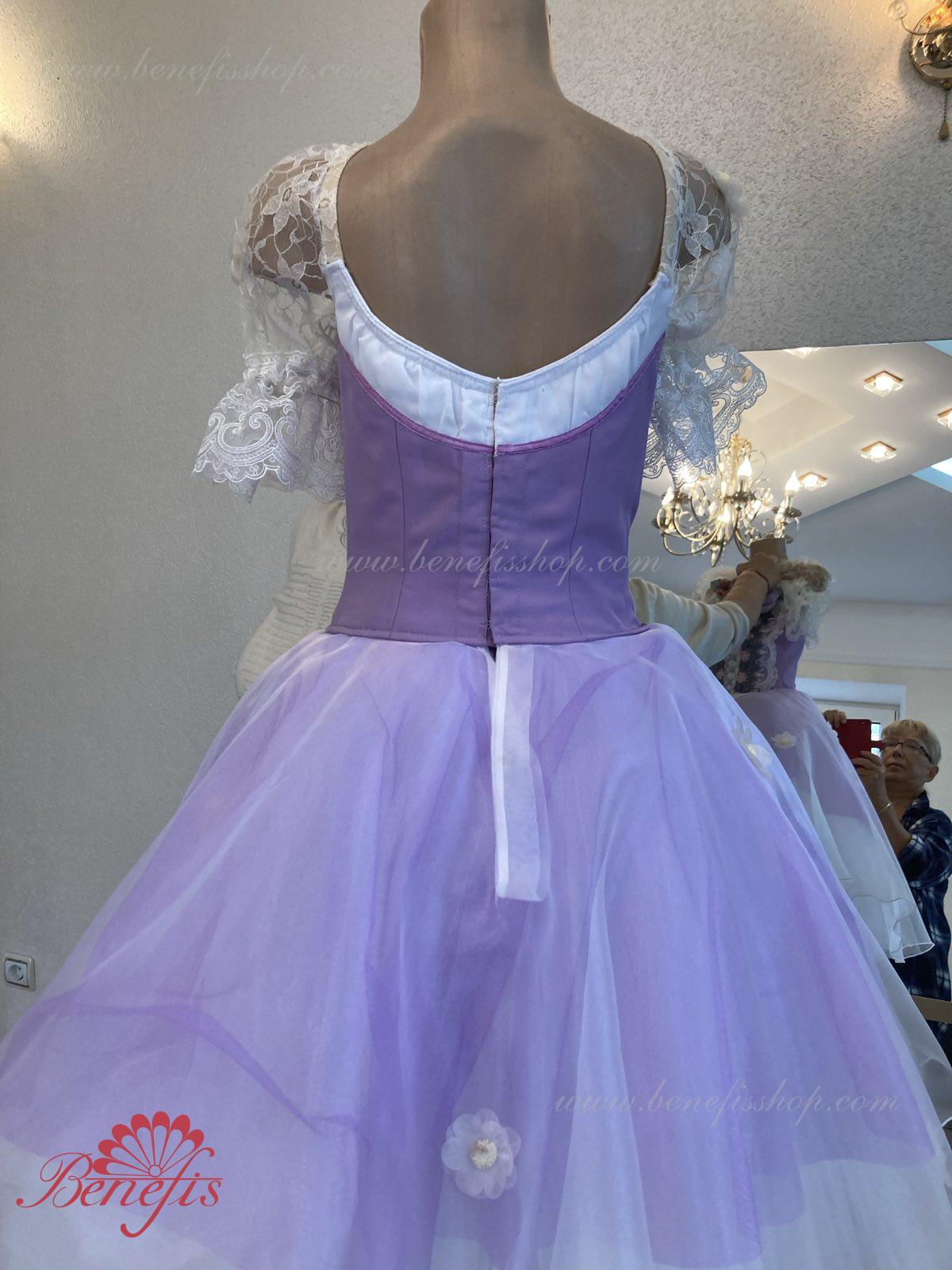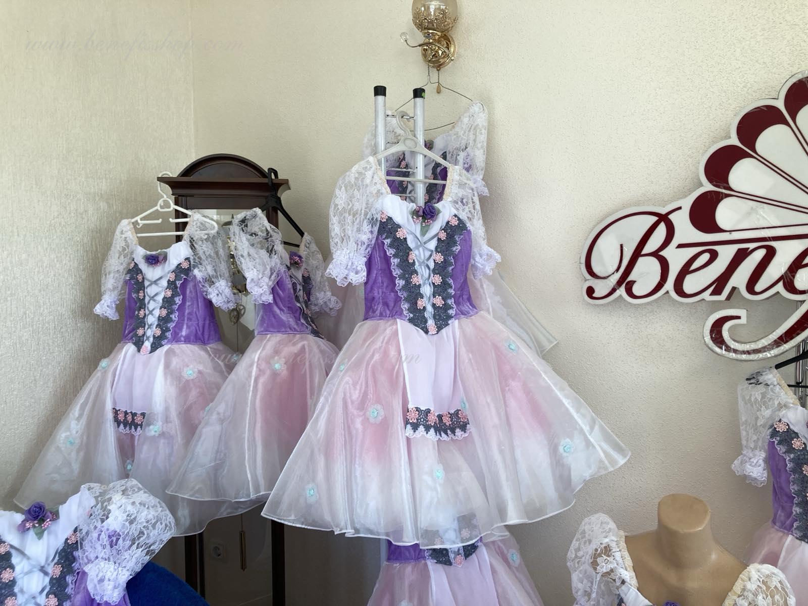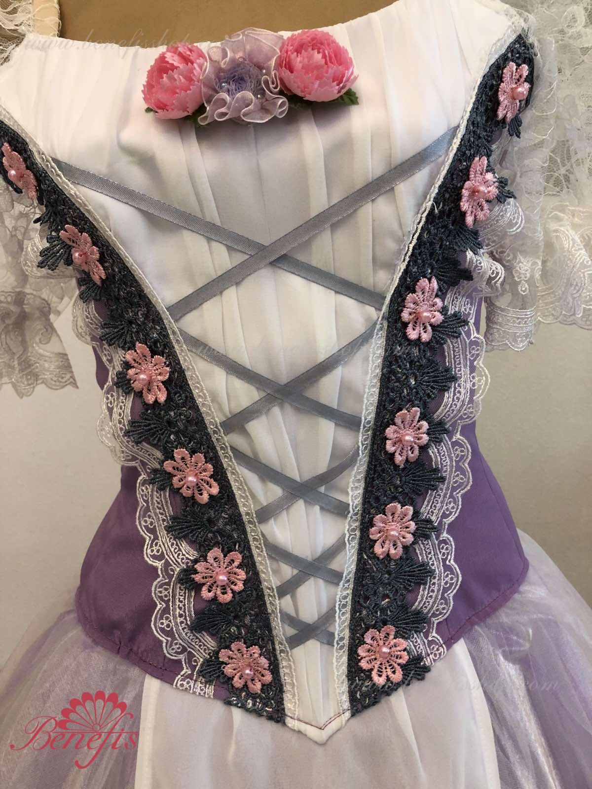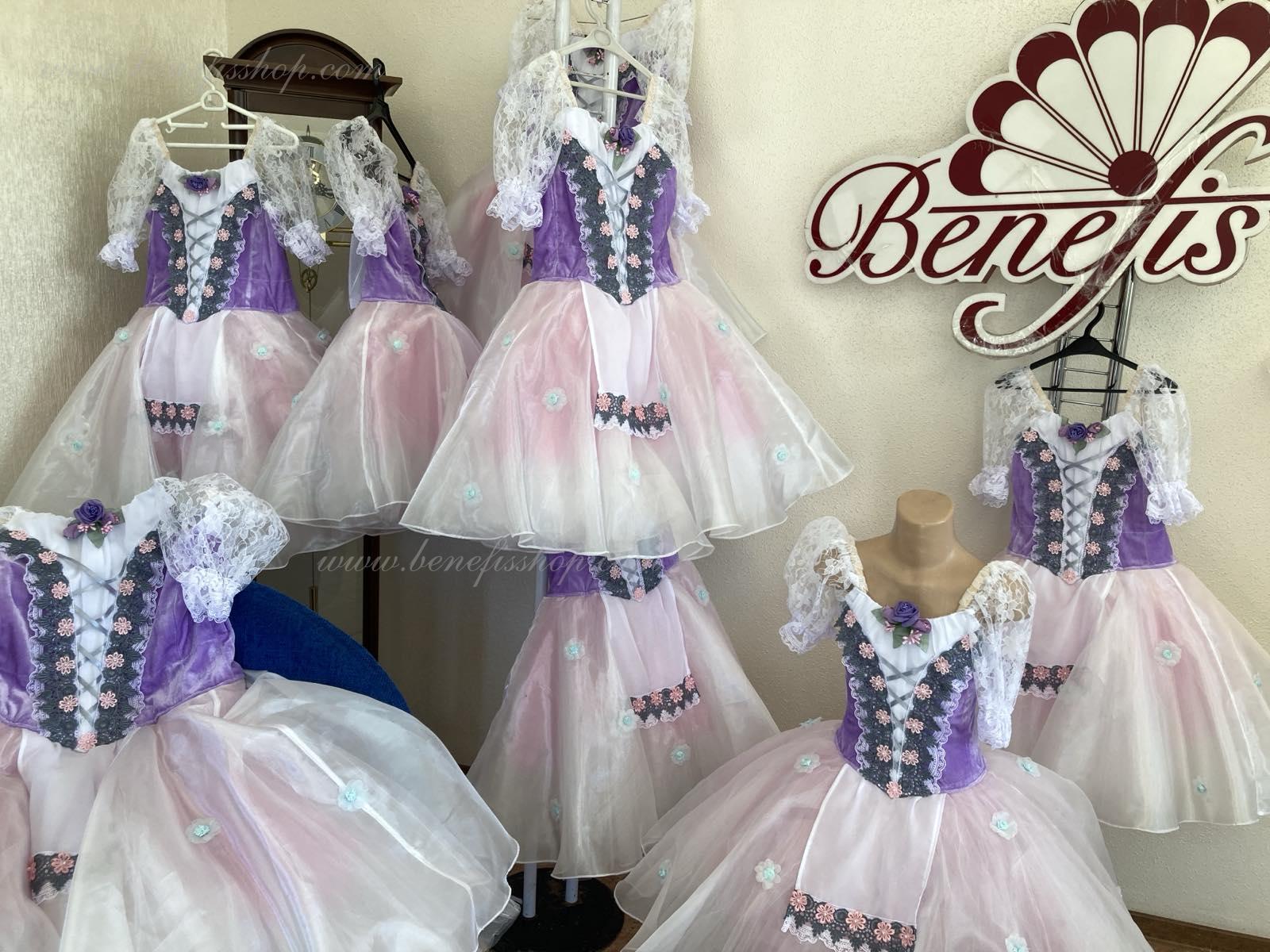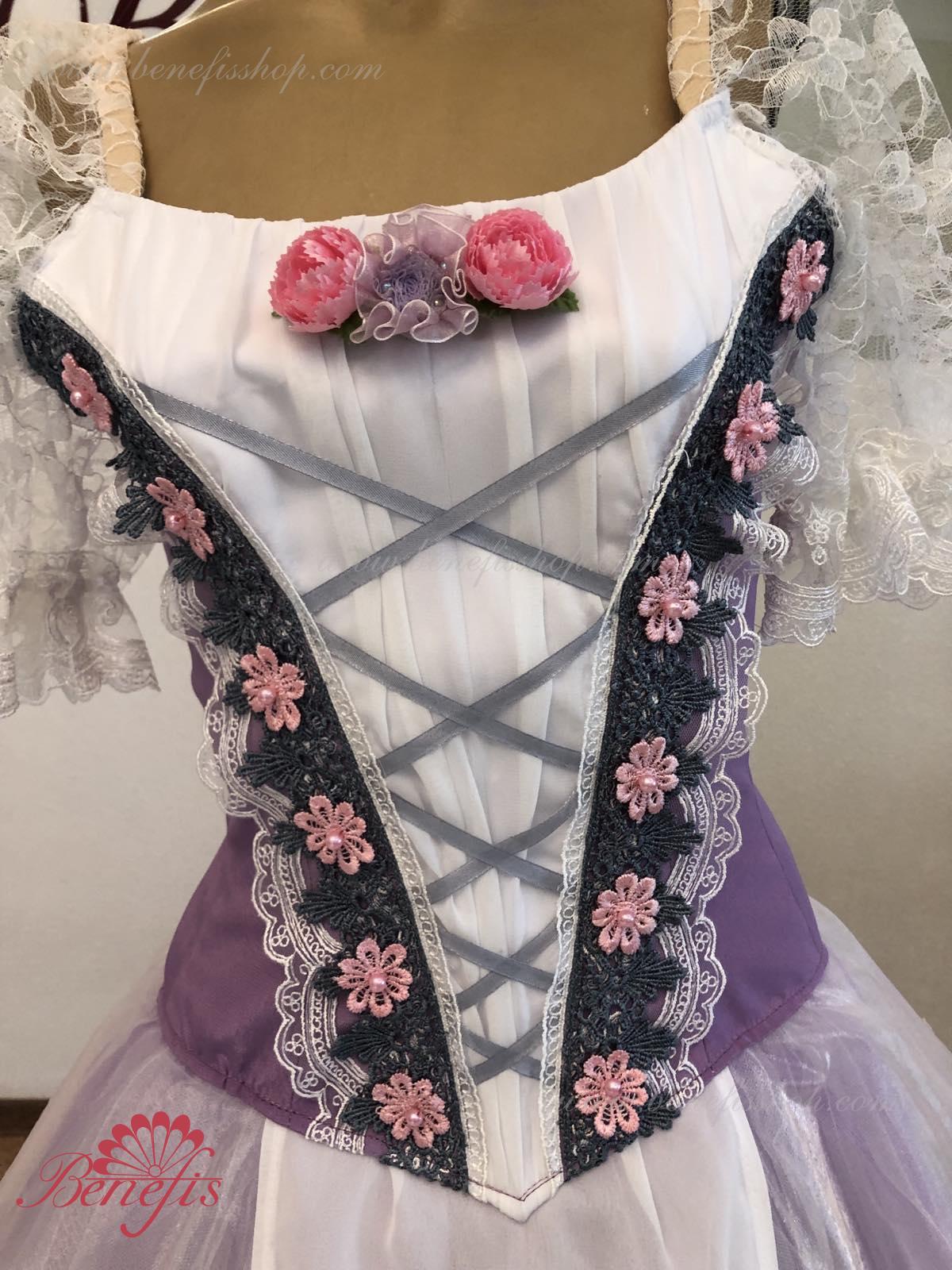 Сценический костюм выполнен на основе профессиональной романтической юбки состоящий из 3-х слоев фатина, которые покрываются легким шифоном с кружевом. Лиф выполняется из плотной ткани с декоративной шнуровкой спереди. Линия вставки по груди оторочена кружевом. Лиф застегивается на крючки в два ряда для удобного регулирования, а внутренний шнур служит для затягивания лифа в области груди. К телесным лямкам пришиты рукава-фонарики из шифона.