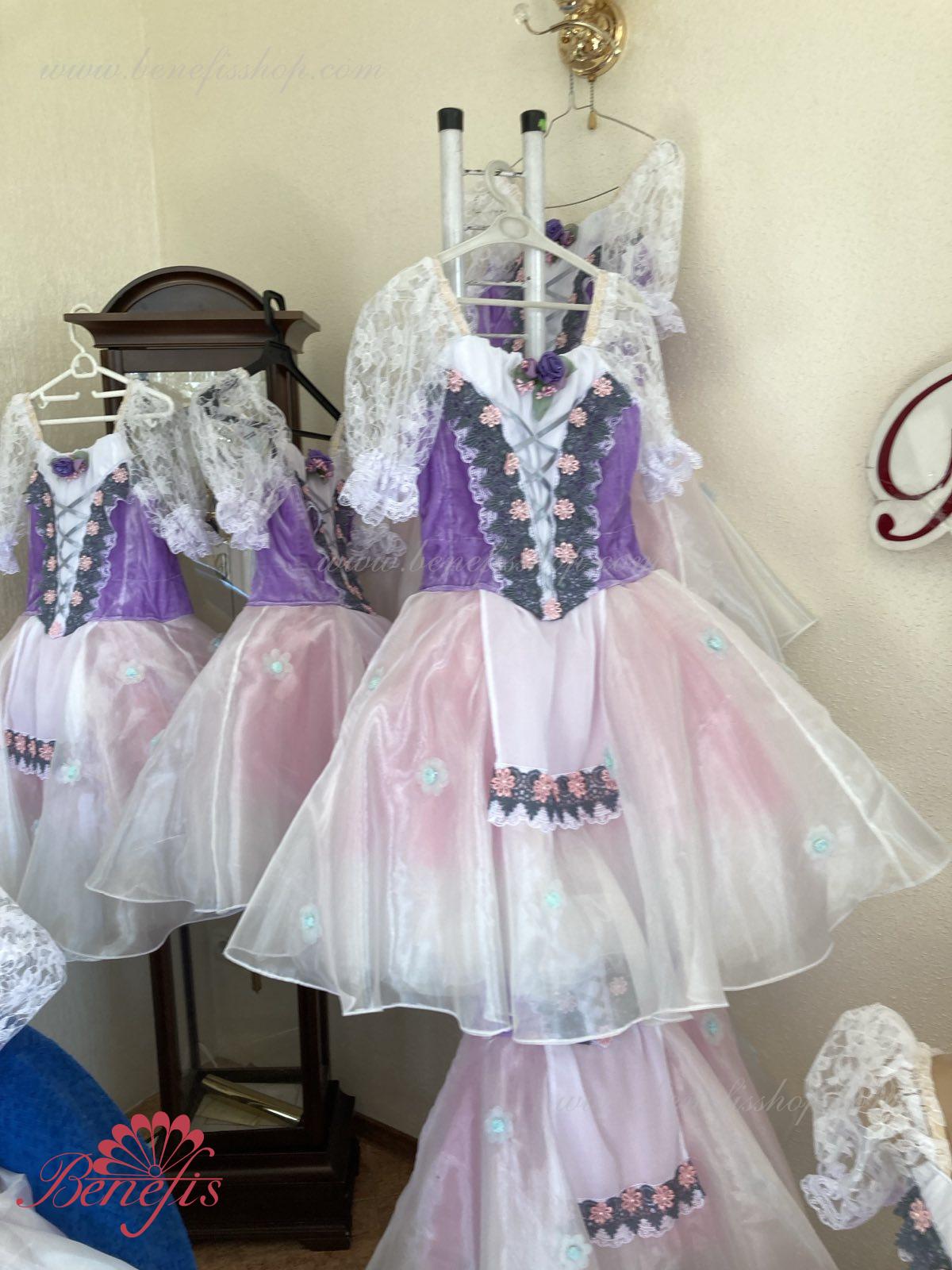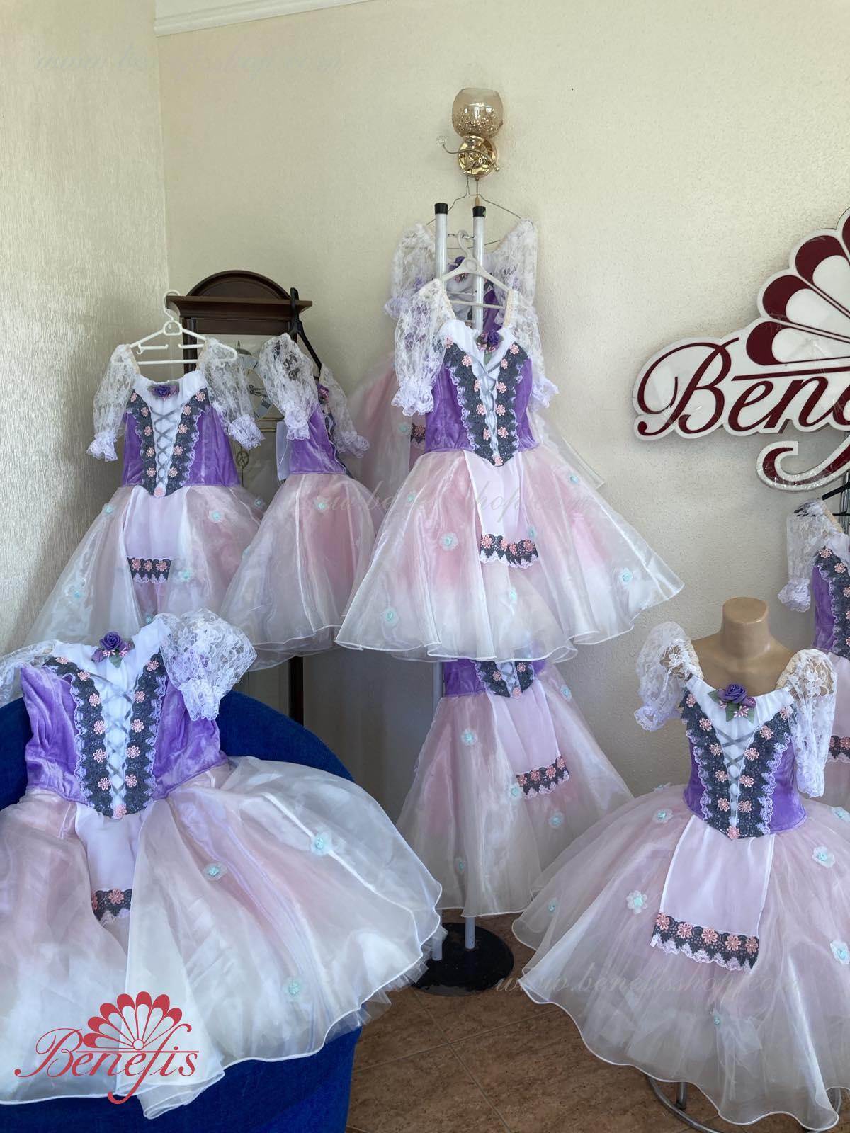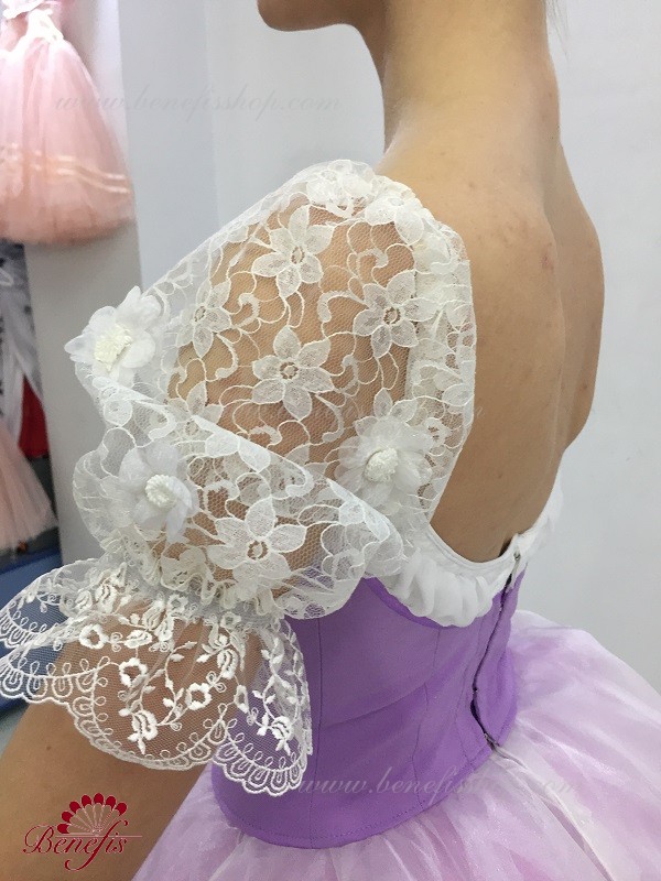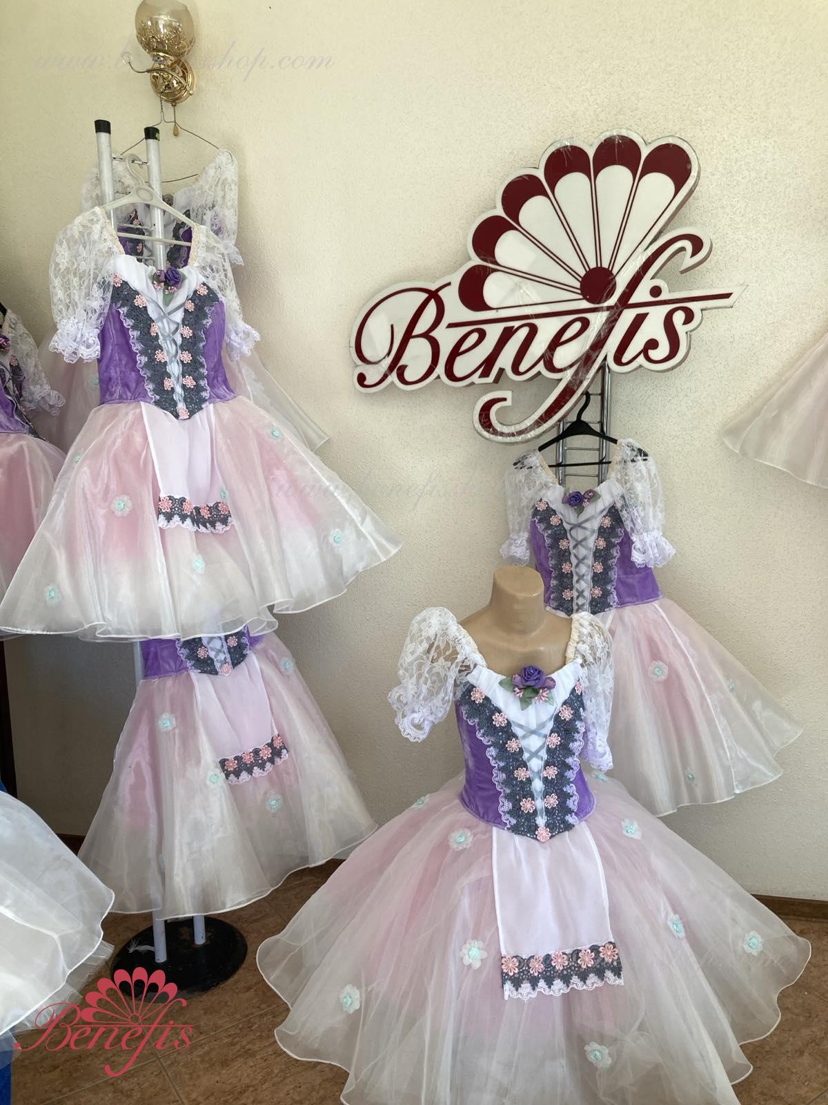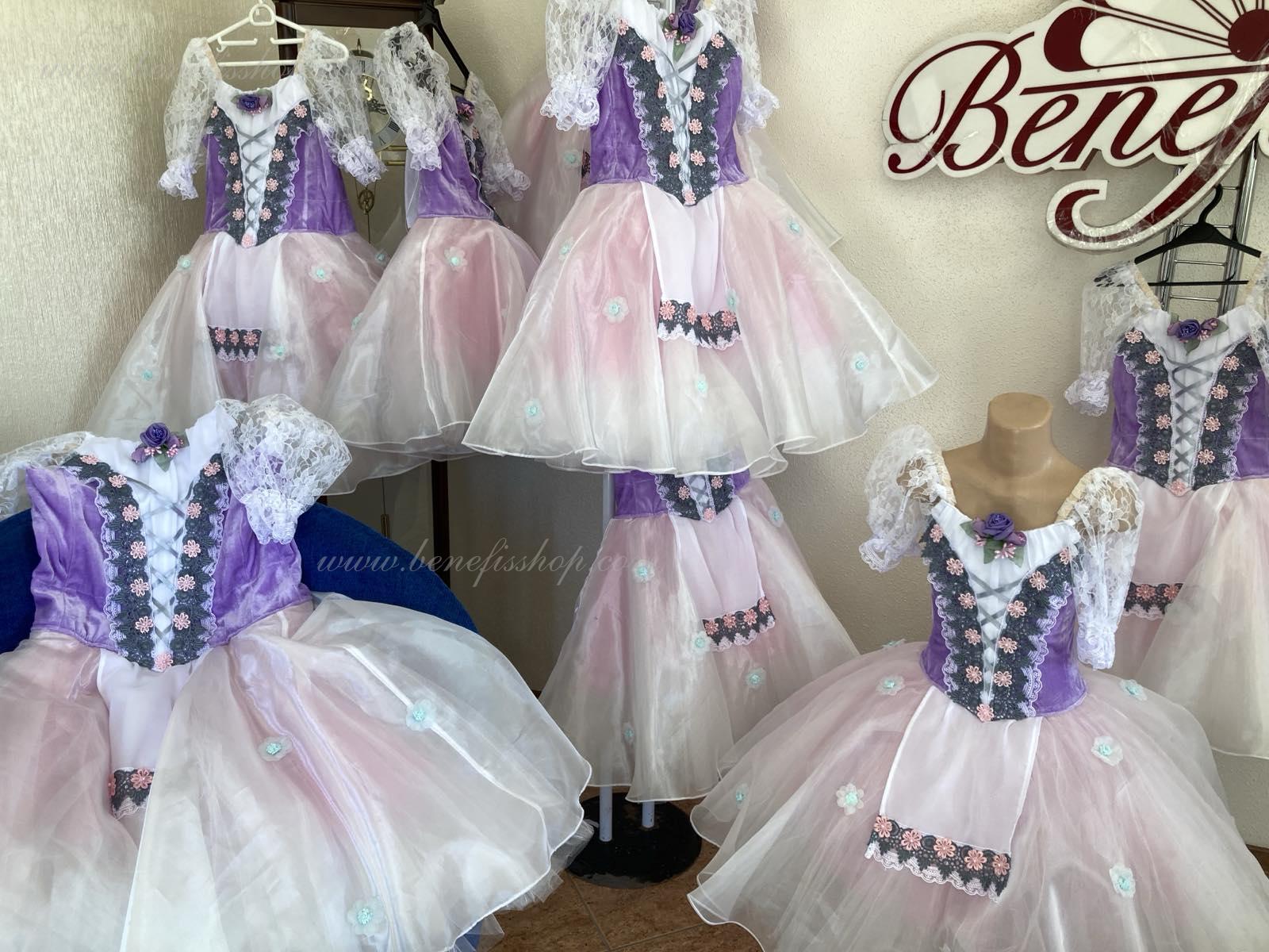 Сценический костюм выполнен на основе профессиональной романтической юбки состоящий из 3-х слоев фатина, которые покрываются легким шифоном с кружевом. Лиф выполняется из плотной ткани с декоративной шнуровкой спереди. Линия вставки по груди оторочена кружевом. Лиф застегивается на крючки в два ряда для удобного регулирования, а внутренний шнур служит для затягивания лифа в области груди. К телесным лямкам пришиты рукава-фонарики из шифона.
