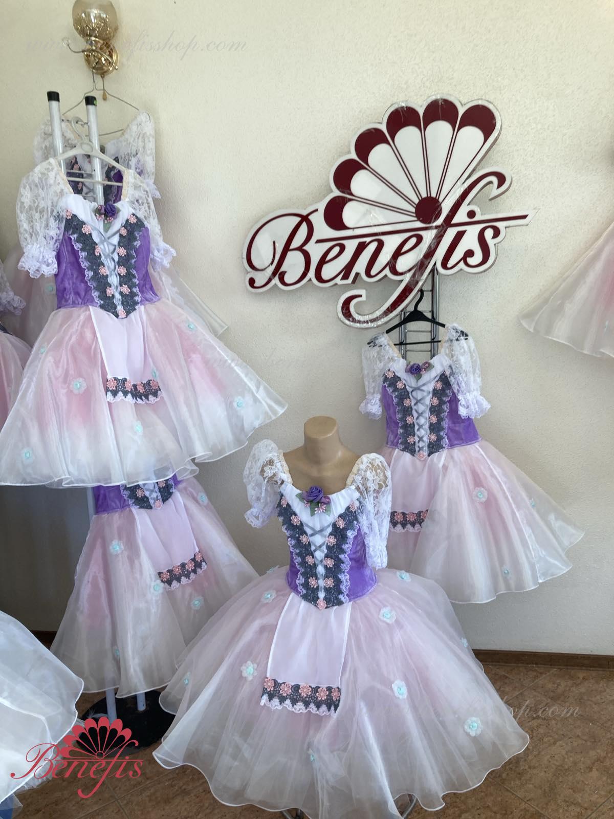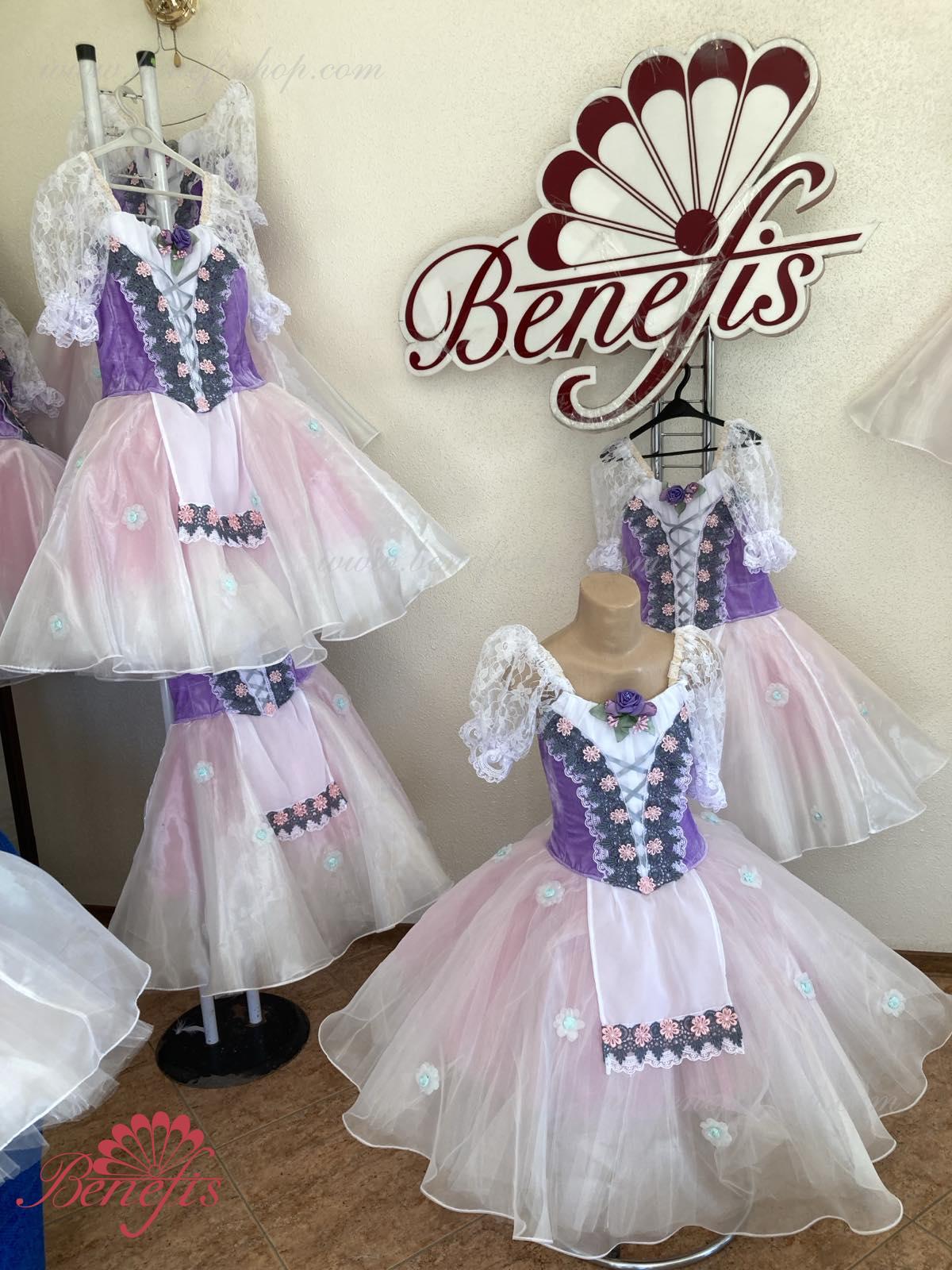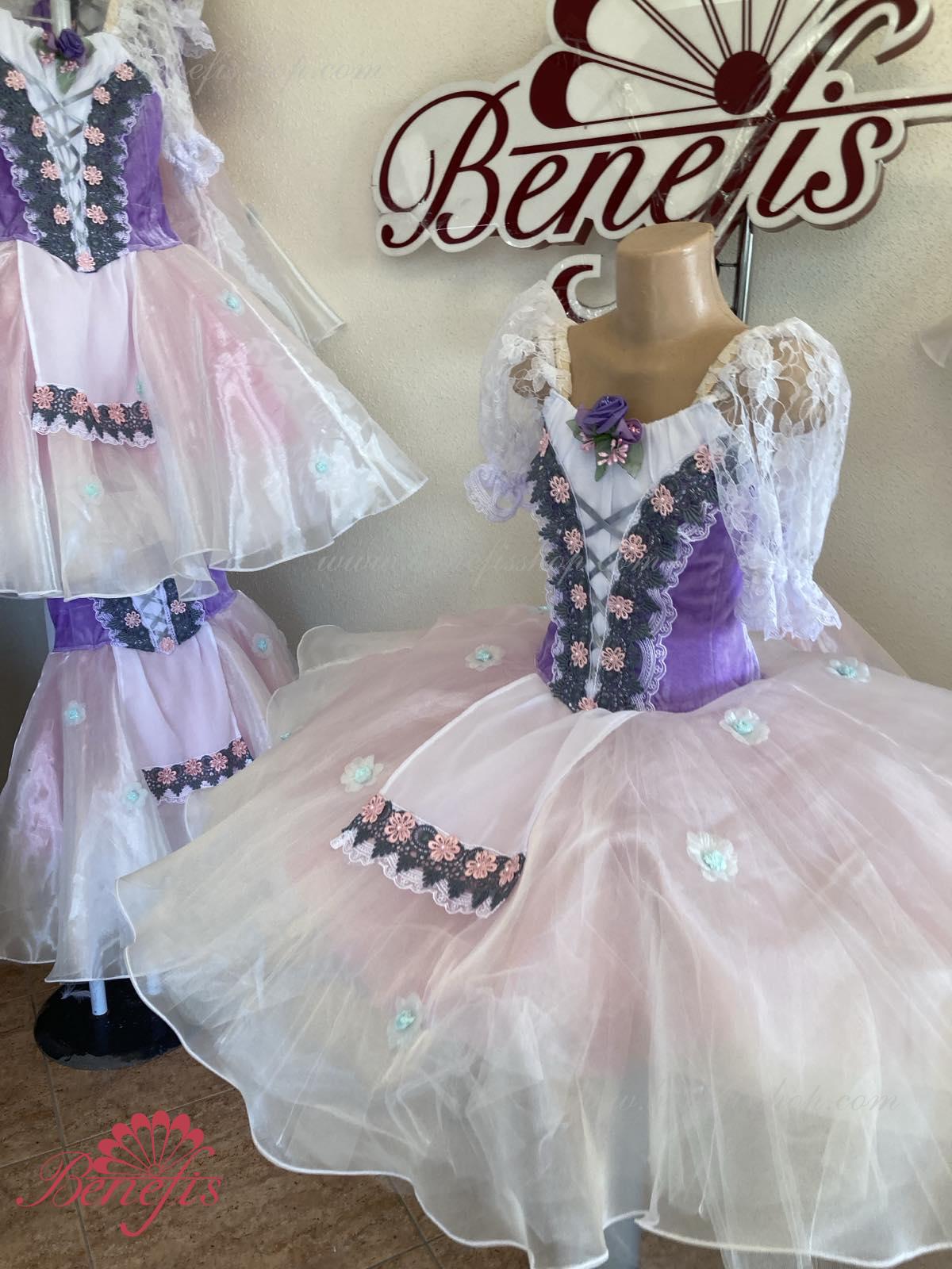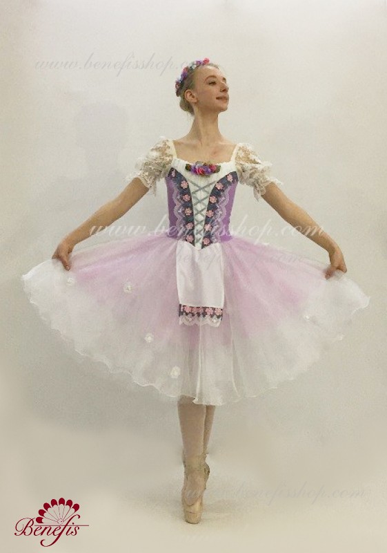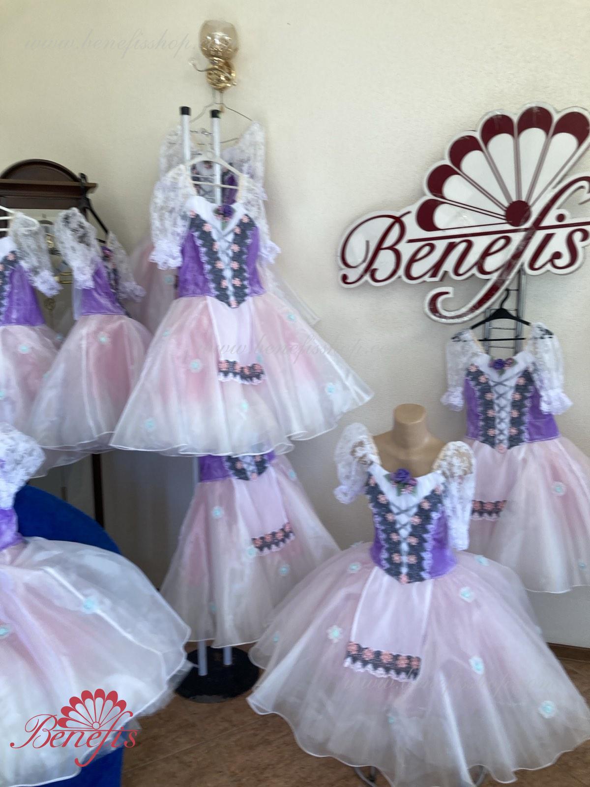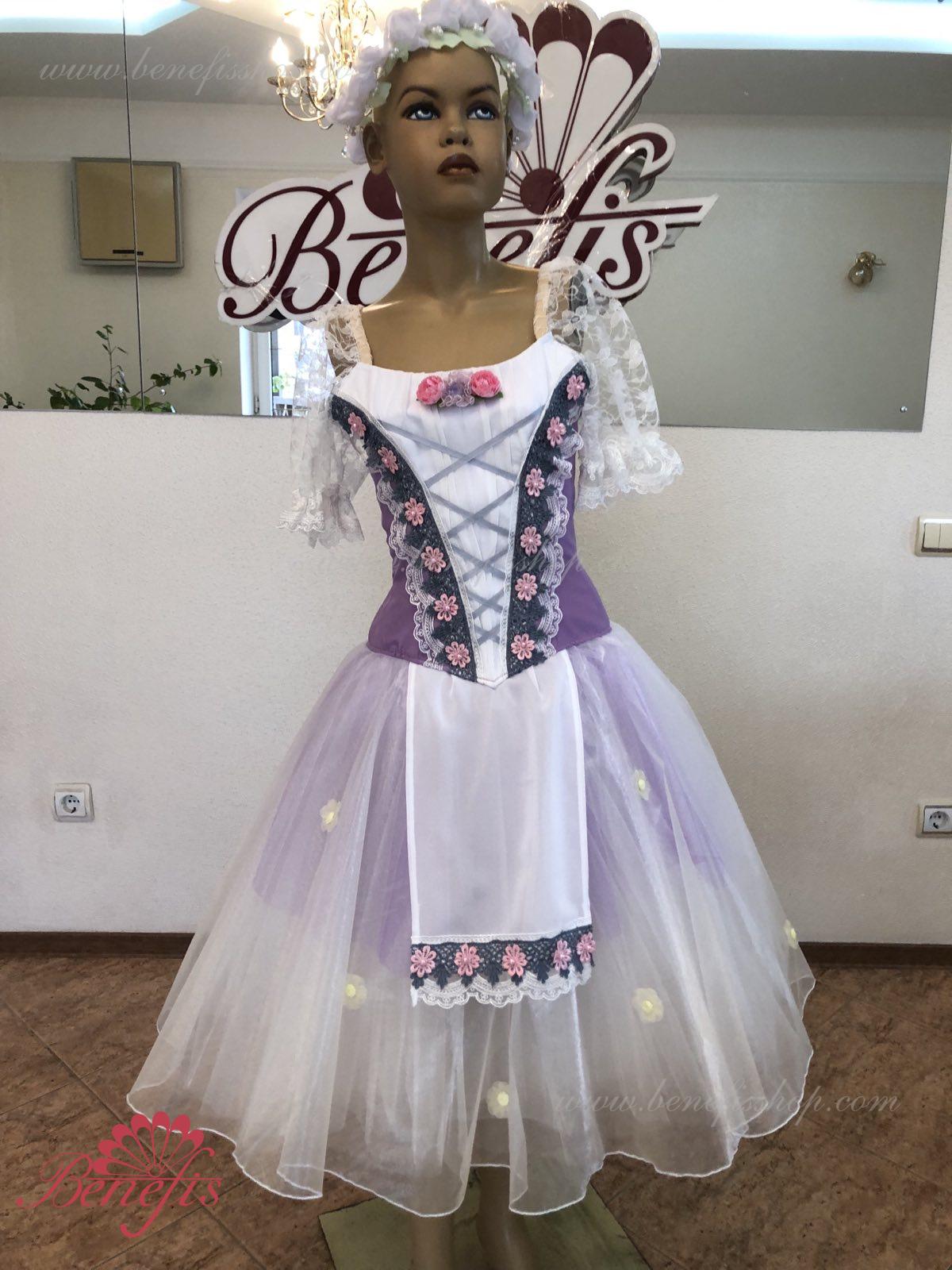 Сценический костюм выполнен на основе профессиональной романтической юбки состоящий из 3-х слоев фатина, которые покрываются легким шифоном с кружевом. Лиф выполняется из плотной ткани с декоративной шнуровкой спереди. Линия вставки по груди оторочена кружевом. Лиф застегивается на крючки в два ряда для удобного регулирования, а внутренний шнур служит для затягивания лифа в области груди. К телесным лямкам пришиты рукава-фонарики из шифона.
