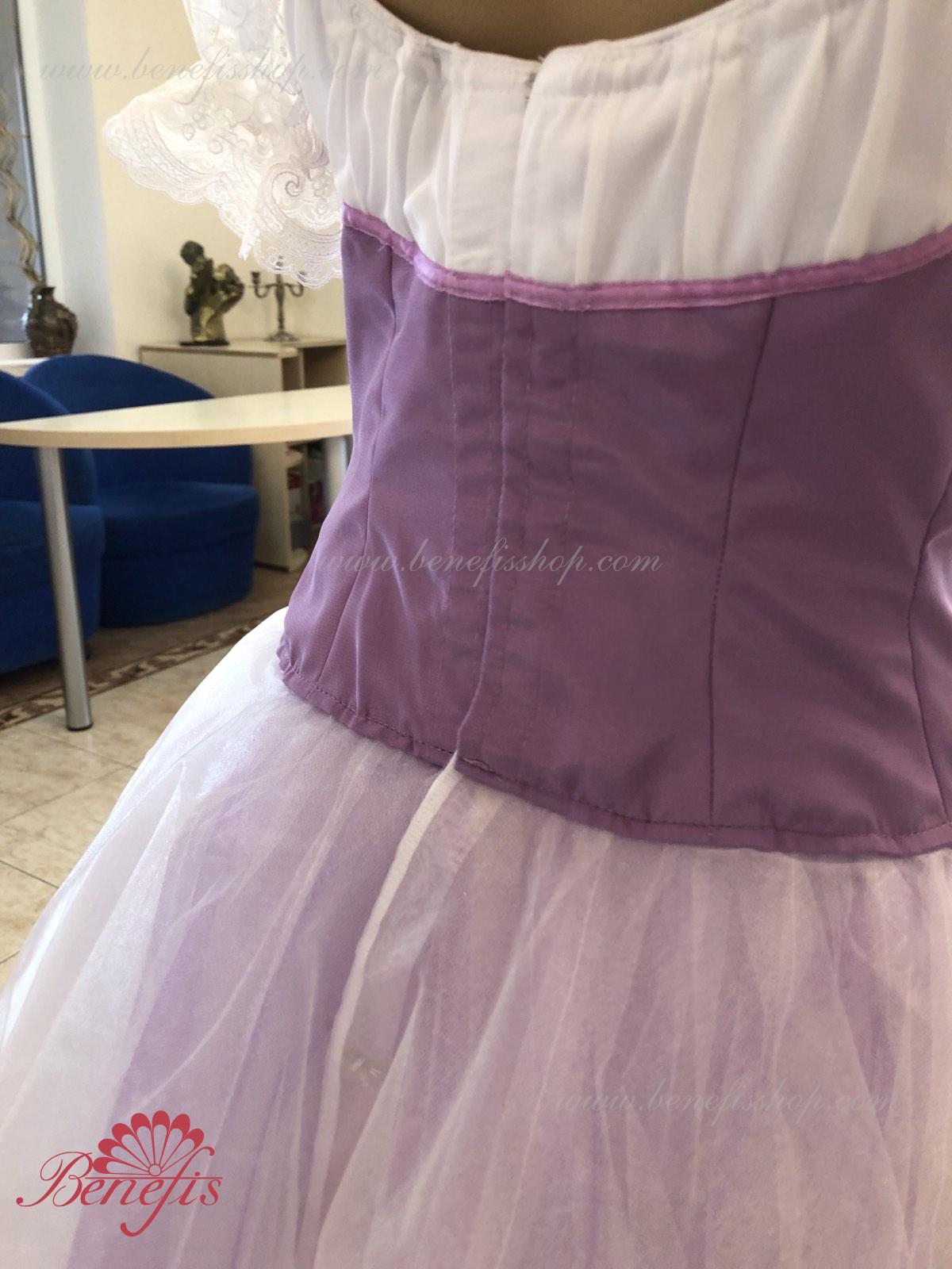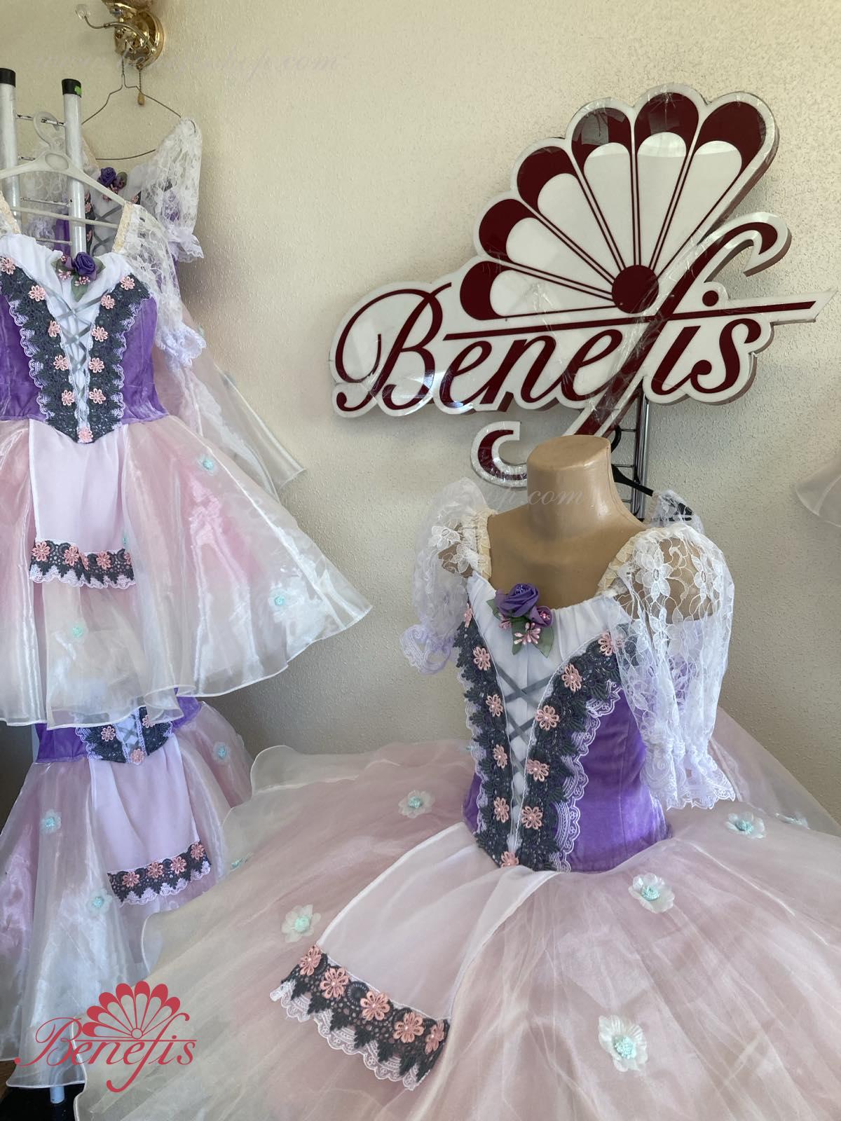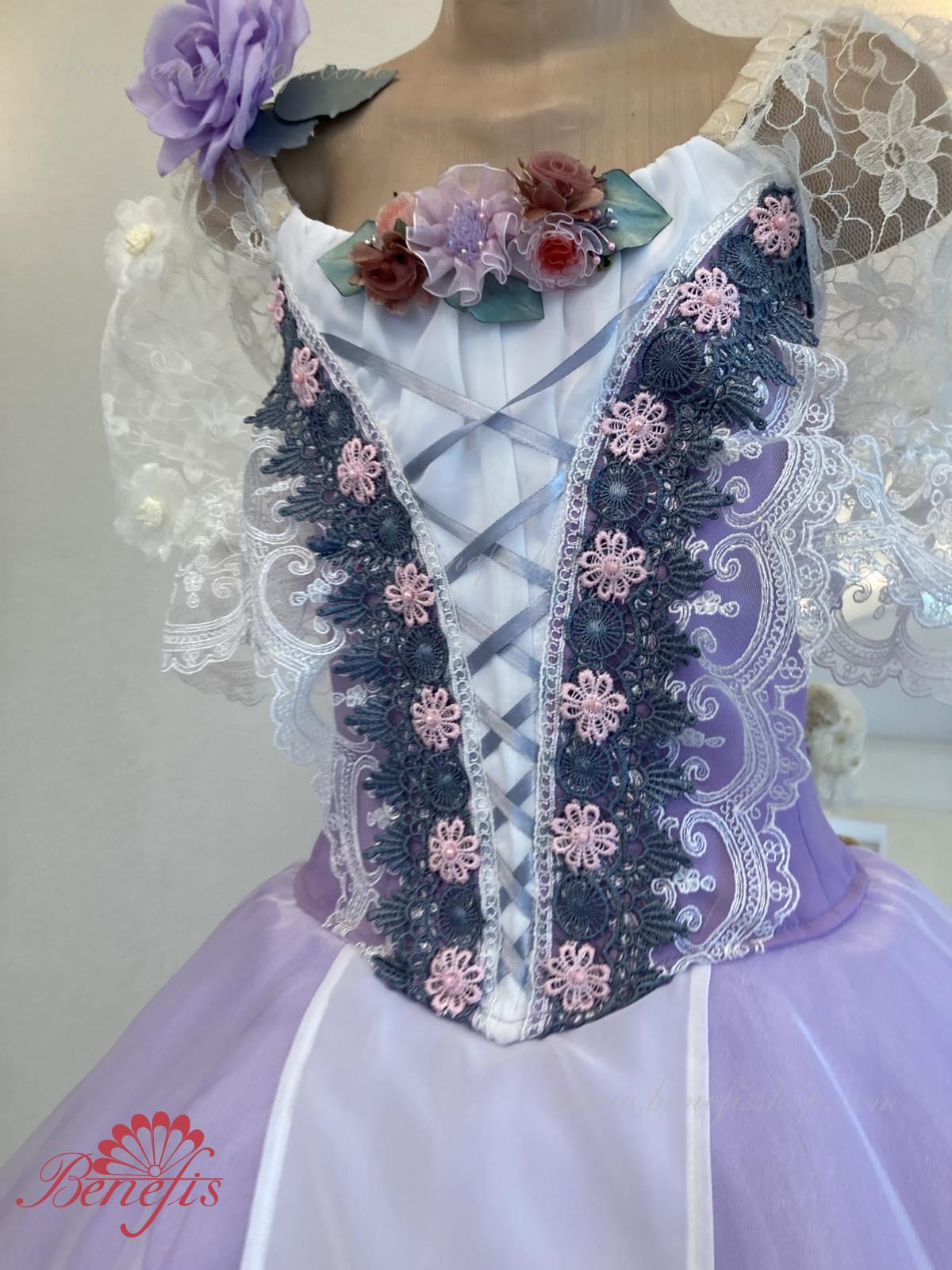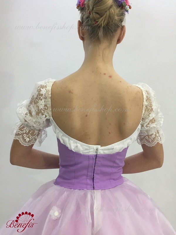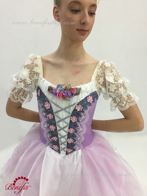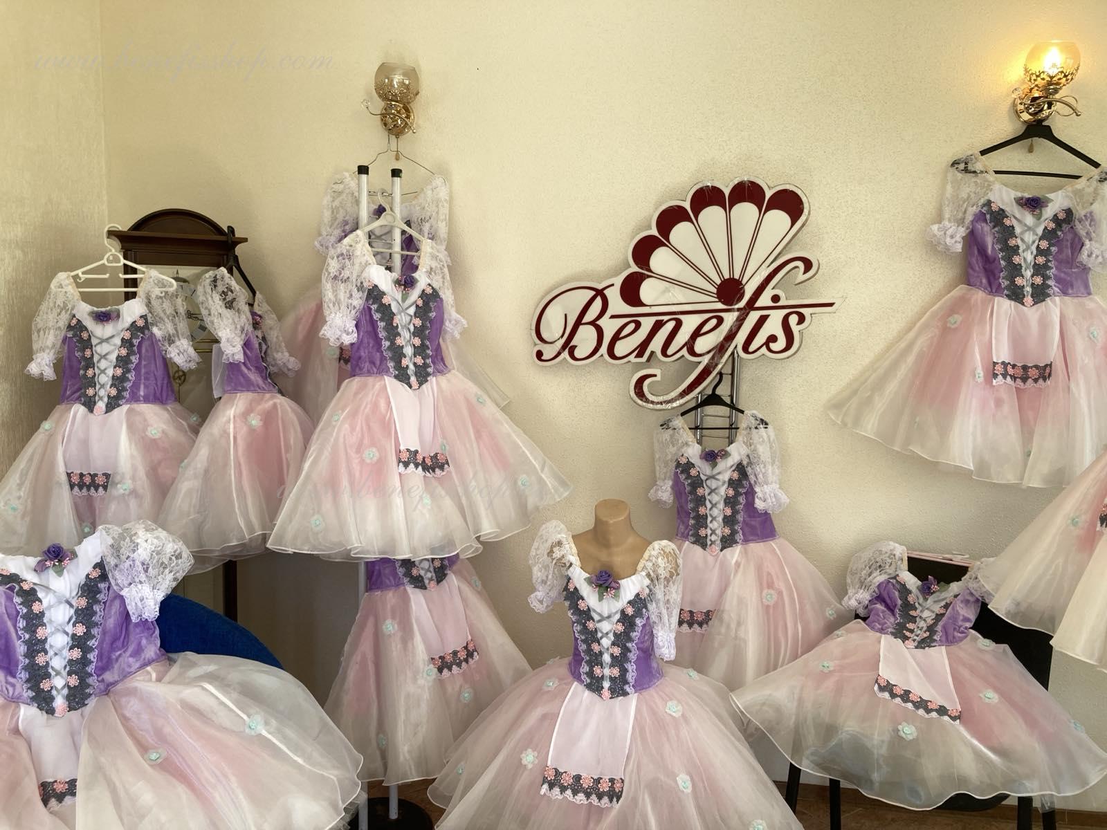 Сценический костюм выполнен на основе профессиональной романтической юбки состоящий из 3-х слоев фатина, которые покрываются легким шифоном с кружевом. Лиф выполняется из плотной ткани с декоративной шнуровкой спереди. Линия вставки по груди оторочена кружевом. Лиф застегивается на крючки в два ряда для удобного регулирования, а внутренний шнур служит для затягивания лифа в области груди. К телесным лямкам пришиты рукава-фонарики из шифона.