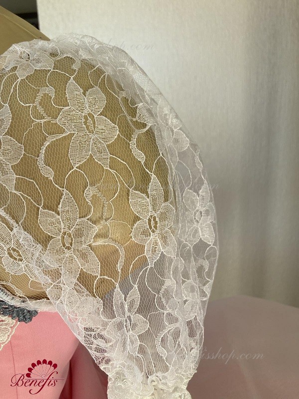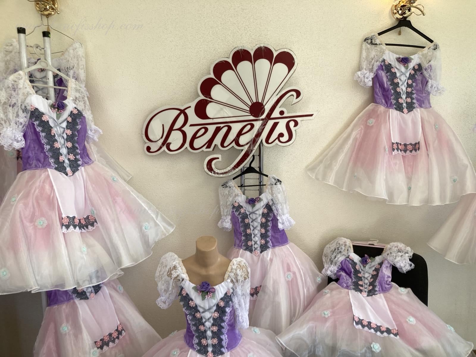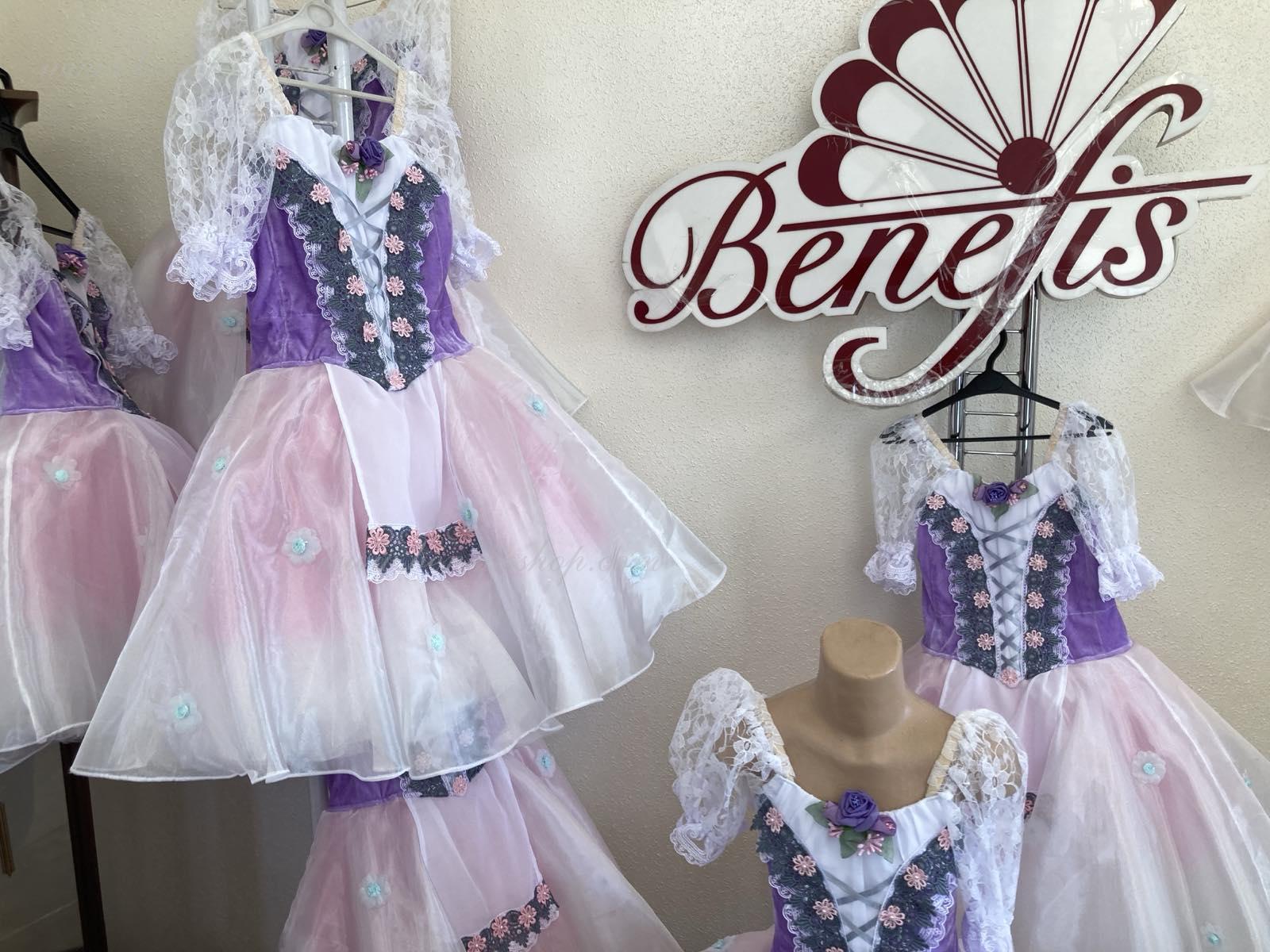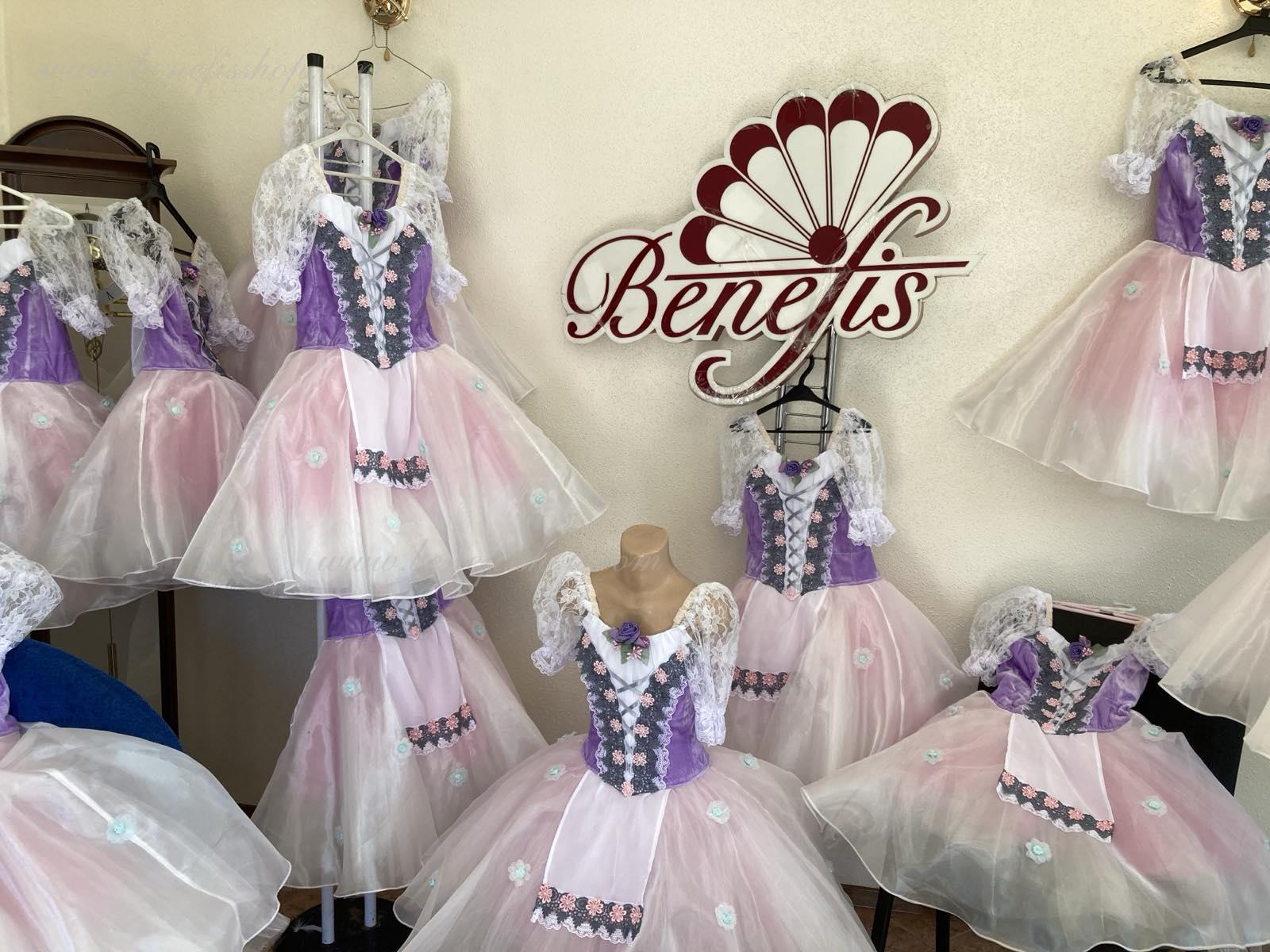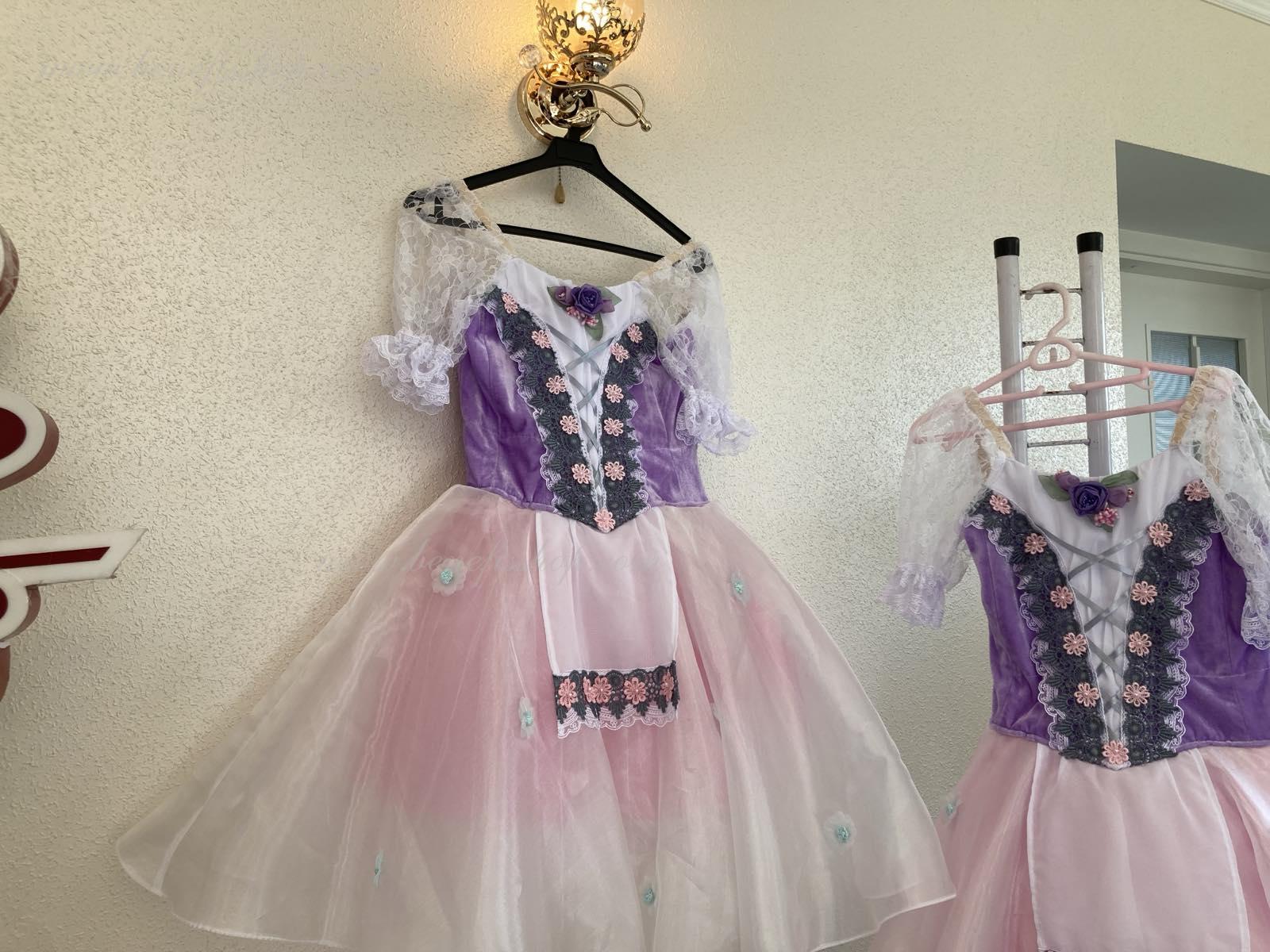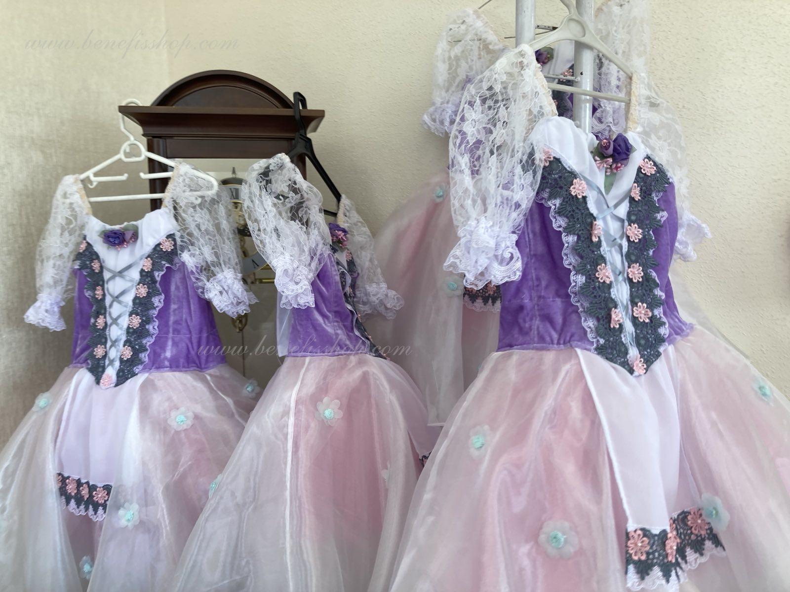 Сценический костюм выполнен на основе профессиональной романтической юбки состоящий из 3-х слоев фатина, которые покрываются легким шифоном с кружевом. Лиф выполняется из плотной ткани с декоративной шнуровкой спереди. Линия вставки по груди оторочена кружевом. Лиф застегивается на крючки в два ряда для удобного регулирования, а внутренний шнур служит для затягивания лифа в области груди. К телесным лямкам пришиты рукава-фонарики из шифона.
