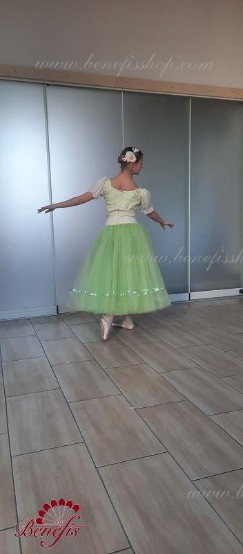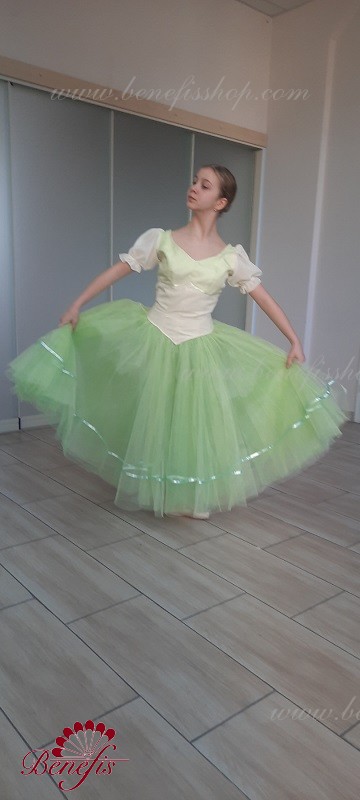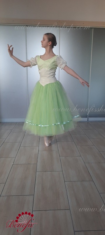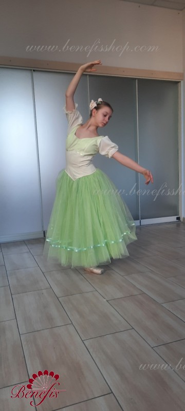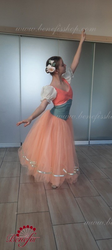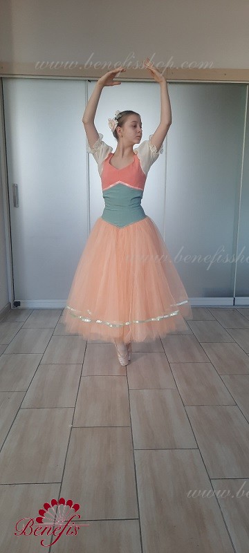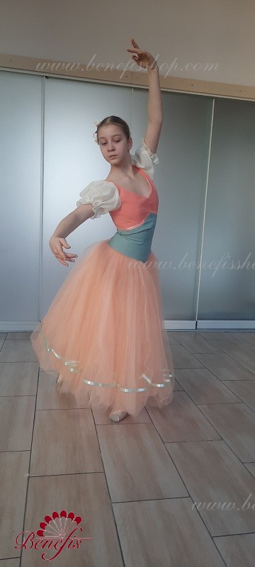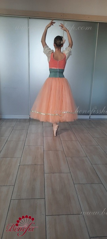 Детали: костюм. Лиф в двух цветах с плечевыми+ рукава фонарики. Юбка из фатина с лентой внизу.