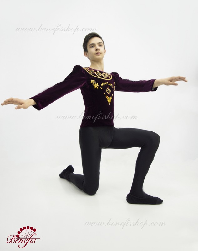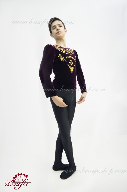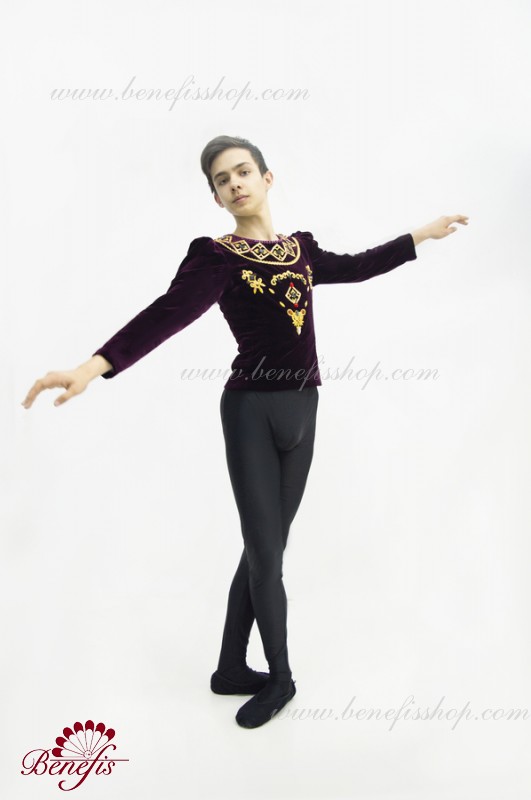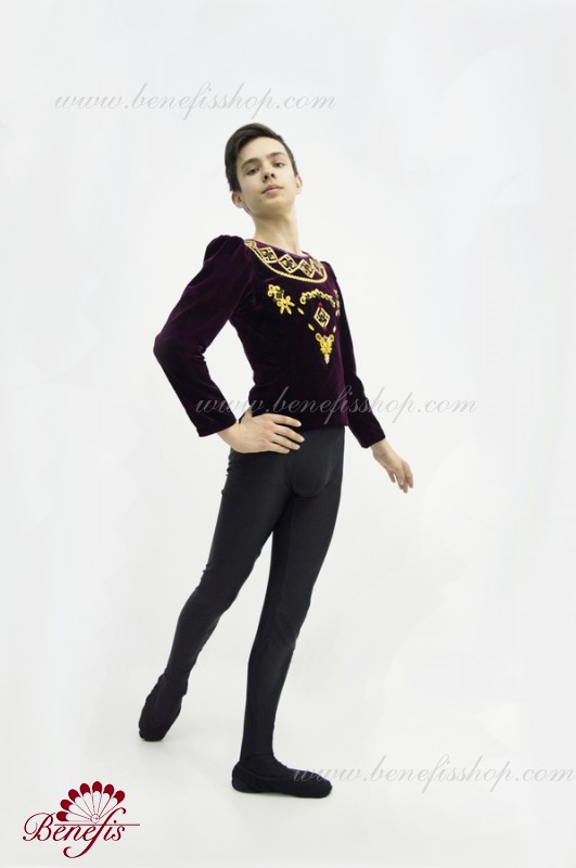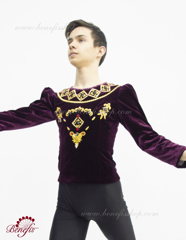 Это профессиональный сценический костюм. Выполнен из полу эластичной плотной ткани- бархата, по бокам имеются эластичные вставки для удобства движения. Узкие рукава расширяются к верху и собираются в фонарик из богатого бархата. Колет застегивается сзади на два ряда крючков и петель для удобного регулирования.