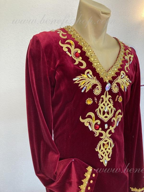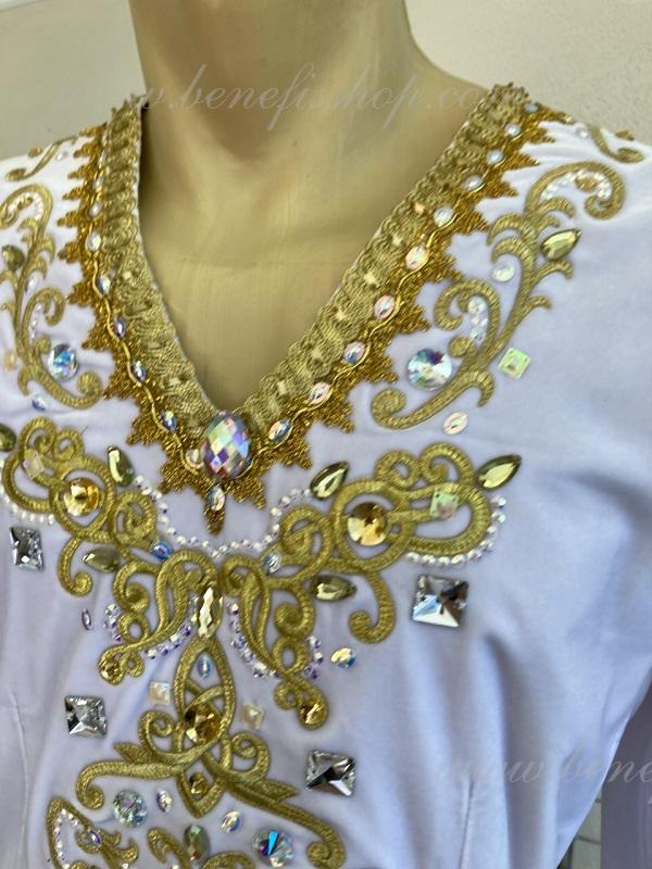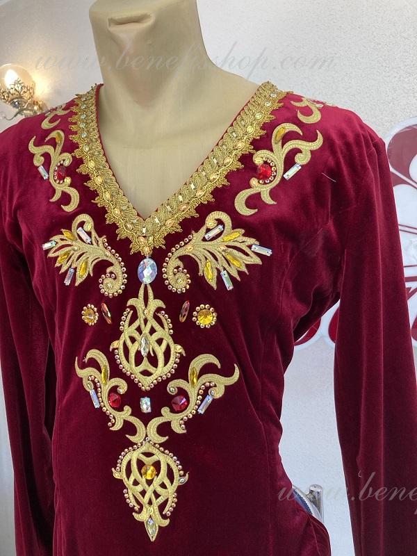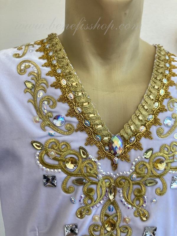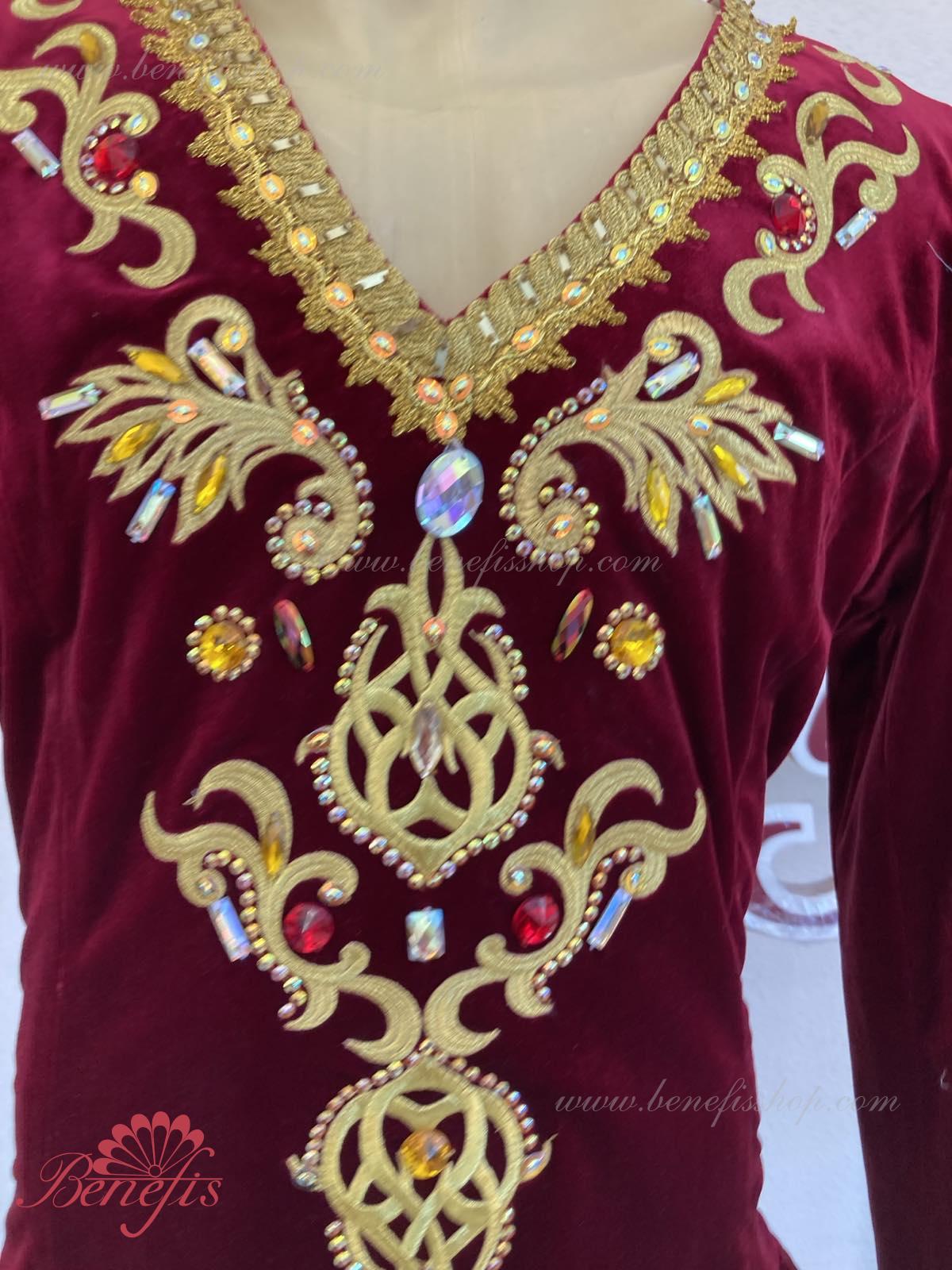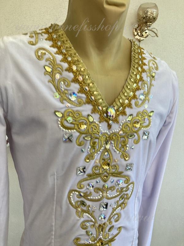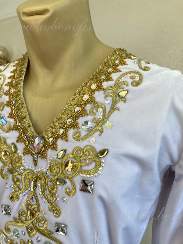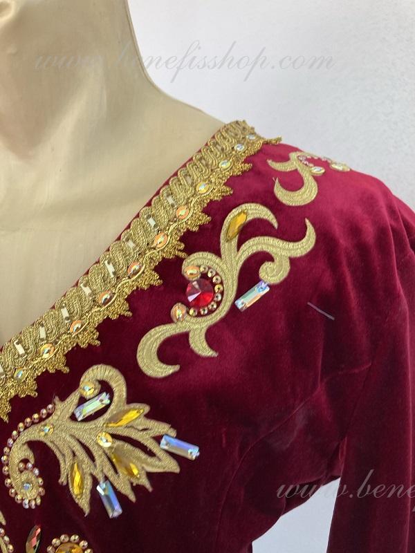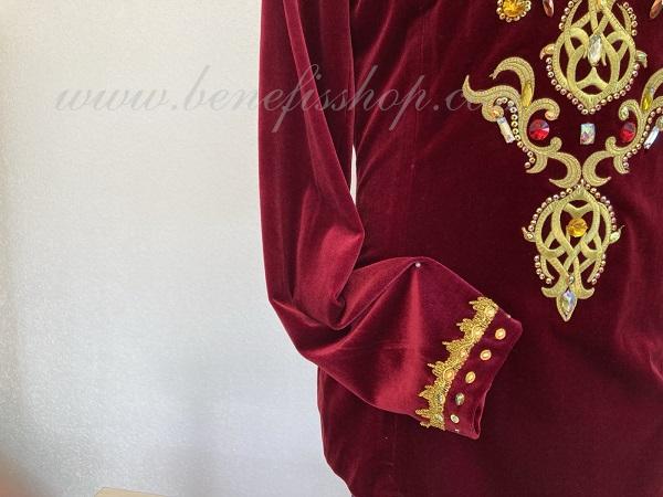 Богатый декор по всей длине передней части колета продолжается на спине и состоит из многочисленных аппликаций, страз, блесток.