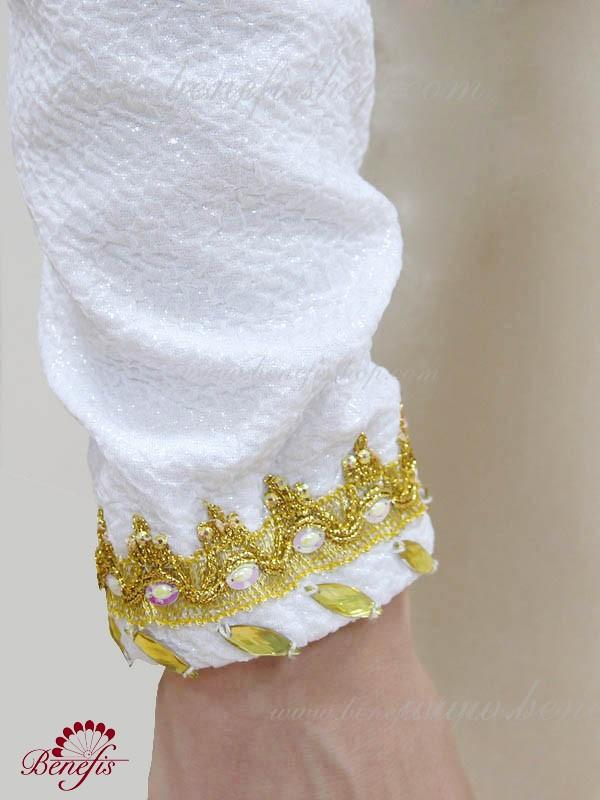 Отороченный тесьмой вырез и рукава подчеркивают элегантность костюма.