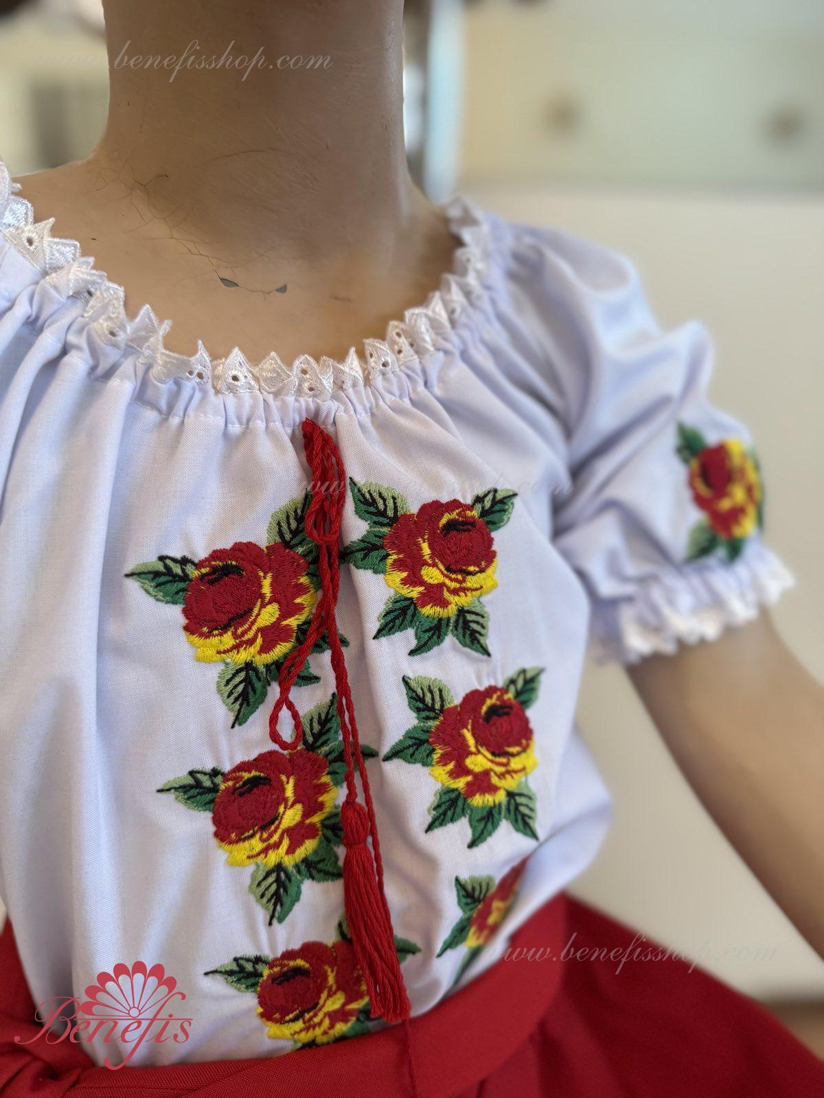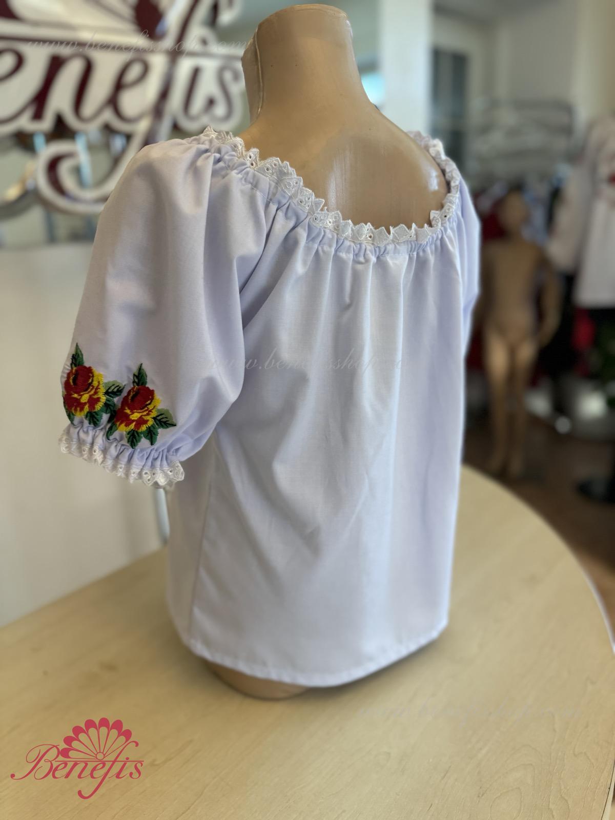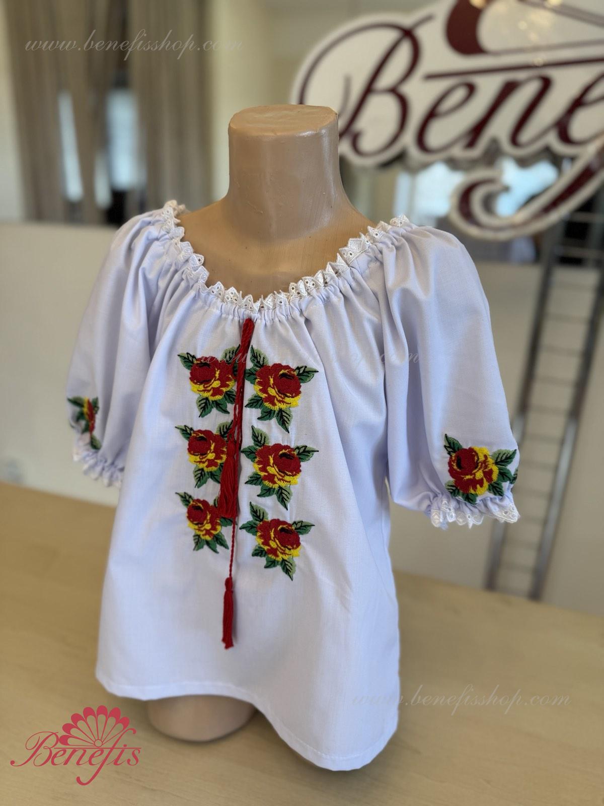 Блуза выполнена из сорочечной ткани. На горловине и рукавах вставлена резинка и от декорирована натуральным кружевом . Вышивка выполнена в национальном стиле на специальной машине. Юбка , пояс и жилетка не входит в цену. В дополнение к блузке вы можете заказать юбку J0123(4471),J0354(4811) пояс J0372(4940) и жилетку J0171(4525).