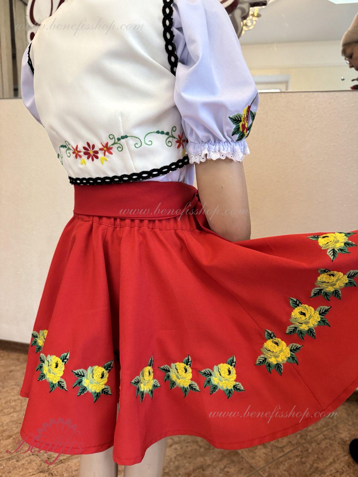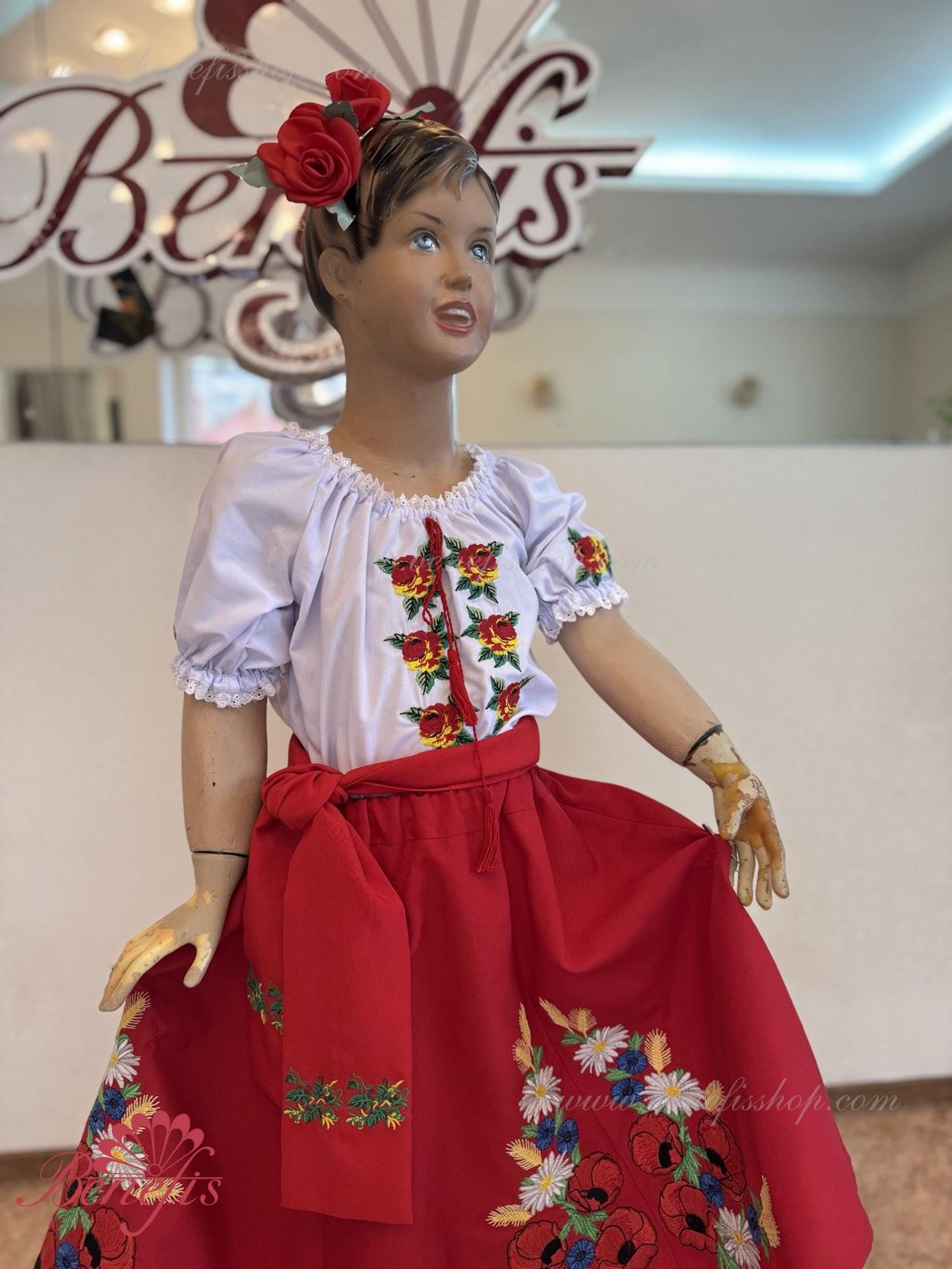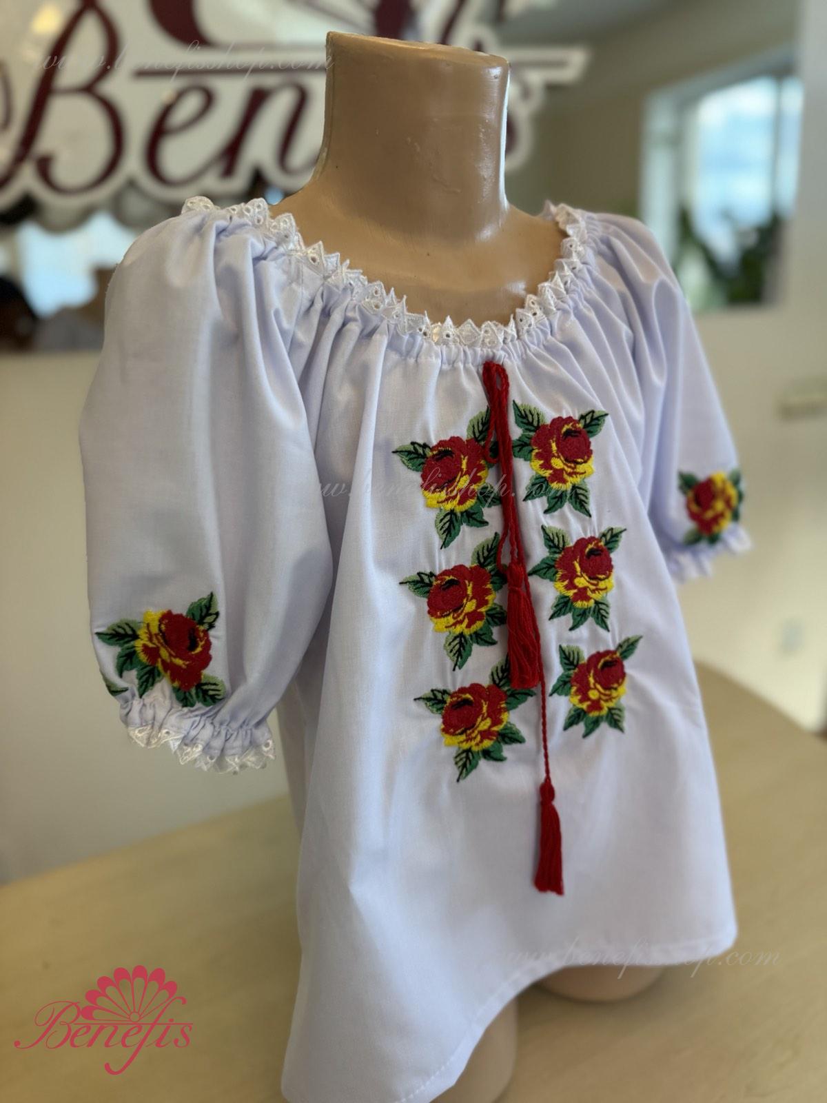 Блуза выполнена из сорочечной ткани. На горловине и рукавах вставлена резинка и от декорирована натуральным кружевом . Вышивка выполнена в национальном стиле на специальной машине. Юбка , пояс и жилетка не входит в цену. В дополнение к блузке вы можете заказать юбку J0123(4471),J0354(4811) пояс J0372(4940) и жилетку J0171(4525).