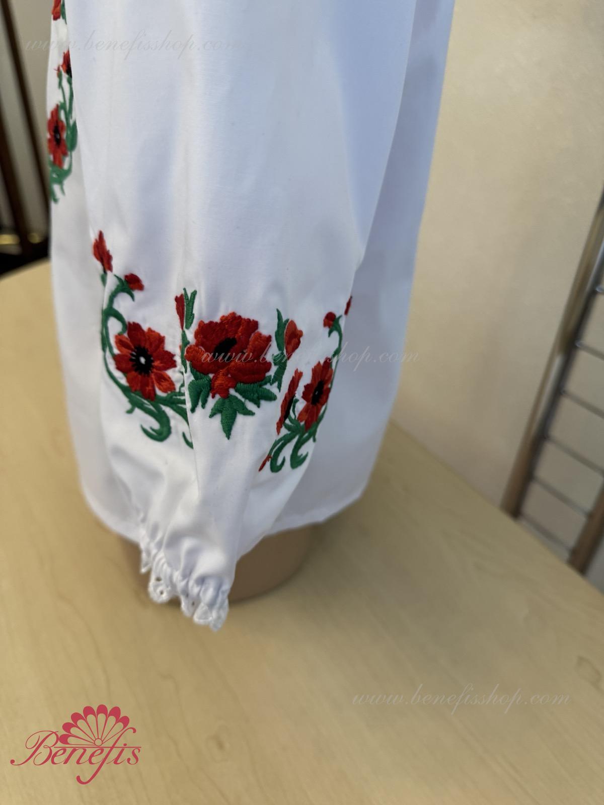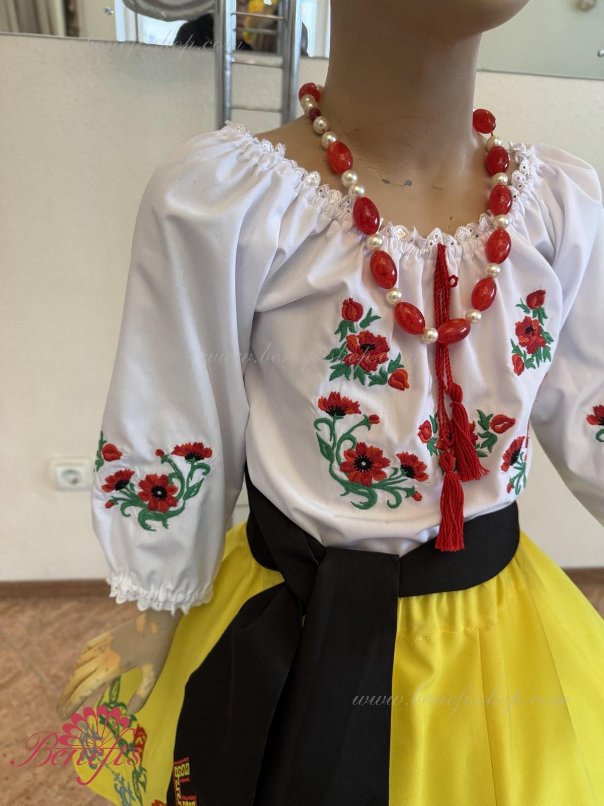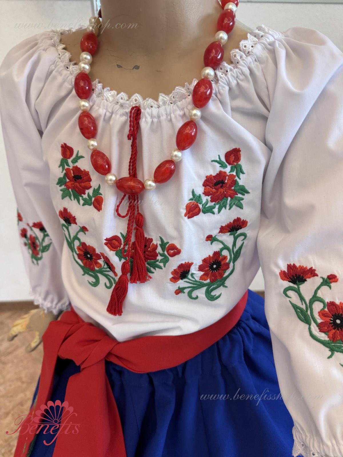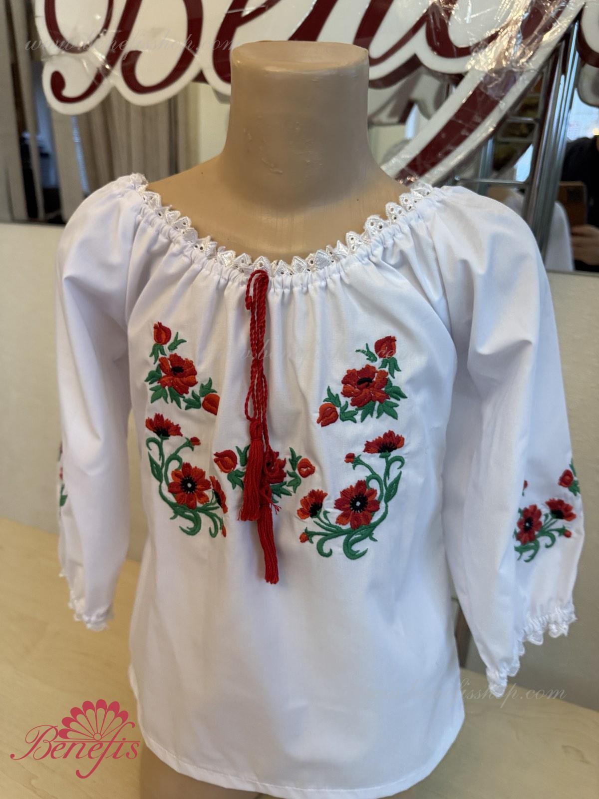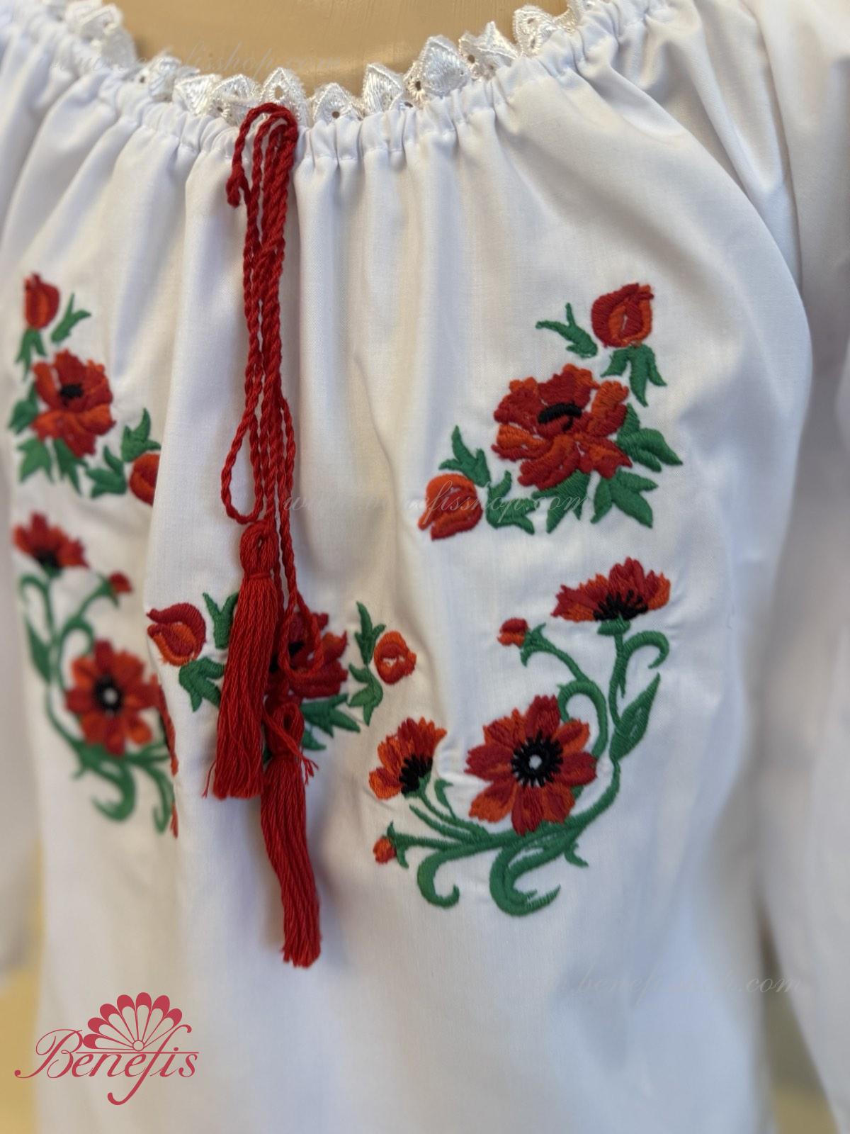 Блуза выполнена из сорочечной ткани. На горловине и рукавах вставлена резинка и от декорирована натуральным кружевом . Вышивка выполнена в национальном стиле на специальной машине. Юбки и пояса не входит в цену В дополнение к блузке вы можете заказать юбки J0354(4811),J0112(4473),J0113(4474) и пояса J0372(4940),J0360(4312).