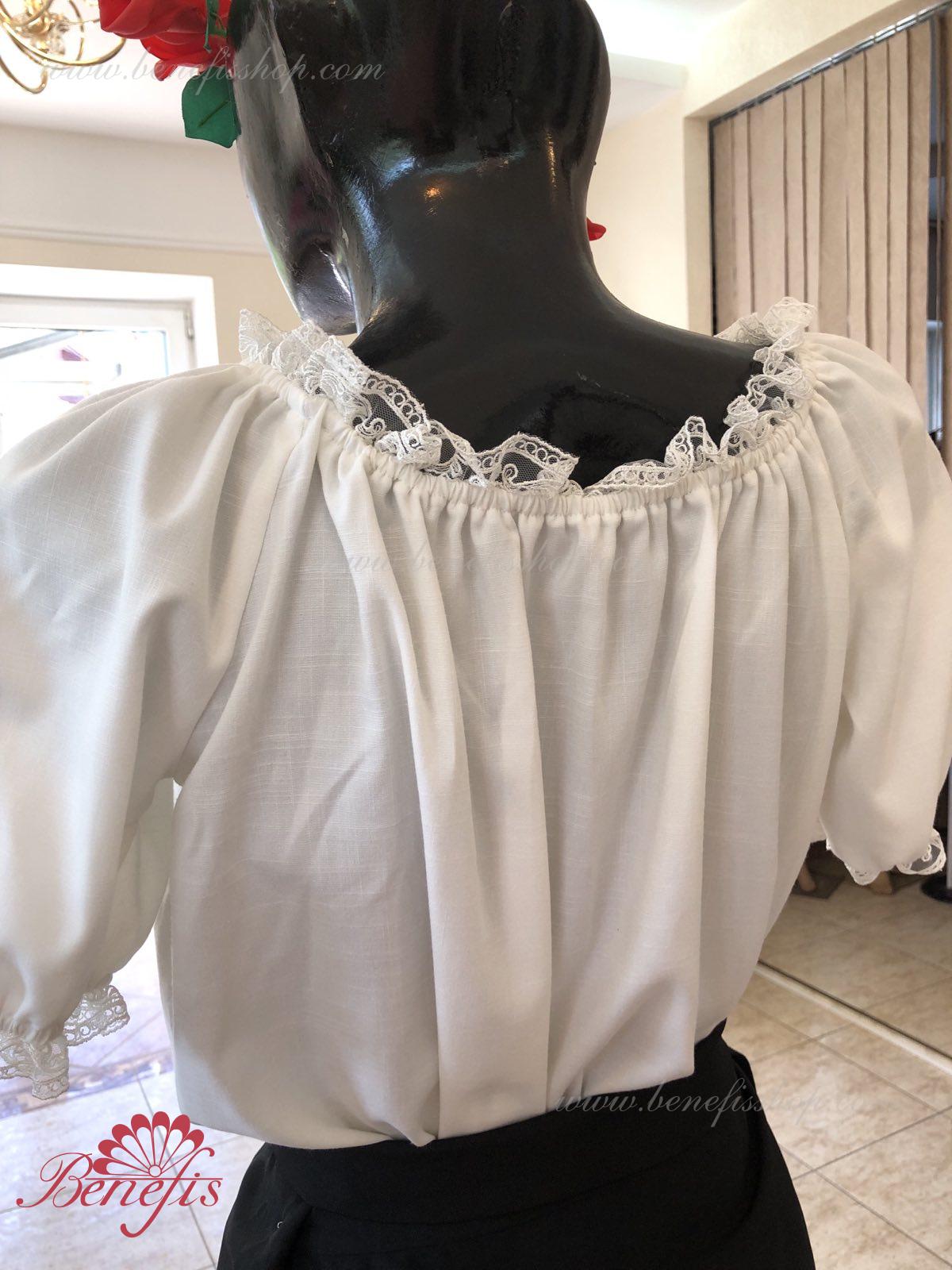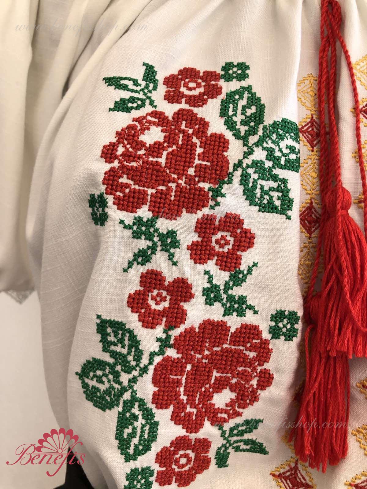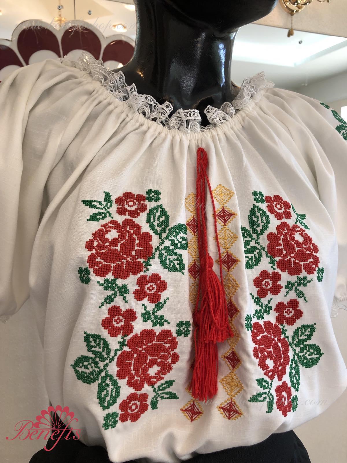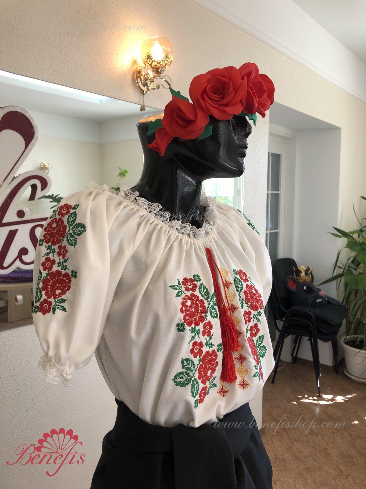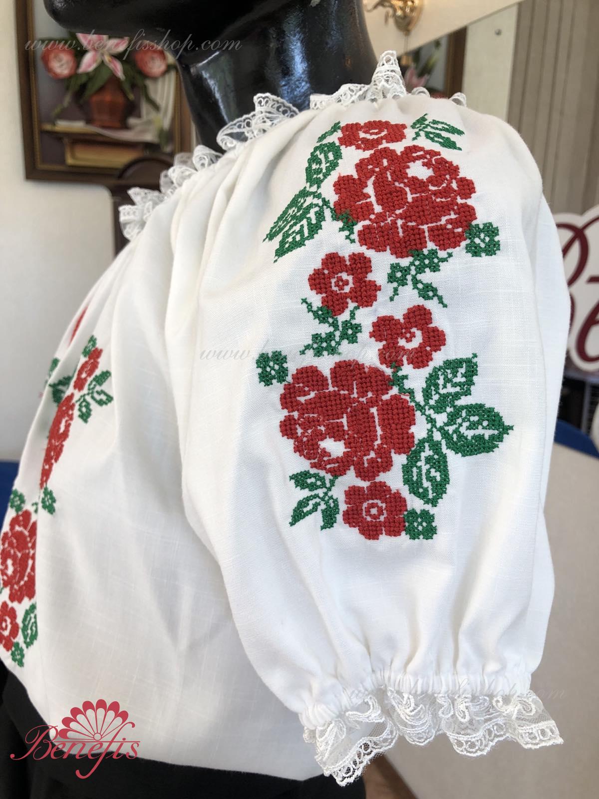 Блуза выполнена из сорочечной ткани. На горловине и рукавах вставлена резинка и от декорирована натуральным кружевом . Вышивка выполнена в национальном стиле на специальной машине.