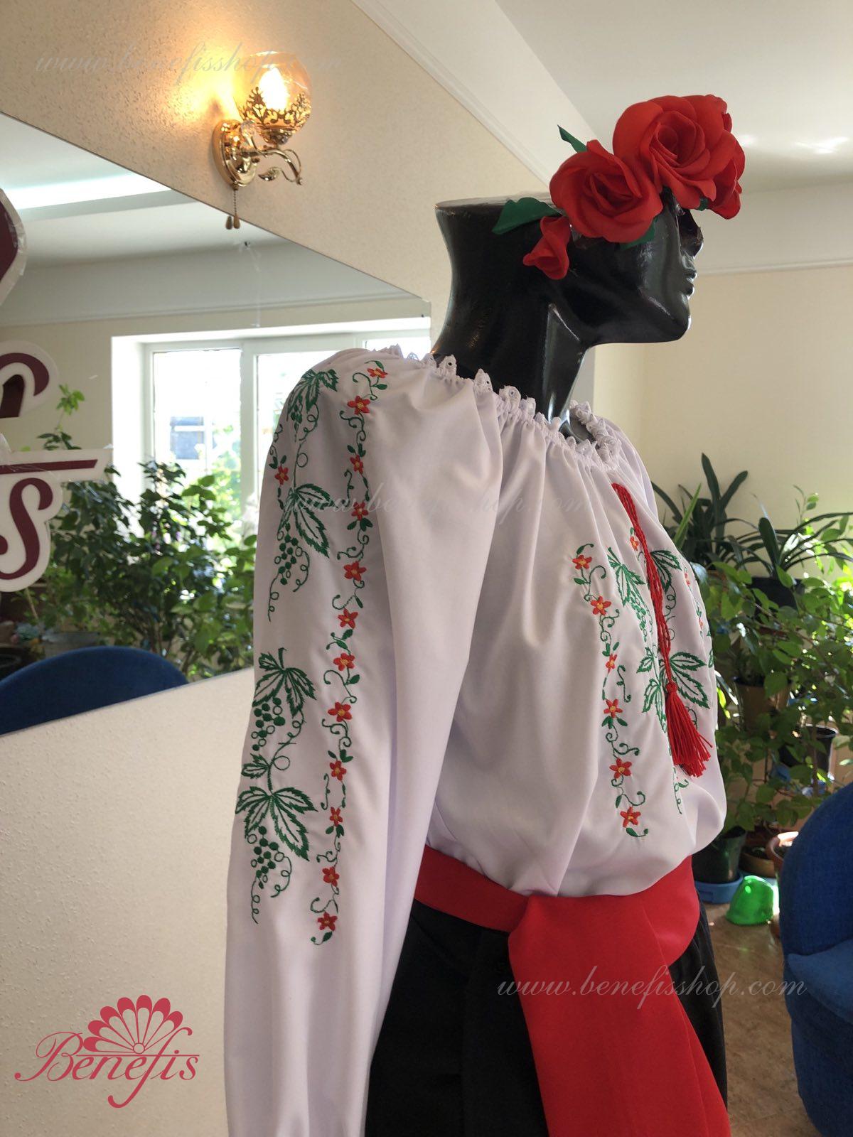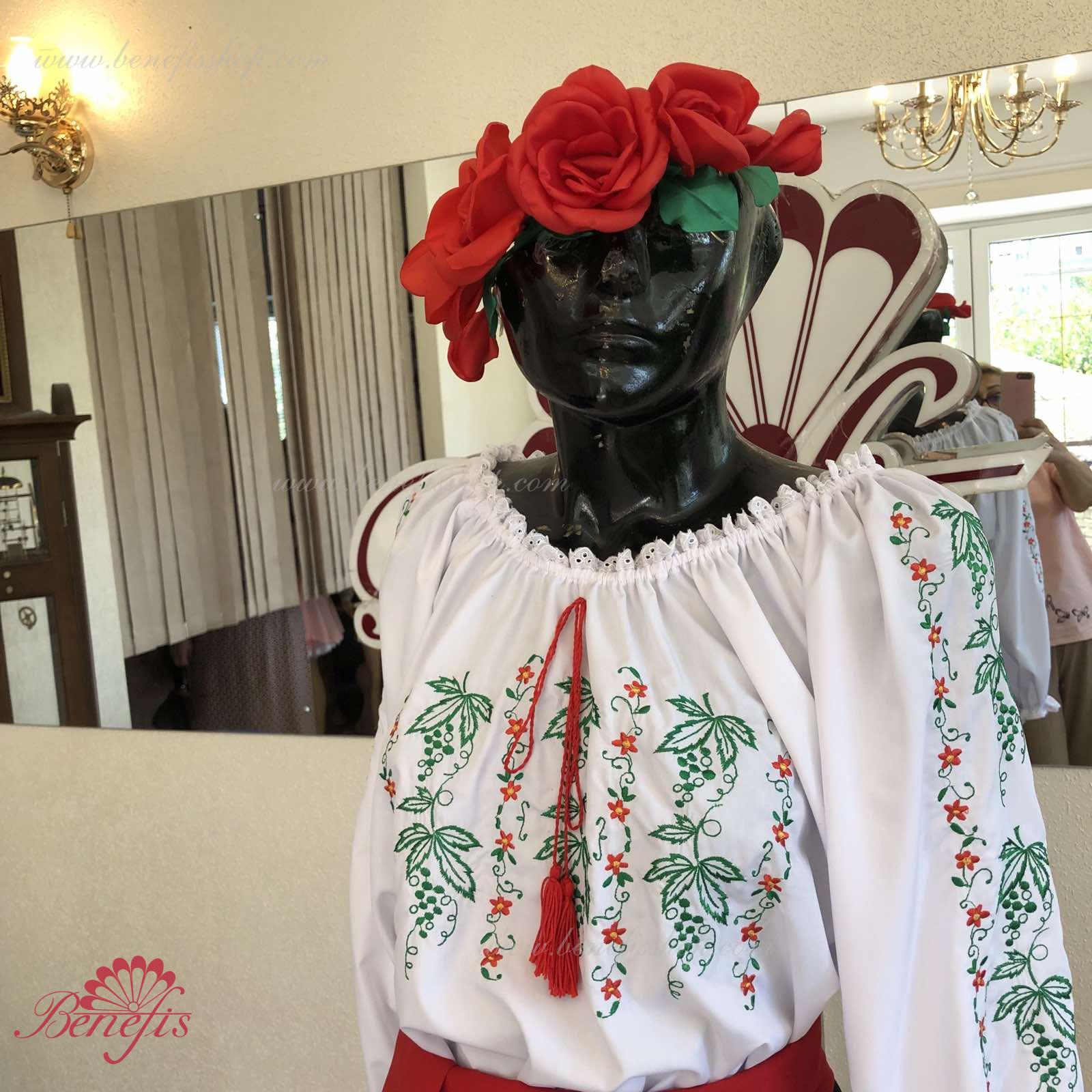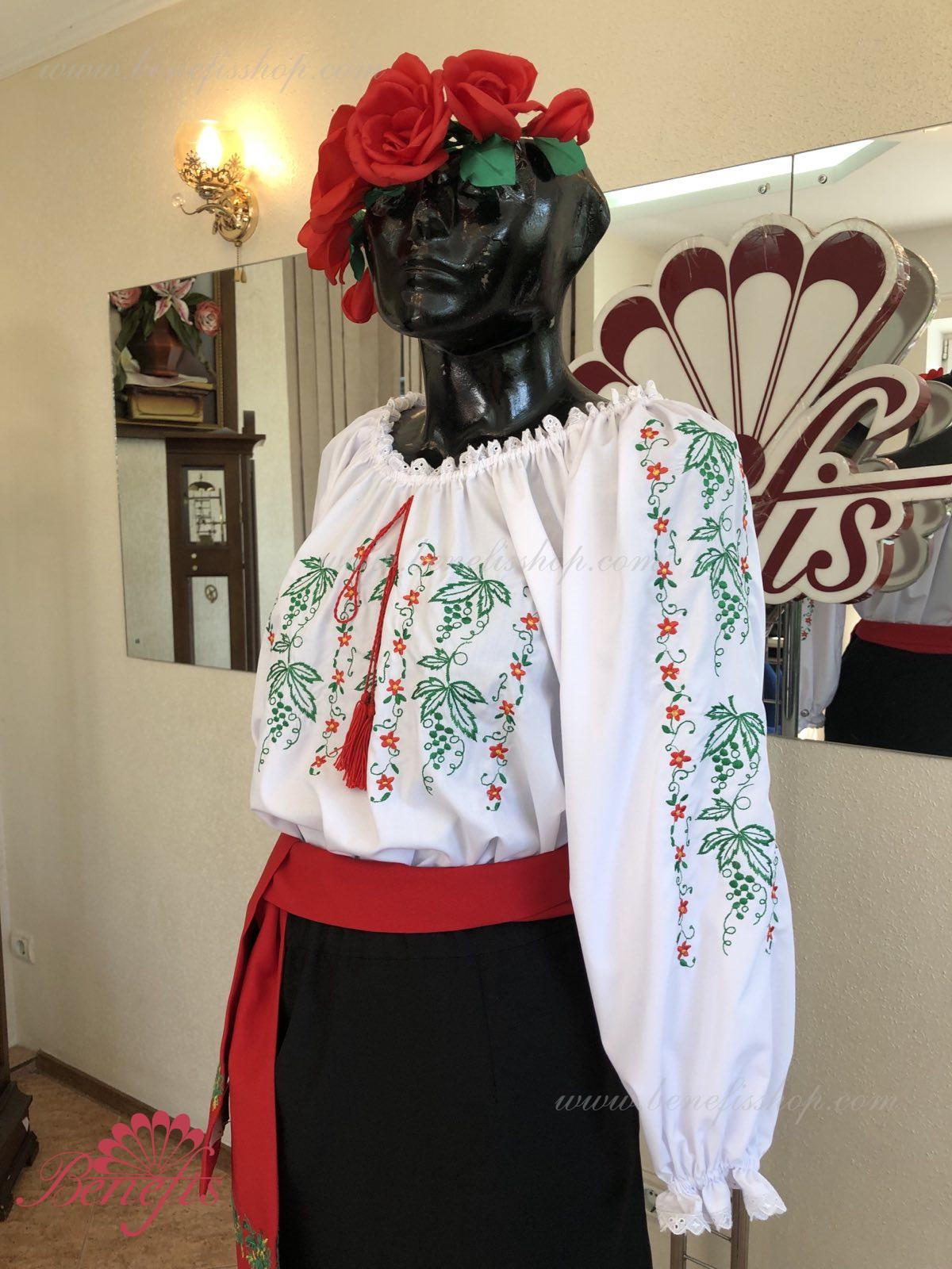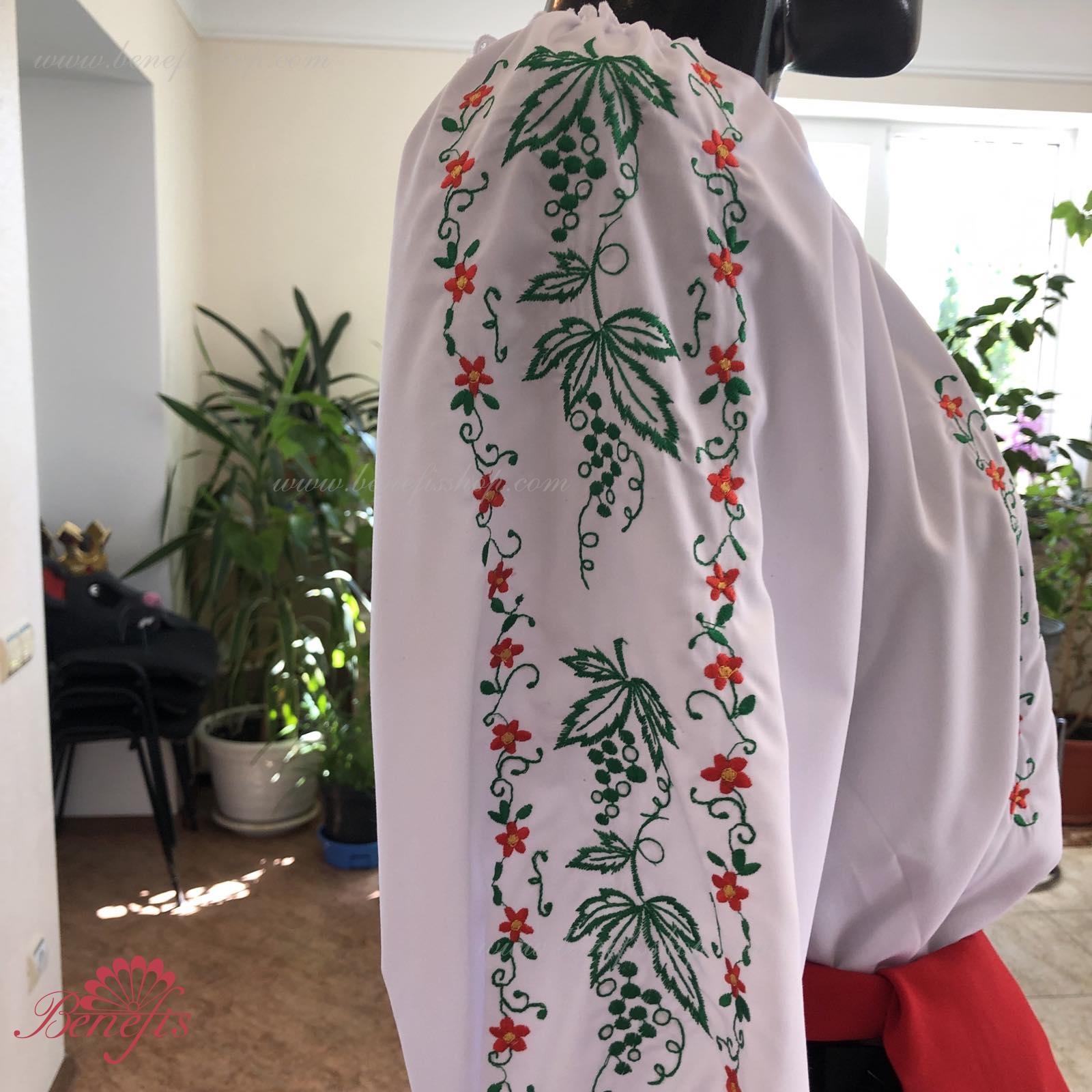 Блуза выполнена из сорочечной ткани. На горловине и рукавах вставлена резинка и от декорирована натуральным кружевом . Вышивка выполнена в национальном стиле на специальной машине.