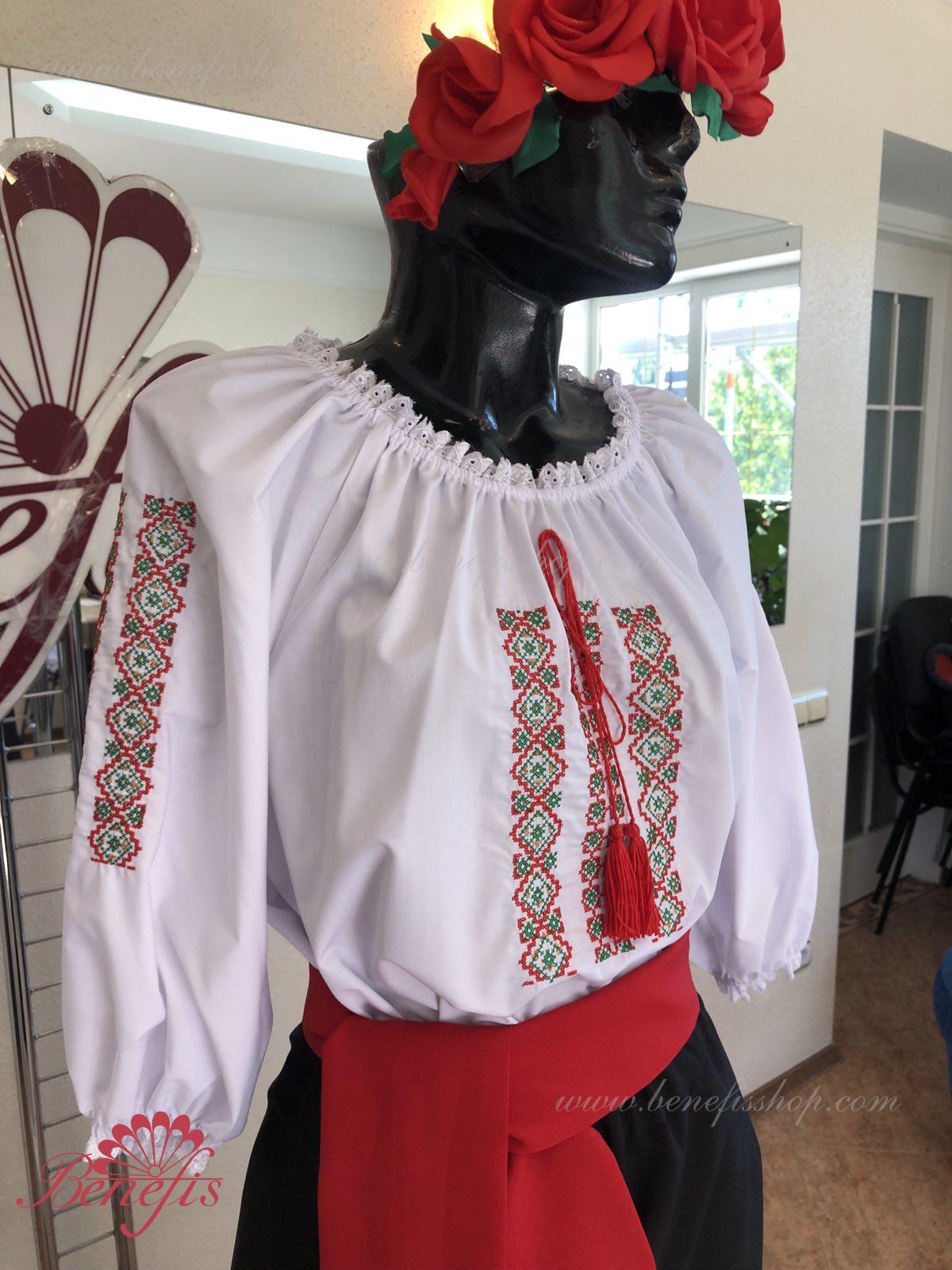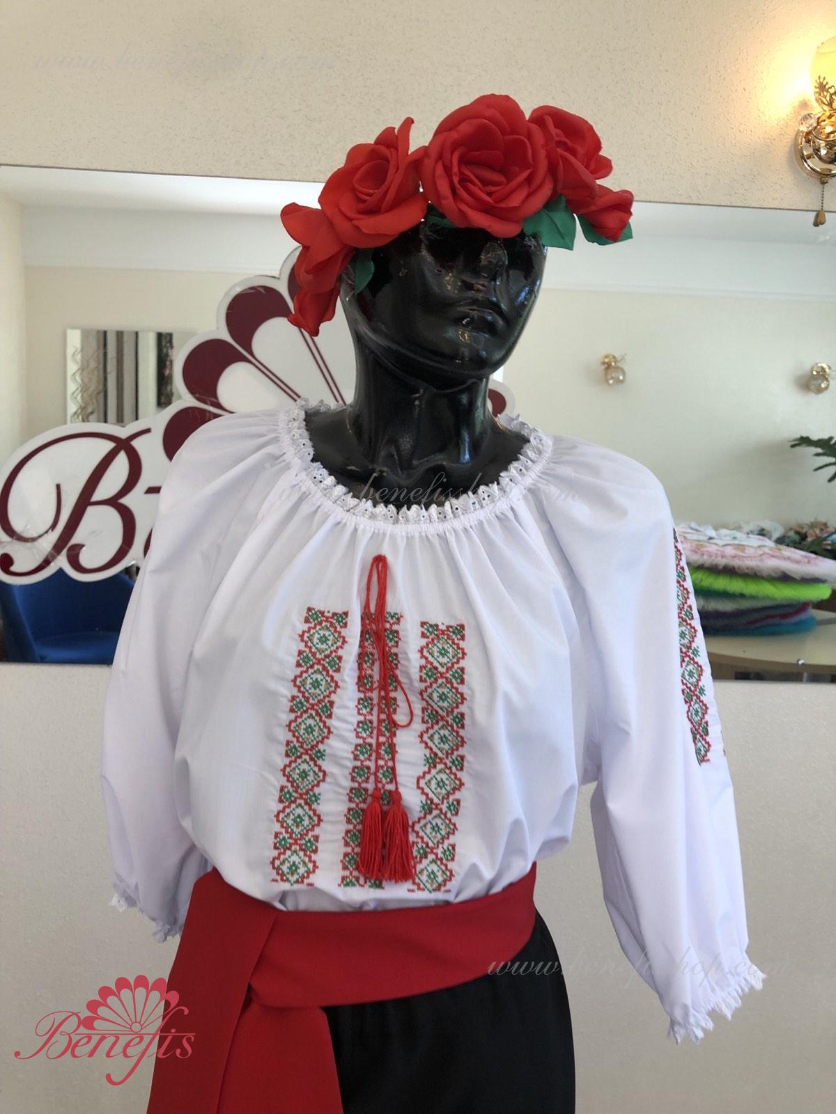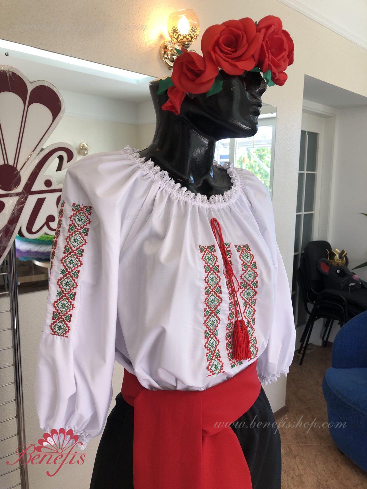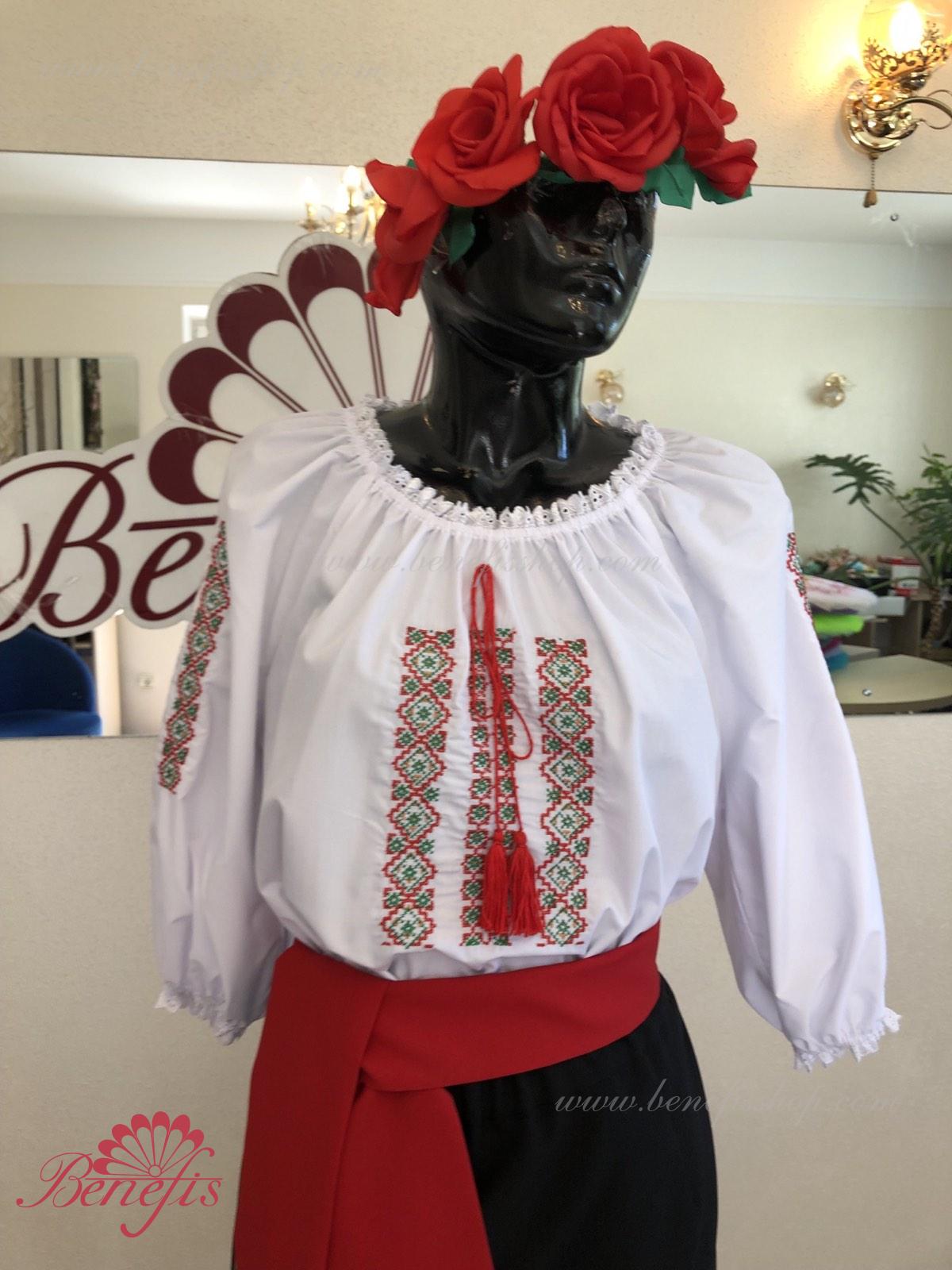 Блуза выполнена из сорочечной ткани. На горловине и рукавах вставлена резинка и от декорирована натуральным кружевом . Вышивка выполнена в национальном стиле на специальной машине.