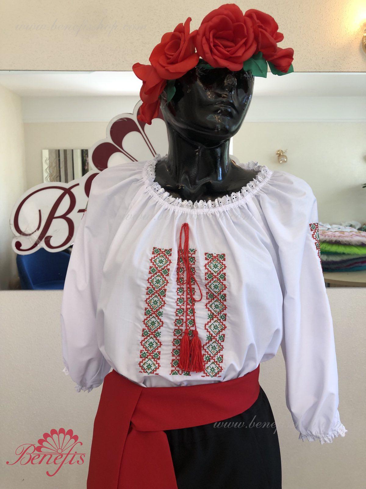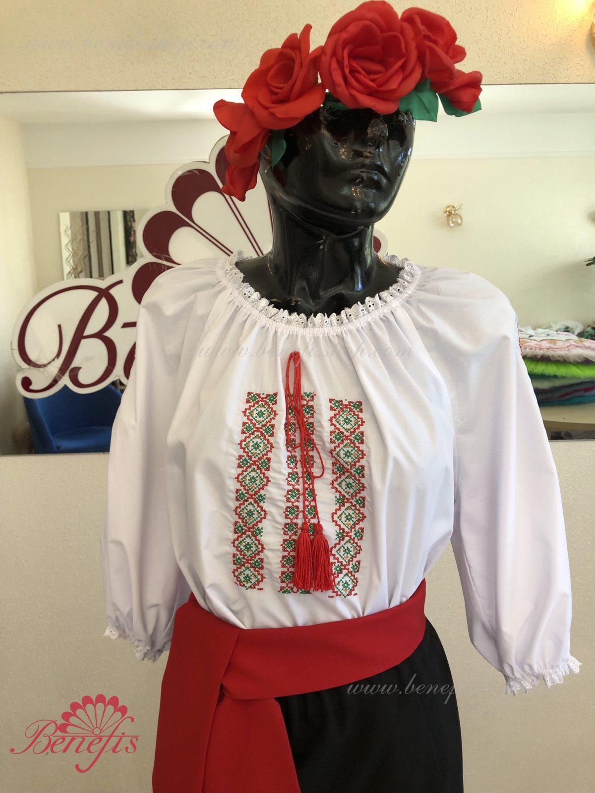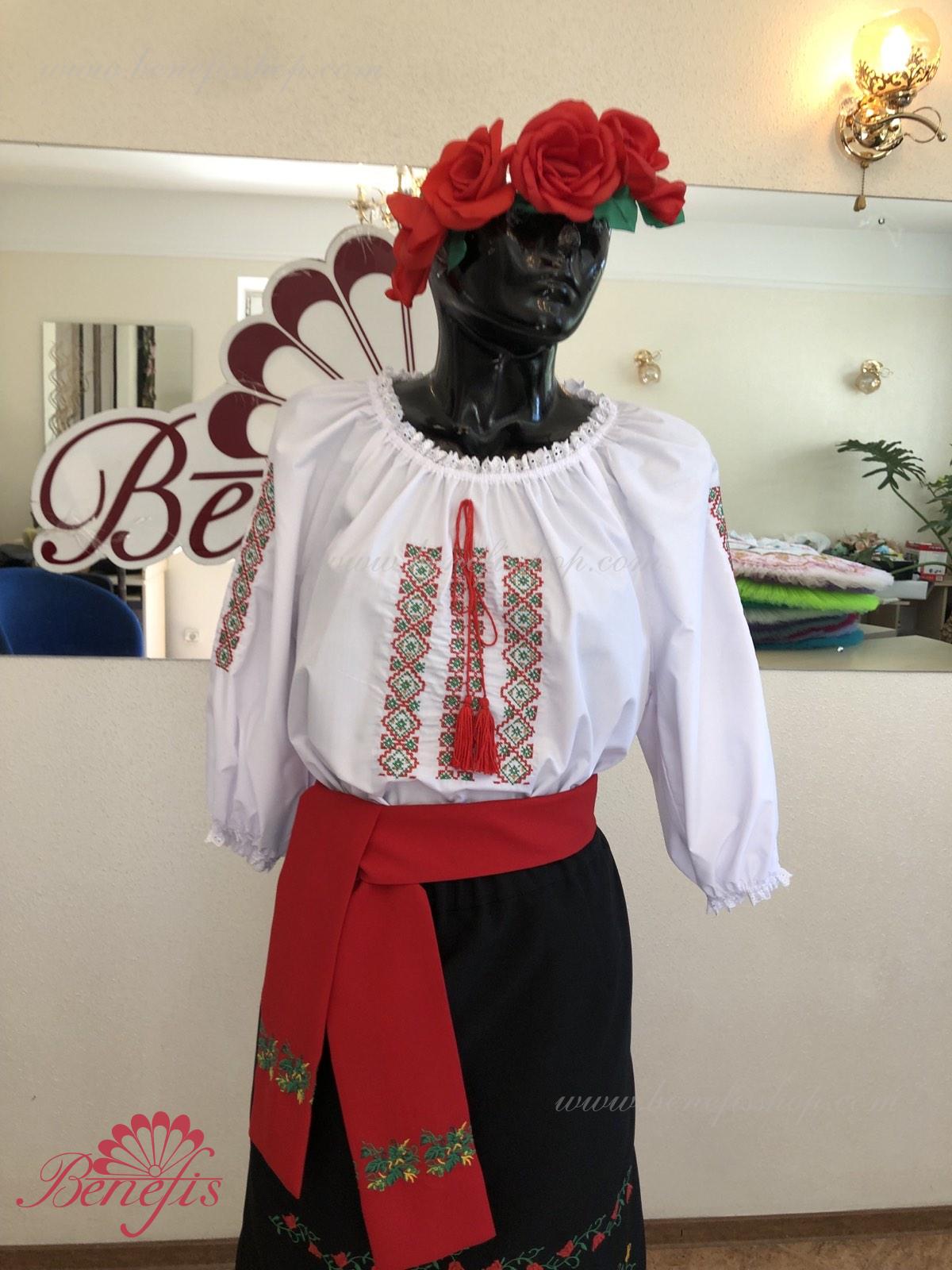 Блуза выполнена из сорочечной ткани. На горловине и рукавах вставлена резинка и от декорирована натуральным кружевом . Вышивка выполнена в национальном стиле на специальной машине.