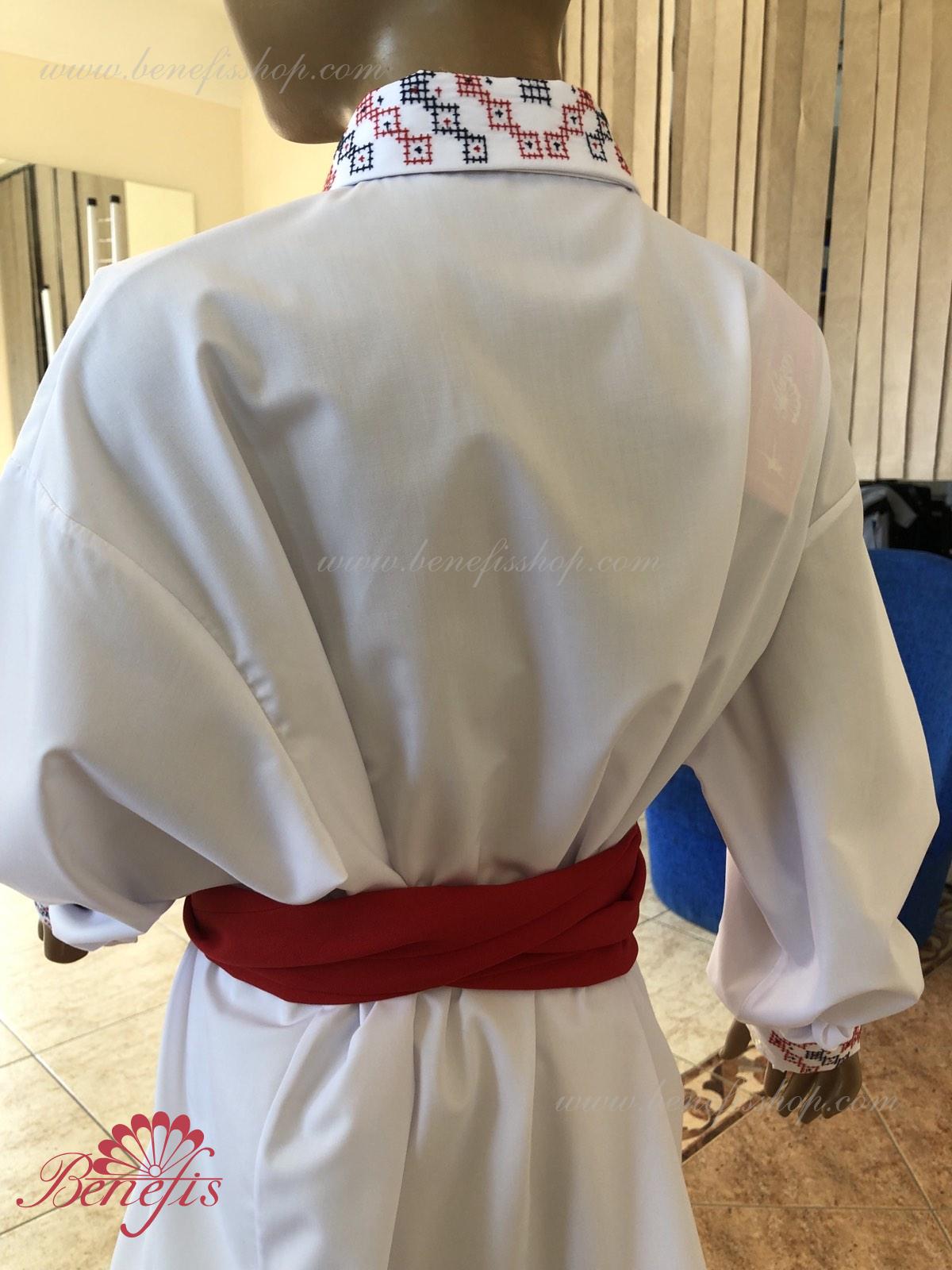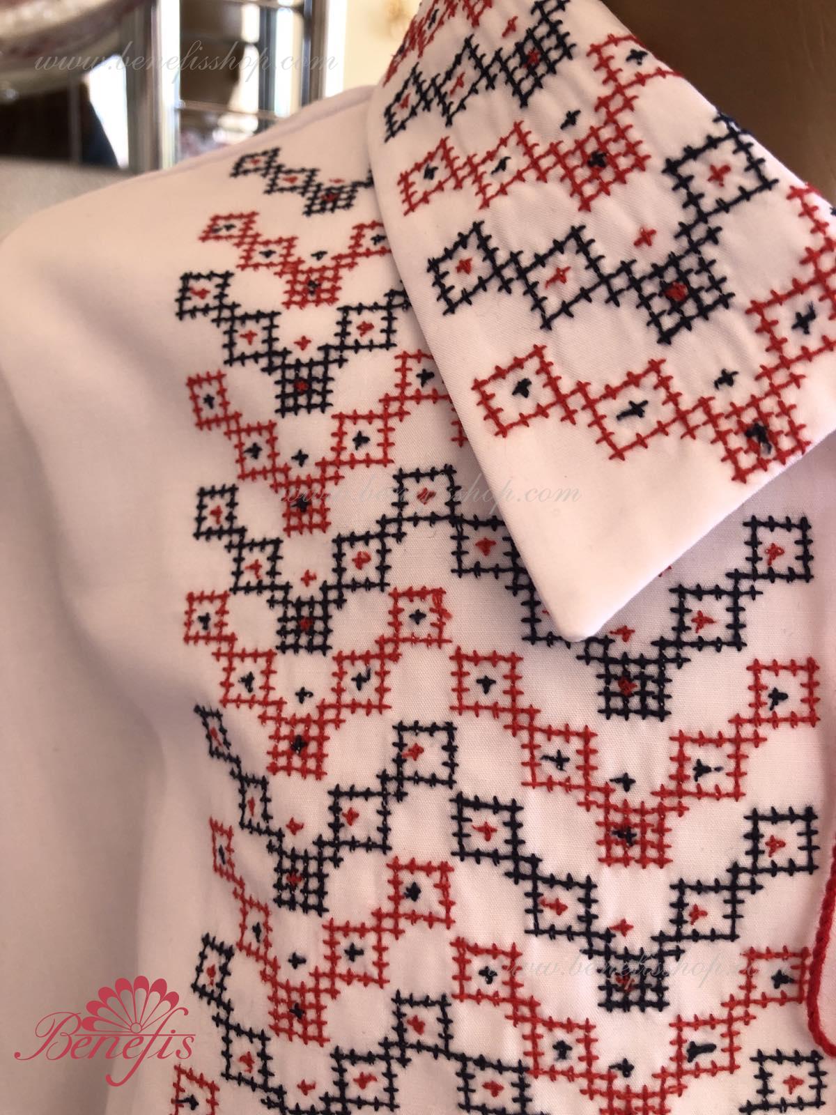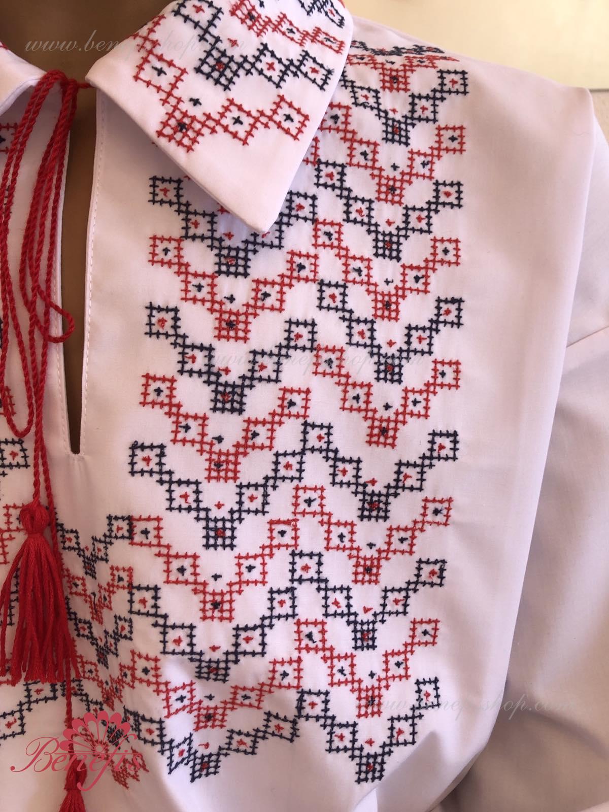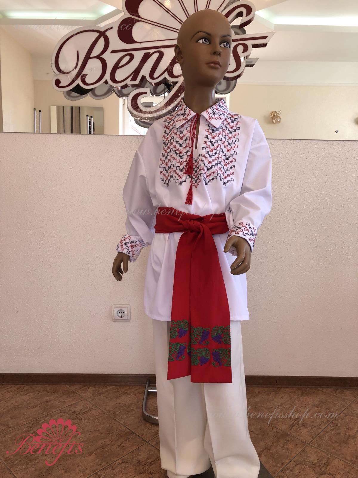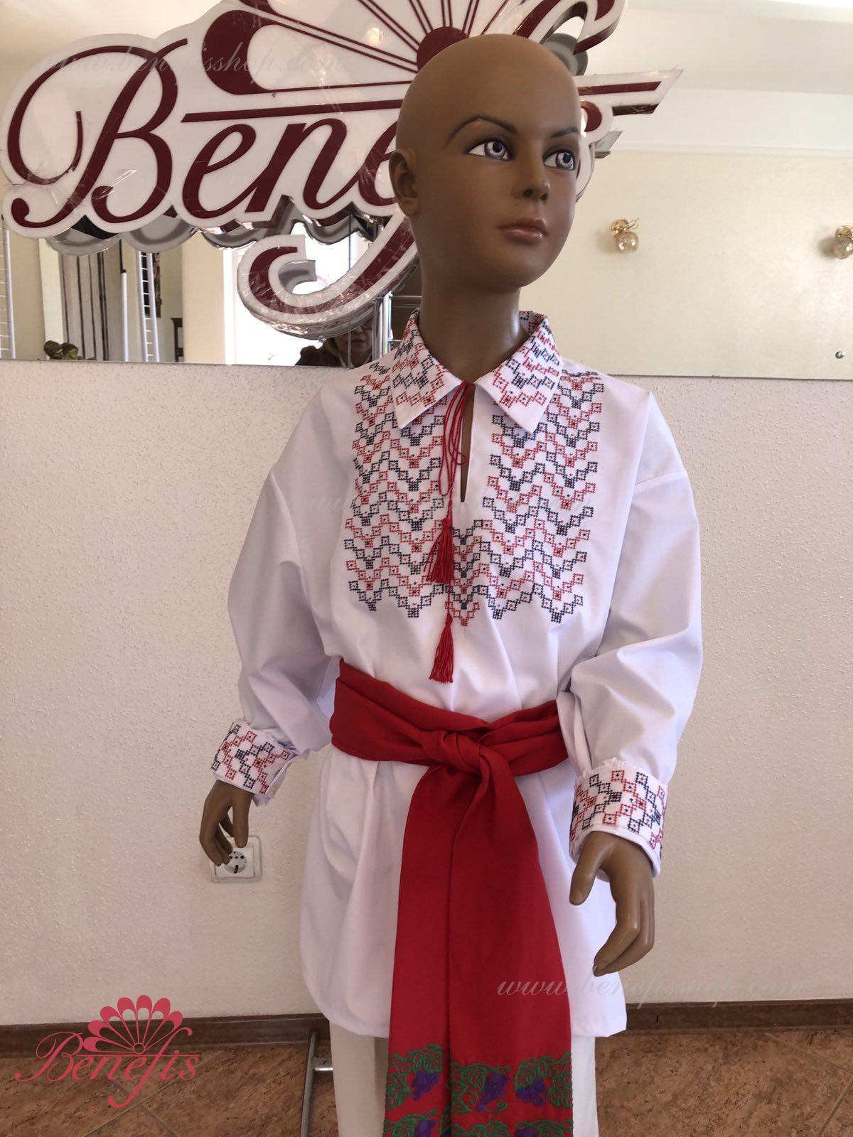 Детали: рубашка. Рубашка к национальному костюму для мальчика — это сорочка с длинным рукавом из сорочечной ткани. Воротник, низ и рукава сорочки декорированная нитками с национальными мотивами. Вышивка выполнена на специальной машине.