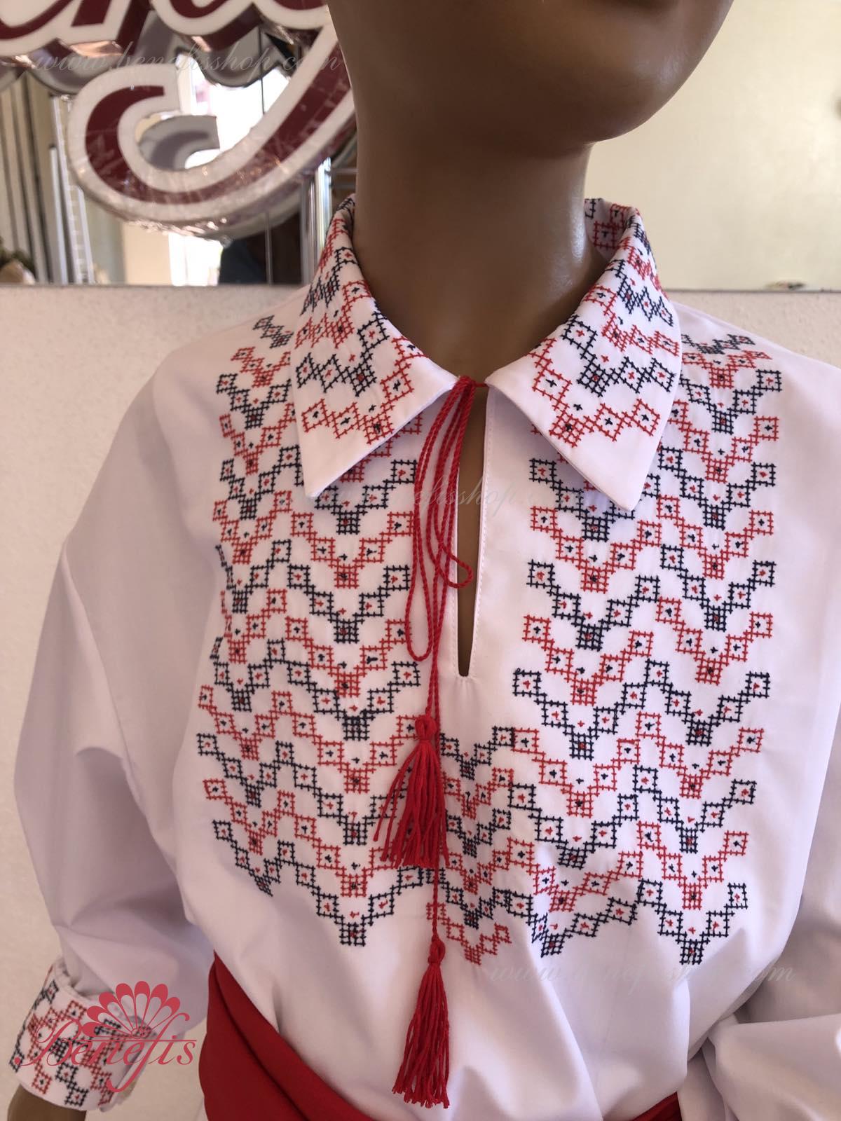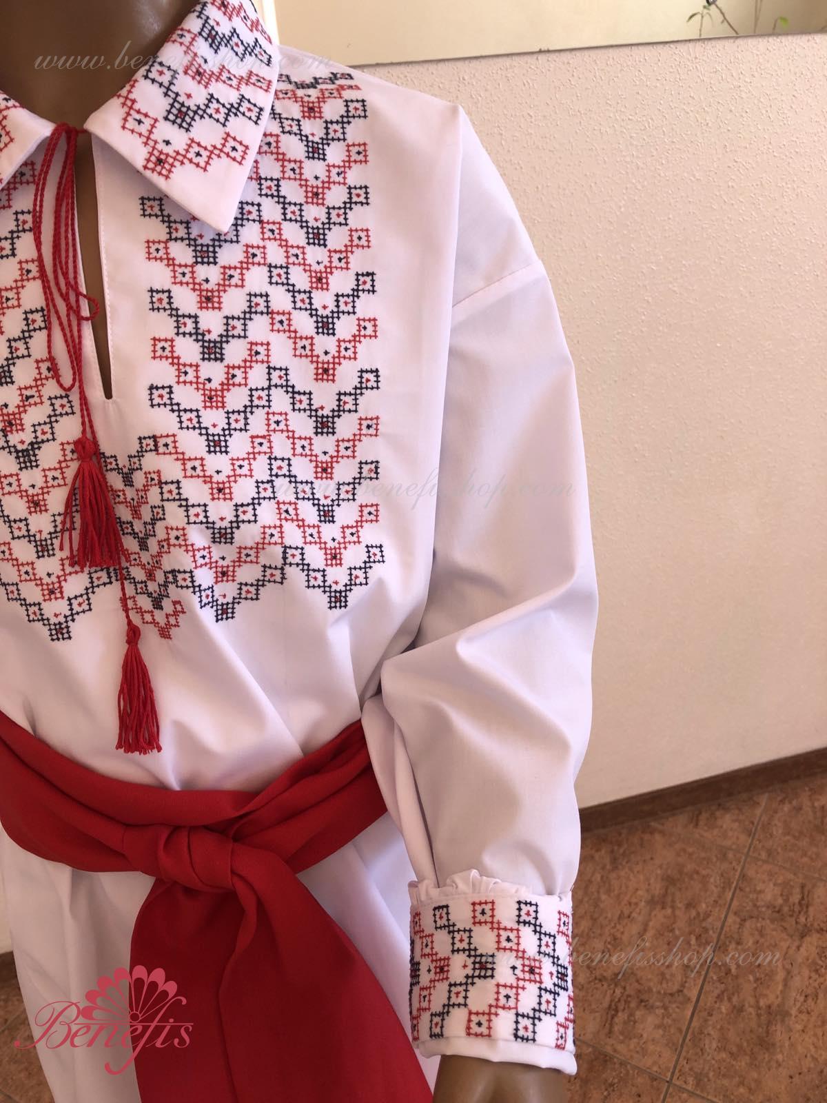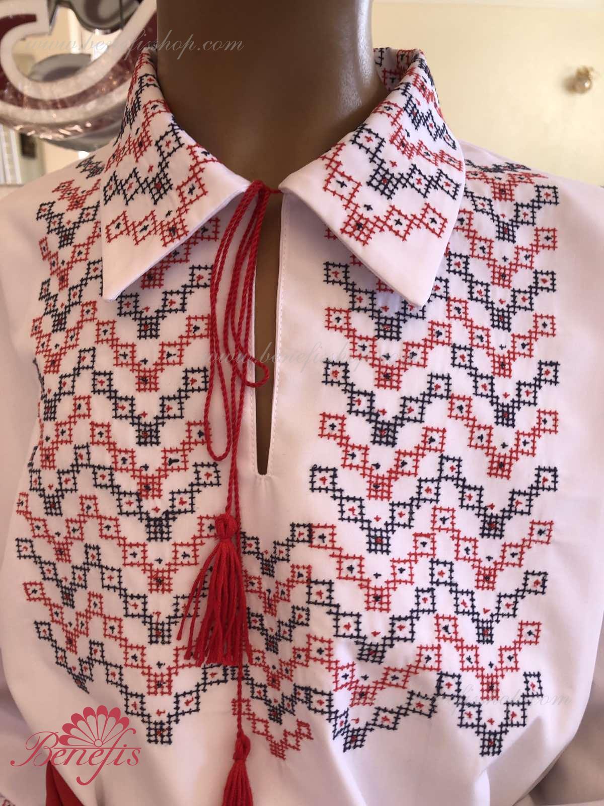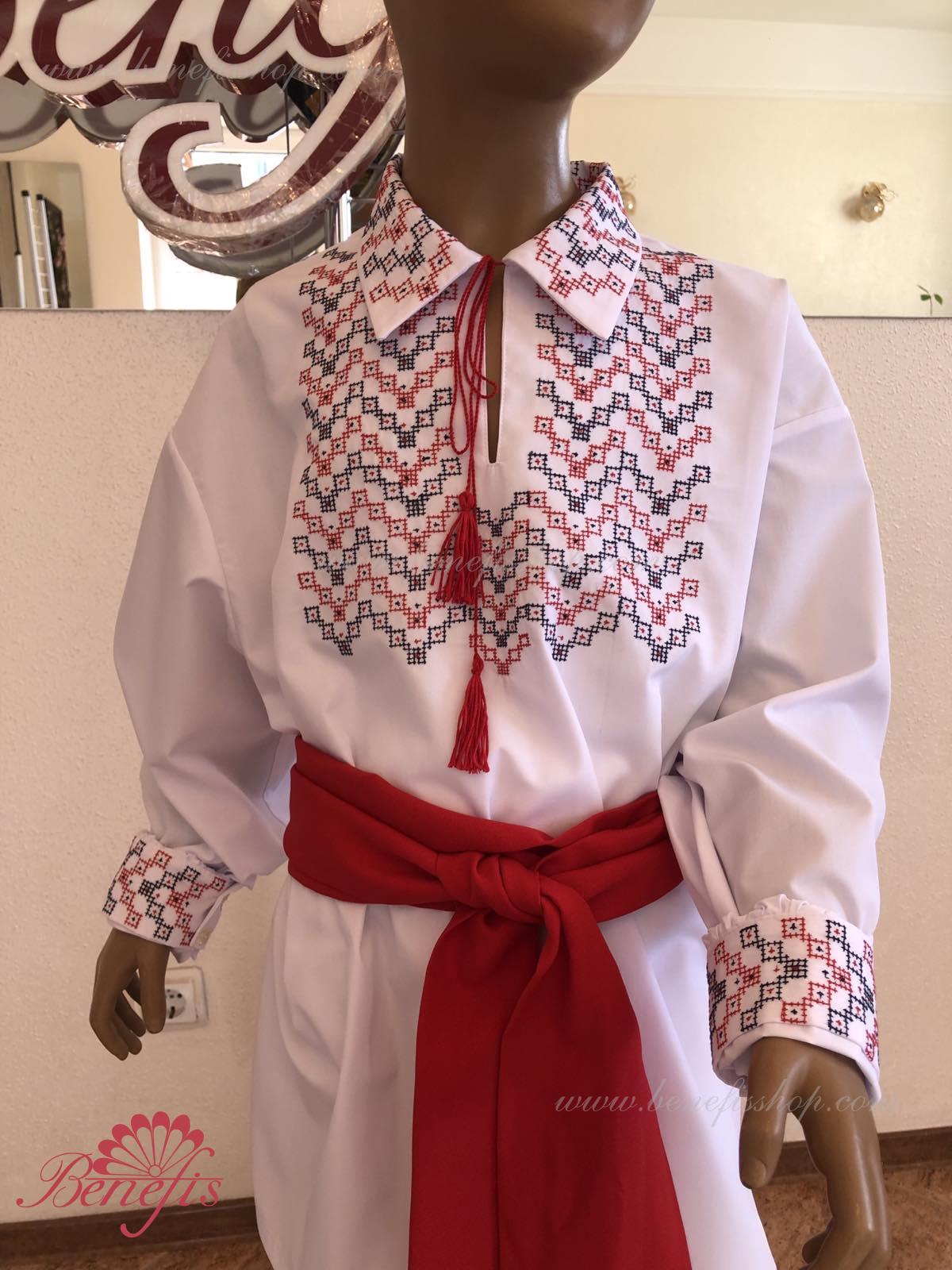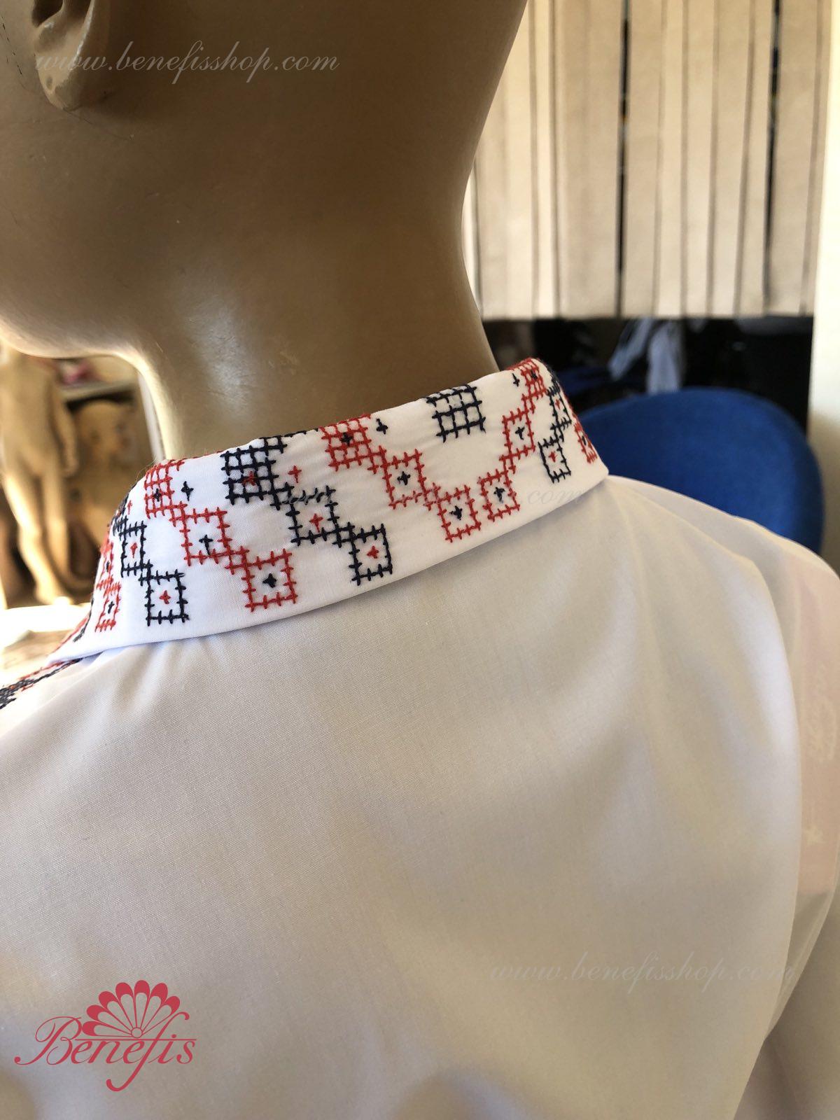 Детали: рубашка. Рубашка к национальному костюму для мальчика — это сорочка с длинным рукавом из сорочечной ткани. Воротник, низ и рукава сорочки декорированная нитками с национальными мотивами. Вышивка выполнена на специальной машине.