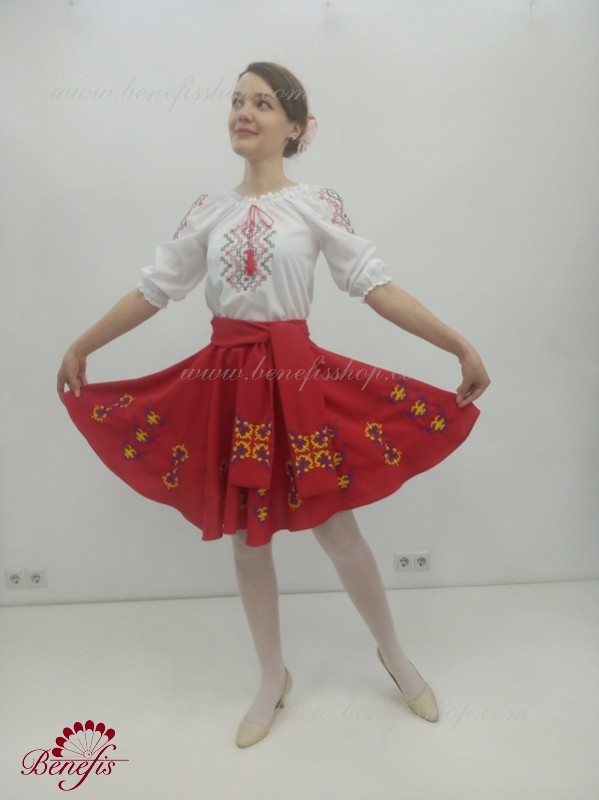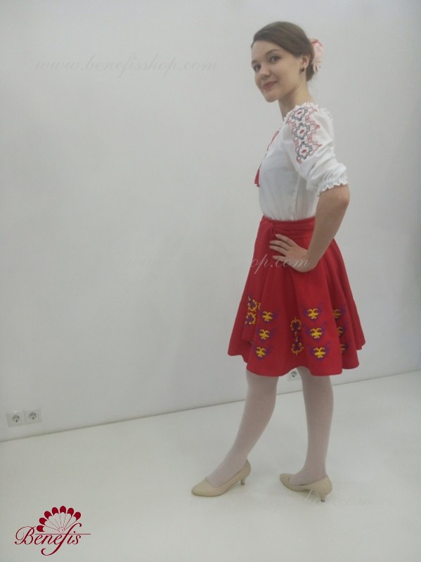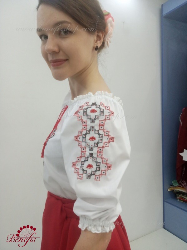 Блуза выполнена из сорочечной ткани. На горловине вставлена резинка и от декорирована натуральным кружевом. Вышивка выполнена в национальном стиле на специальной машине.