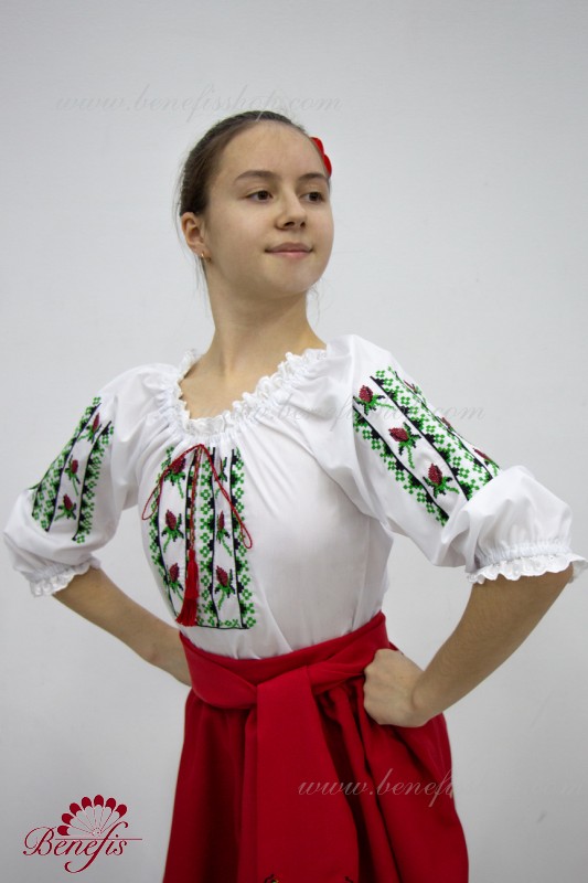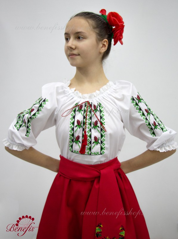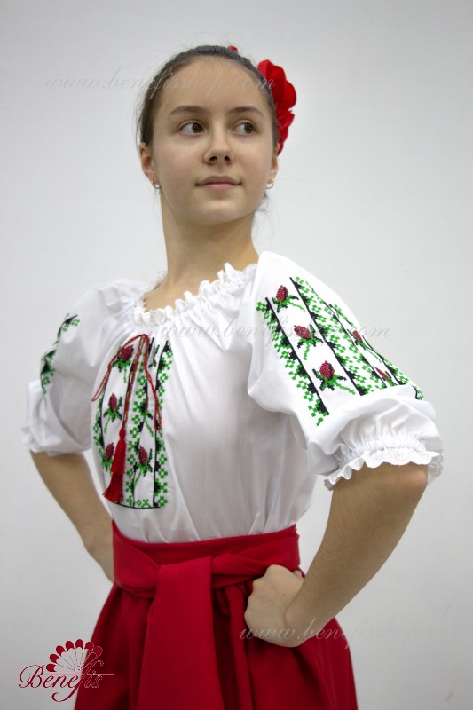 Блуза выполнена из сорочечной ткани. На горловине и рукавах вставлена резинка и от декорирована натуральным кружевом . Вышивка выполнена в национальном стиле на специальной машине.