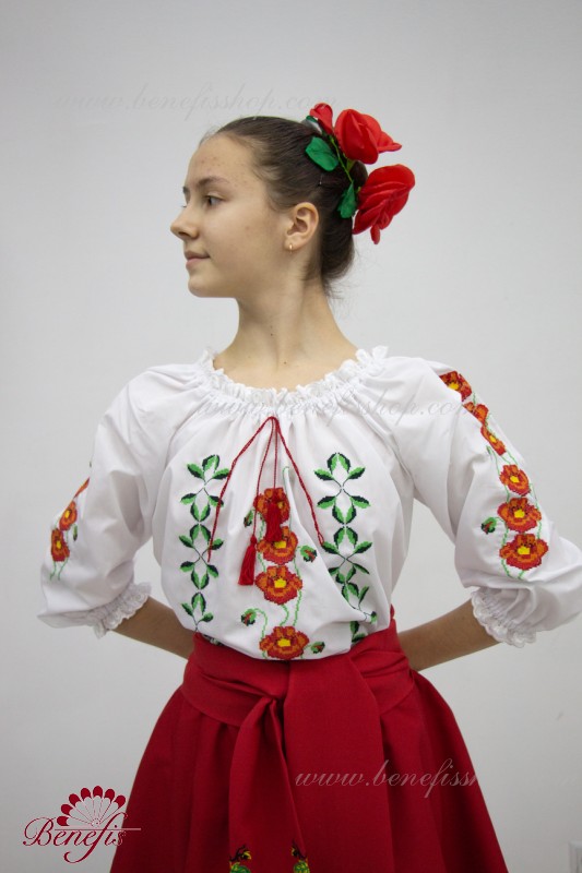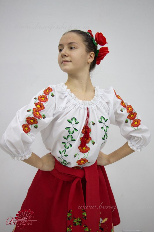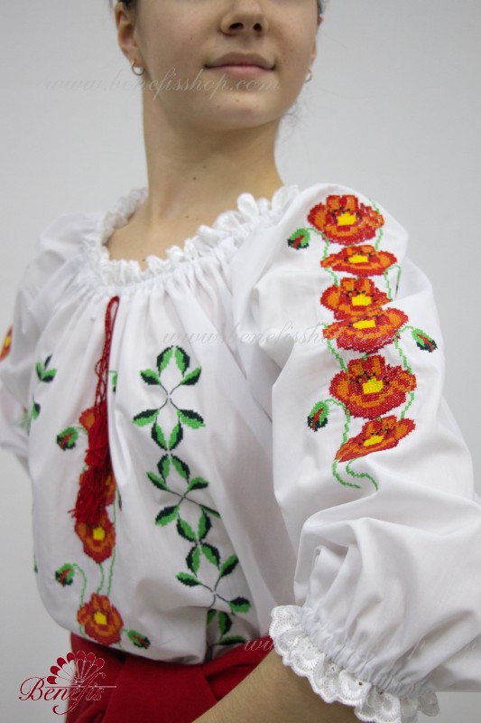 Блуза выполнена из сорочечной ткани. На горловине и рукавах вставлена резинка и от декорирована натуральным кружевом . Вышивка выполнена в национальном стиле на специальной машине.