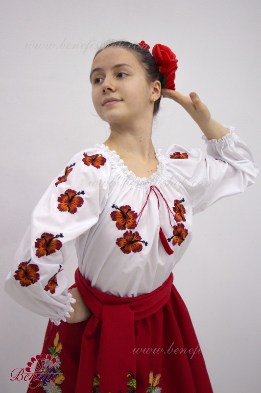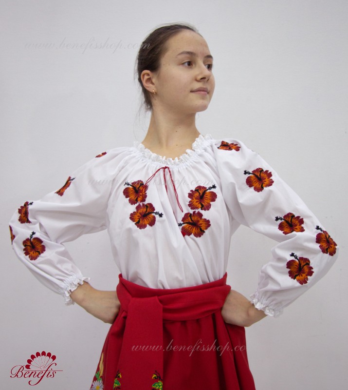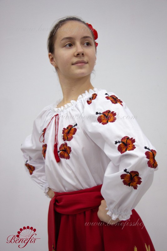 Блуза выполнена из сорочечной ткани. На горловине и рукавах вставлена резинка и от декорирована натуральным кружевом . Вышивка выполнена в национальном стиле на специальной машине.