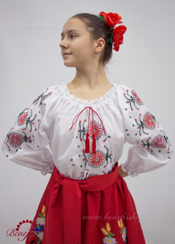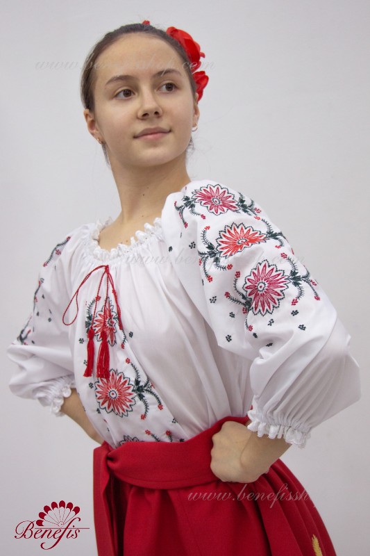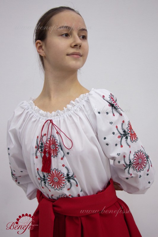 Блуза выполнена из сорочечной ткани. На горловине и рукавах вставлена резинка и от декорирована натуральным кружевом . Вышивка выполнена в национальном стиле на специальной машине.