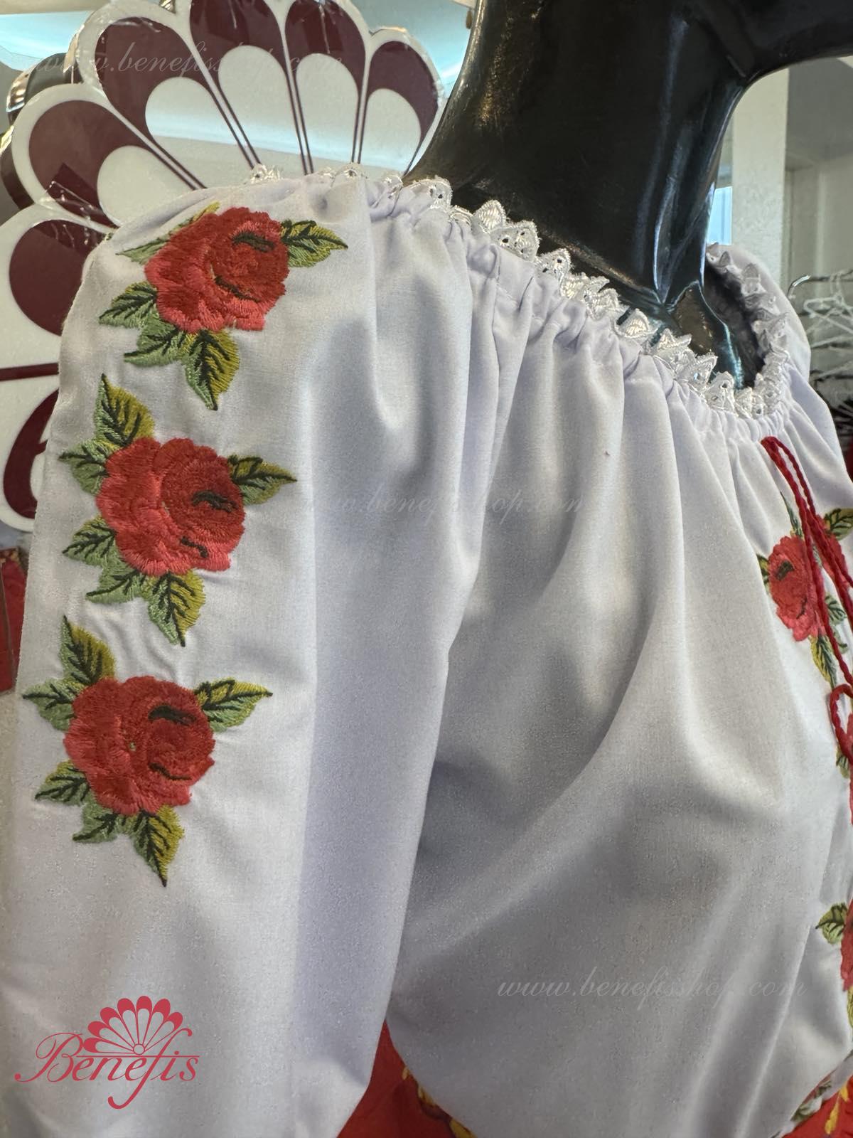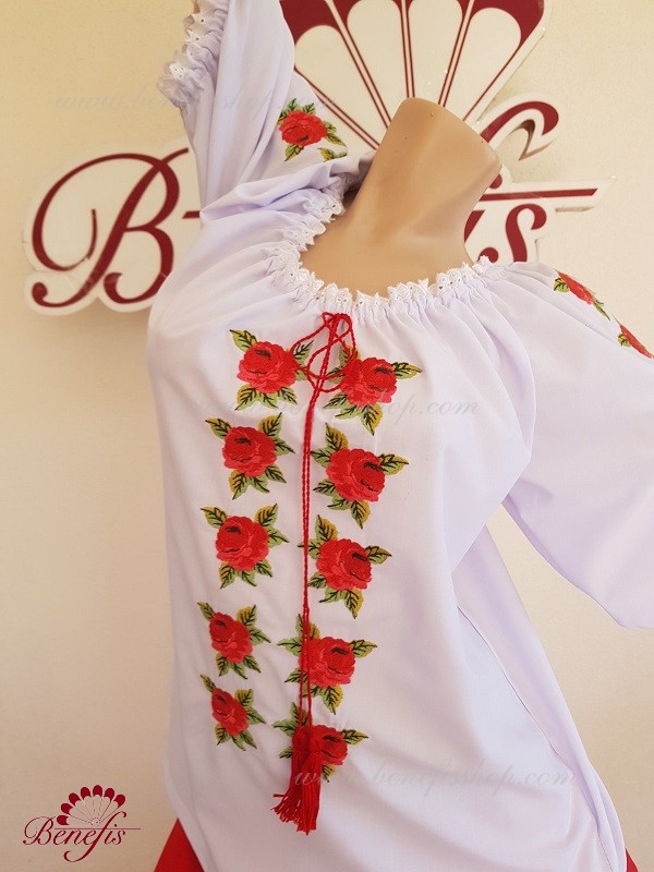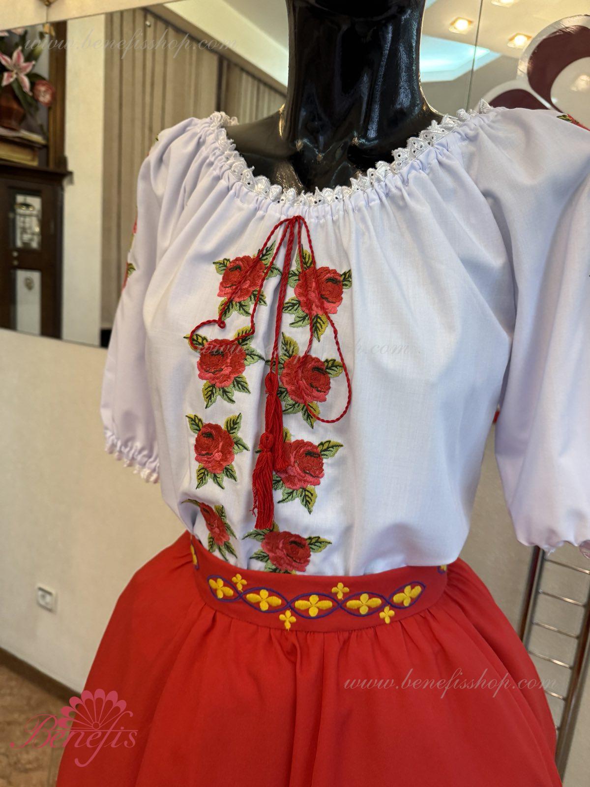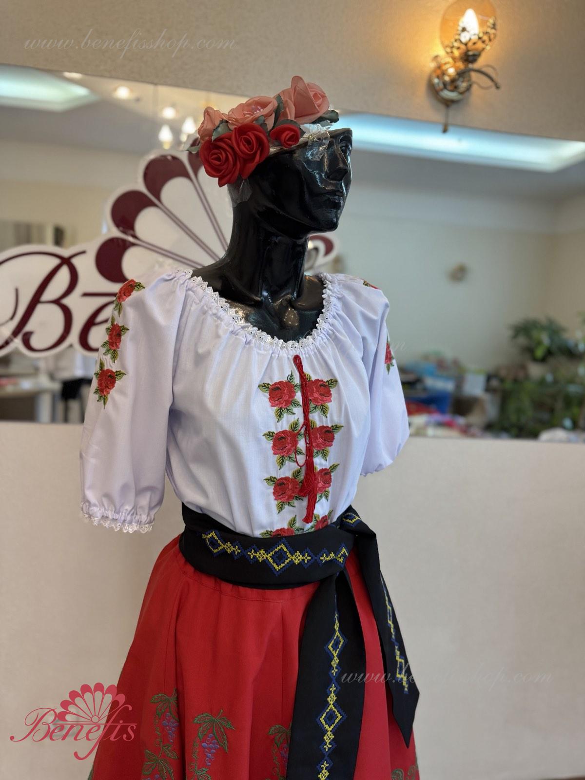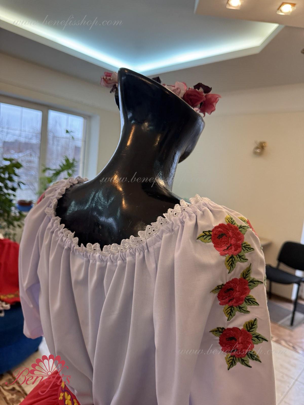 Блуза выполнена из сорочечной ткани. На горловине и рукавах вставлена резинка и от декорирована натуральным кружевом . Вышивка выполнена в национальном стиле на специальной машине. Юбка и пояс не входит в цену. В дополнение к блузке вы можете заказать юбку J0363,J0126 и пояс J0343 .