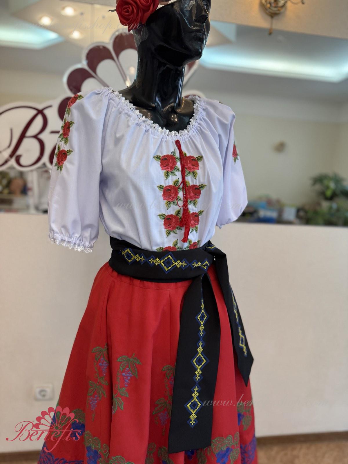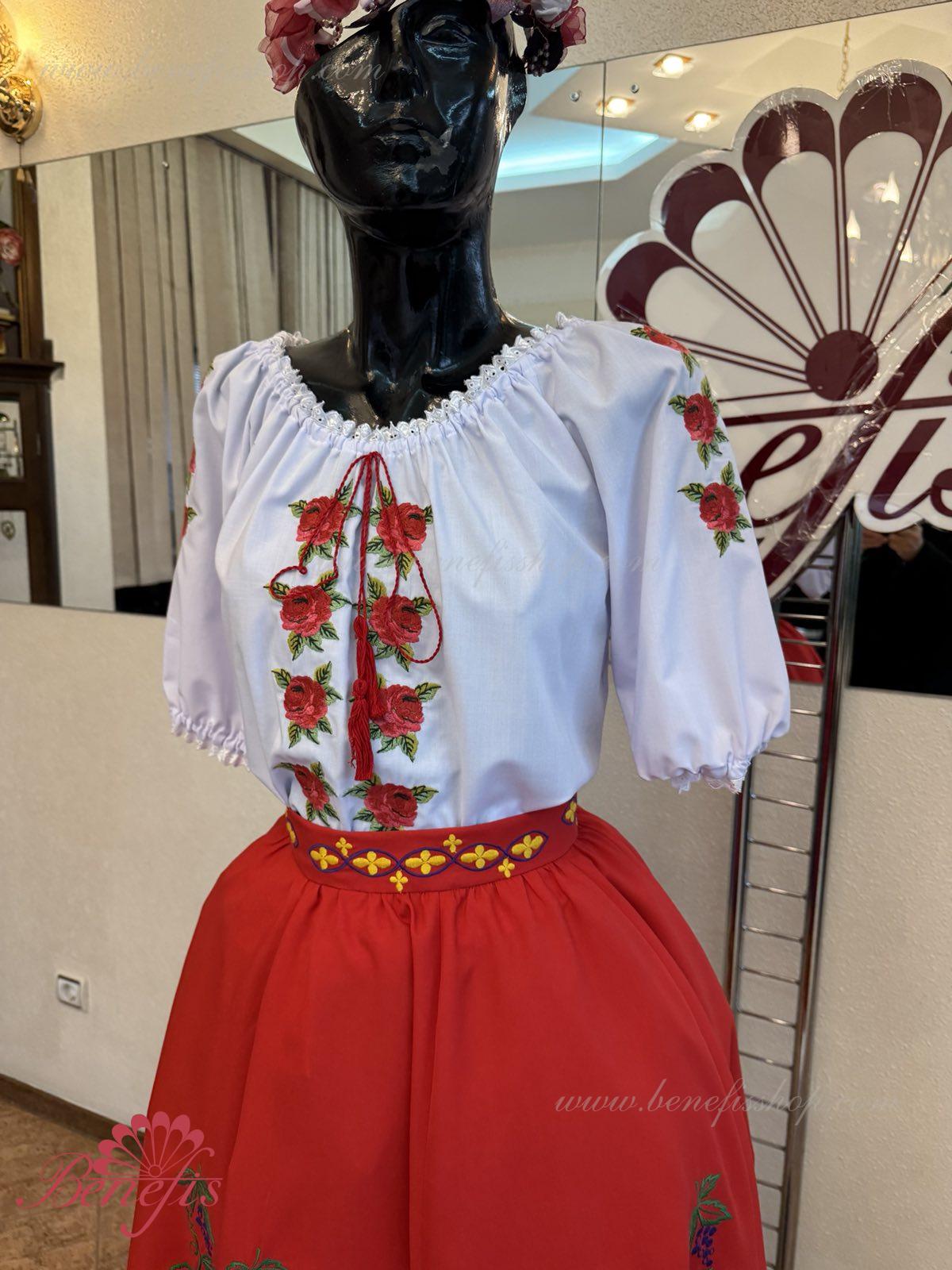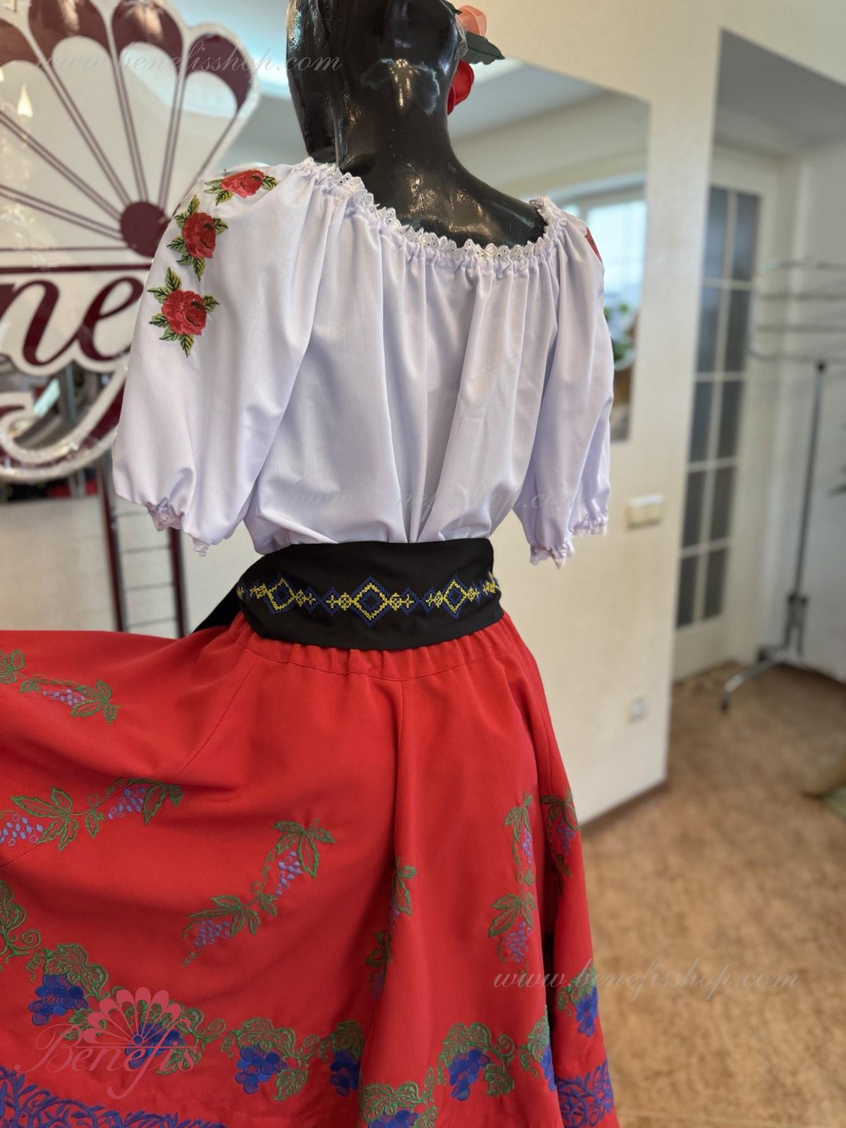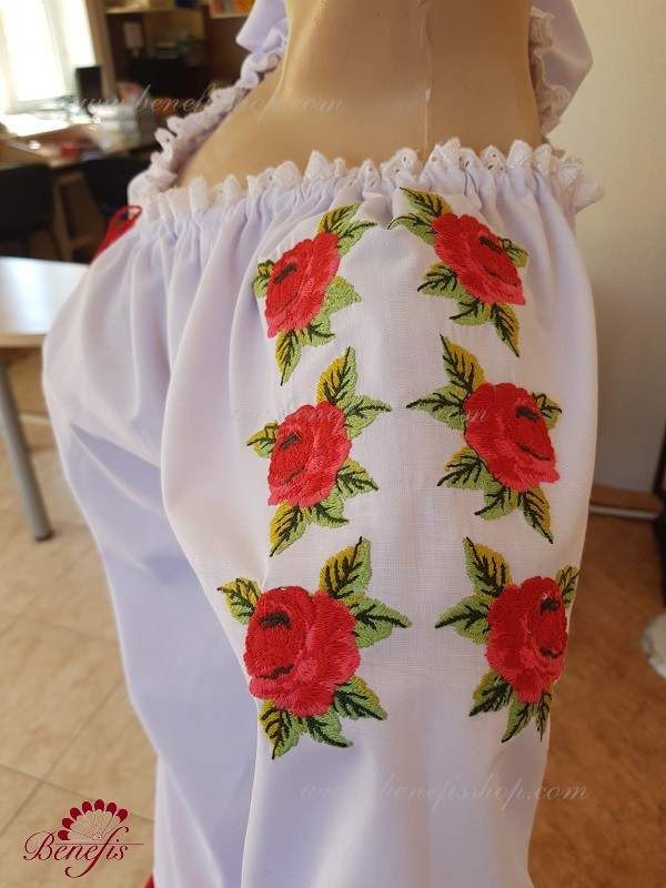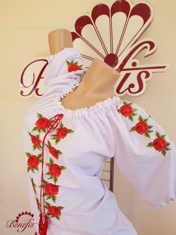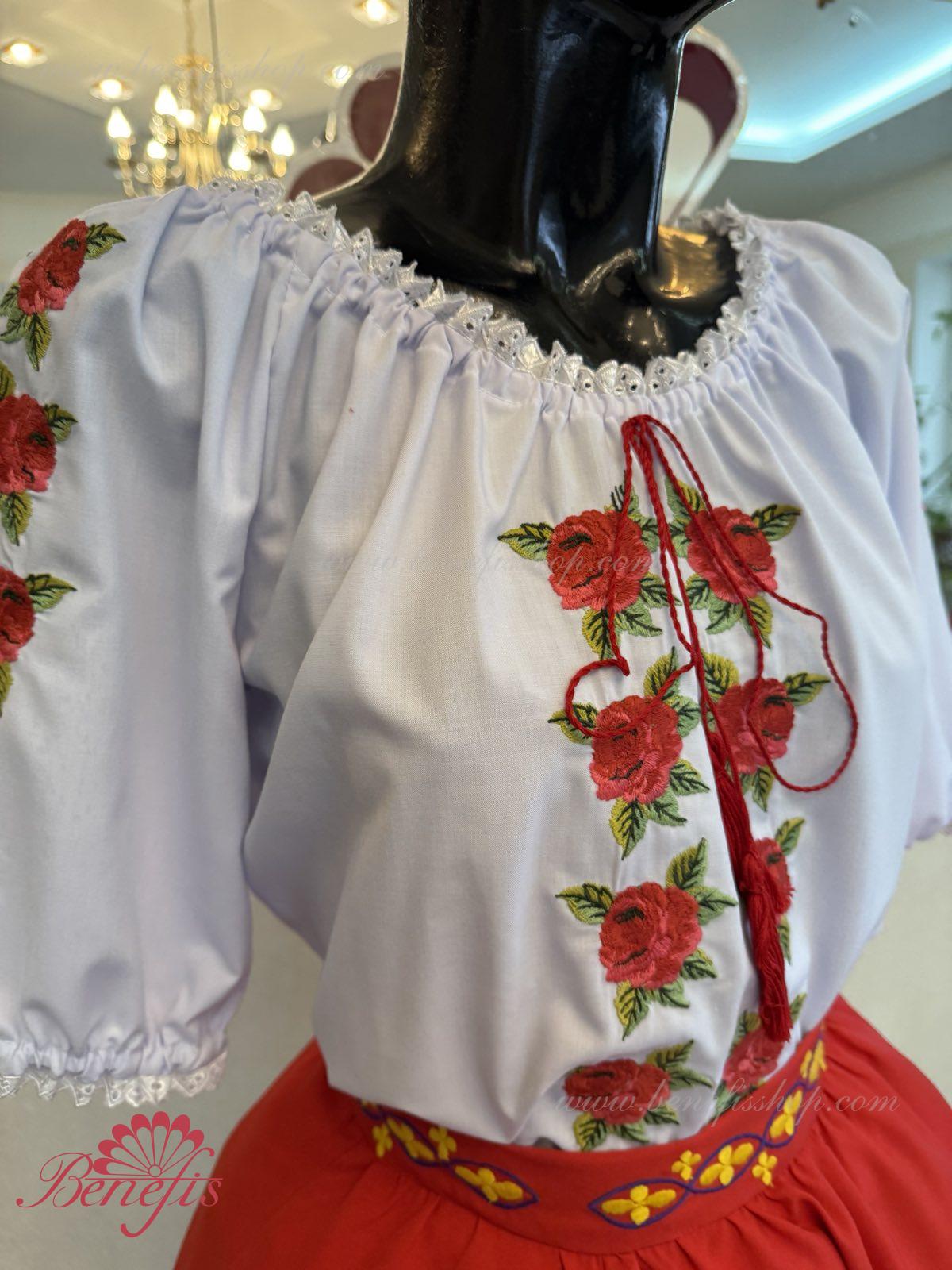 Блуза выполнена из сорочечной ткани. На горловине и рукавах вставлена резинка и от декорирована натуральным кружевом . Вышивка выполнена в национальном стиле на специальной машине. Юбка и пояс не входит в цену. В дополнение к блузке вы можете заказать юбку J0363,J0126 и пояс J0343 .